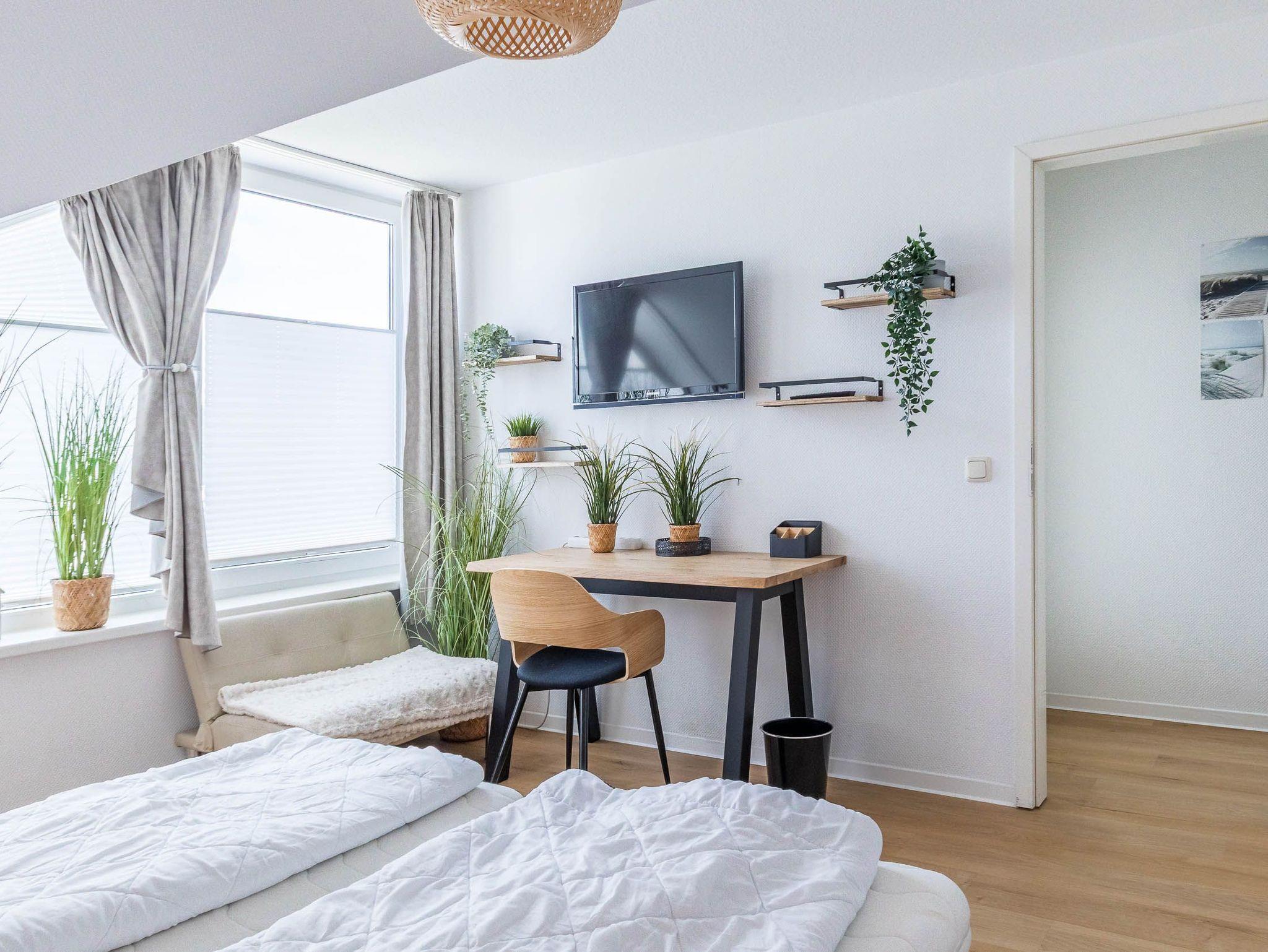 Das Schlafzimmer ist mit einem Doppelbett und TV ausgestattet. Im Kleiderschrank können Sie gern Ihre Urlaubsgarderobe ablegen.