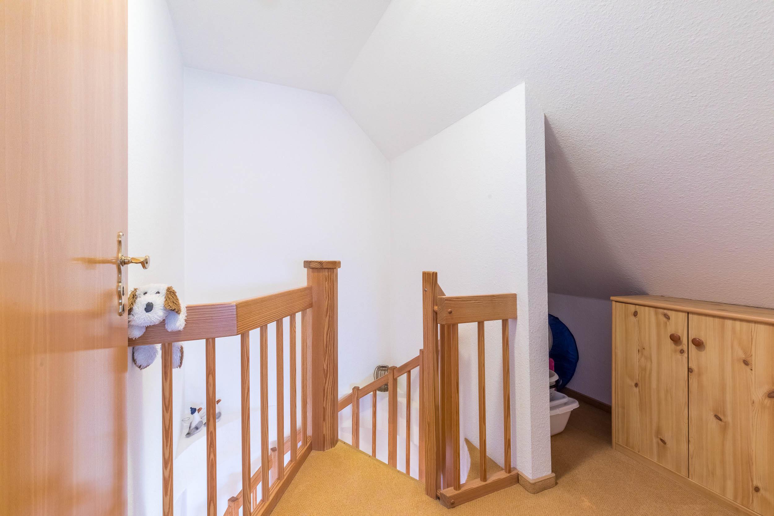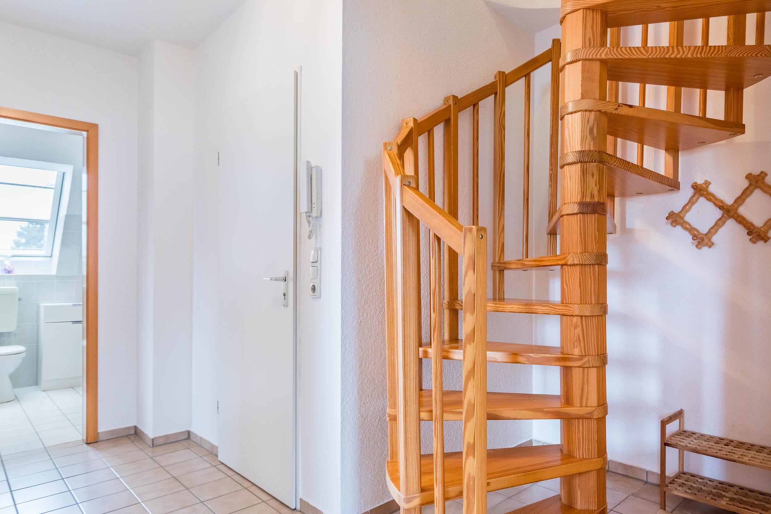 Eine Holztreppe/ Wendeltreppe vom Wohnungsflur führt Sie in das Dachgeschoss.