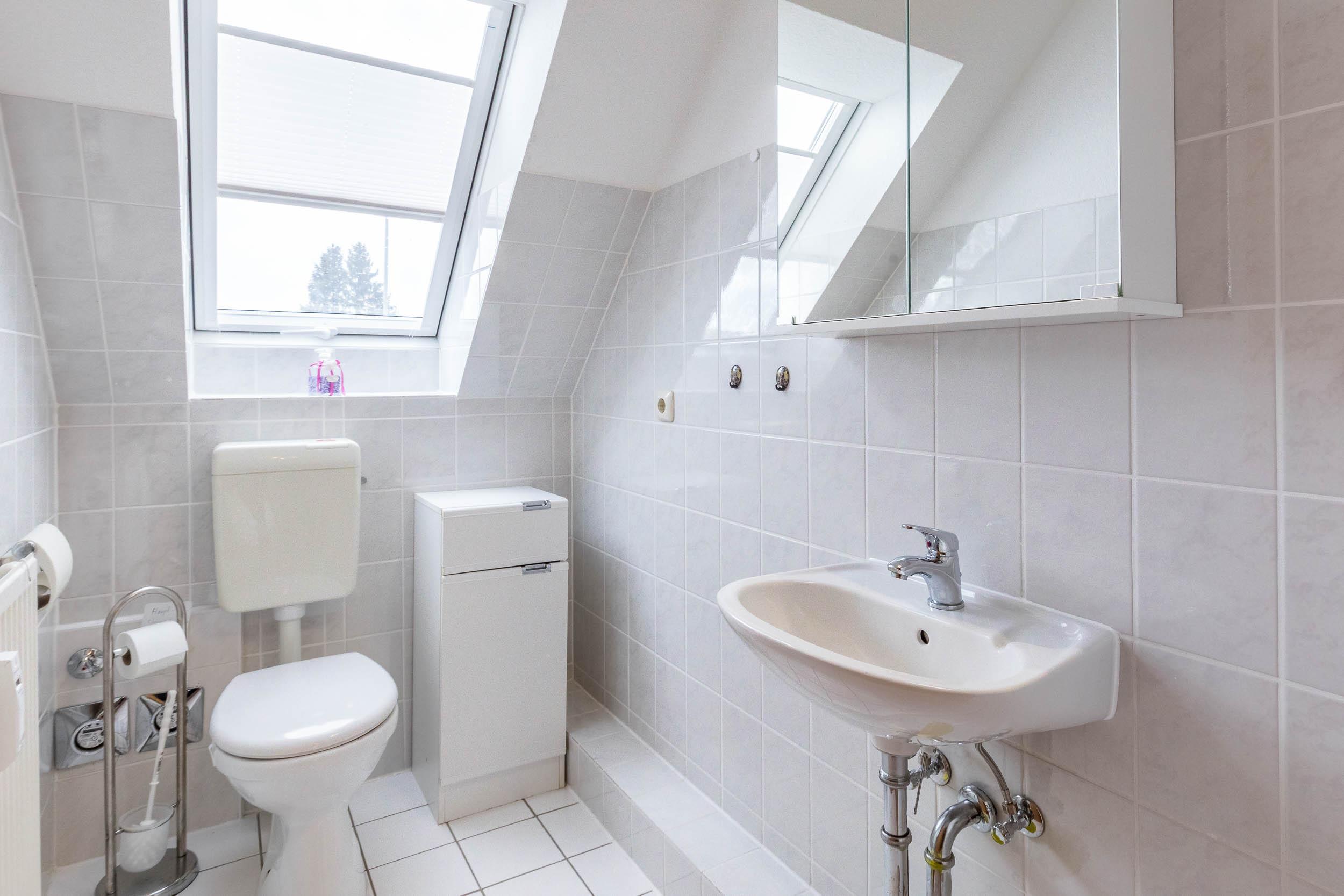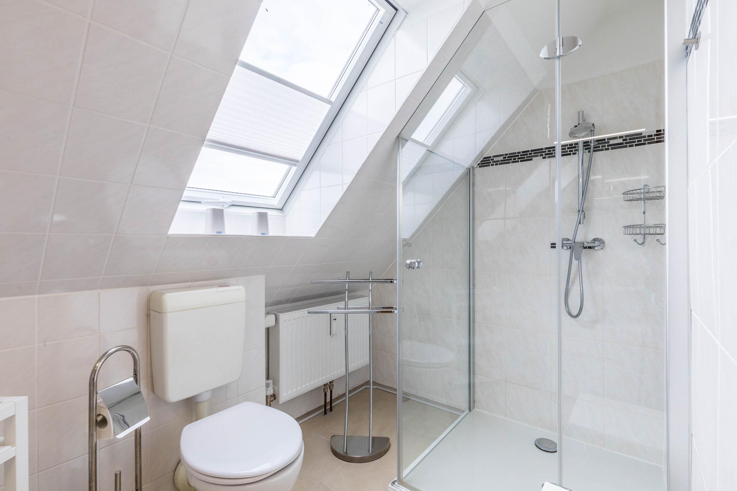 Auf dieser Etage finden Sie ebenso das großzügige, helle Badezimmer mit Dusche, Waschbecken und WC. Das Fenster bietet viel Tageslicht und hilft beim Lüften, z.B. nach dem Duschen.