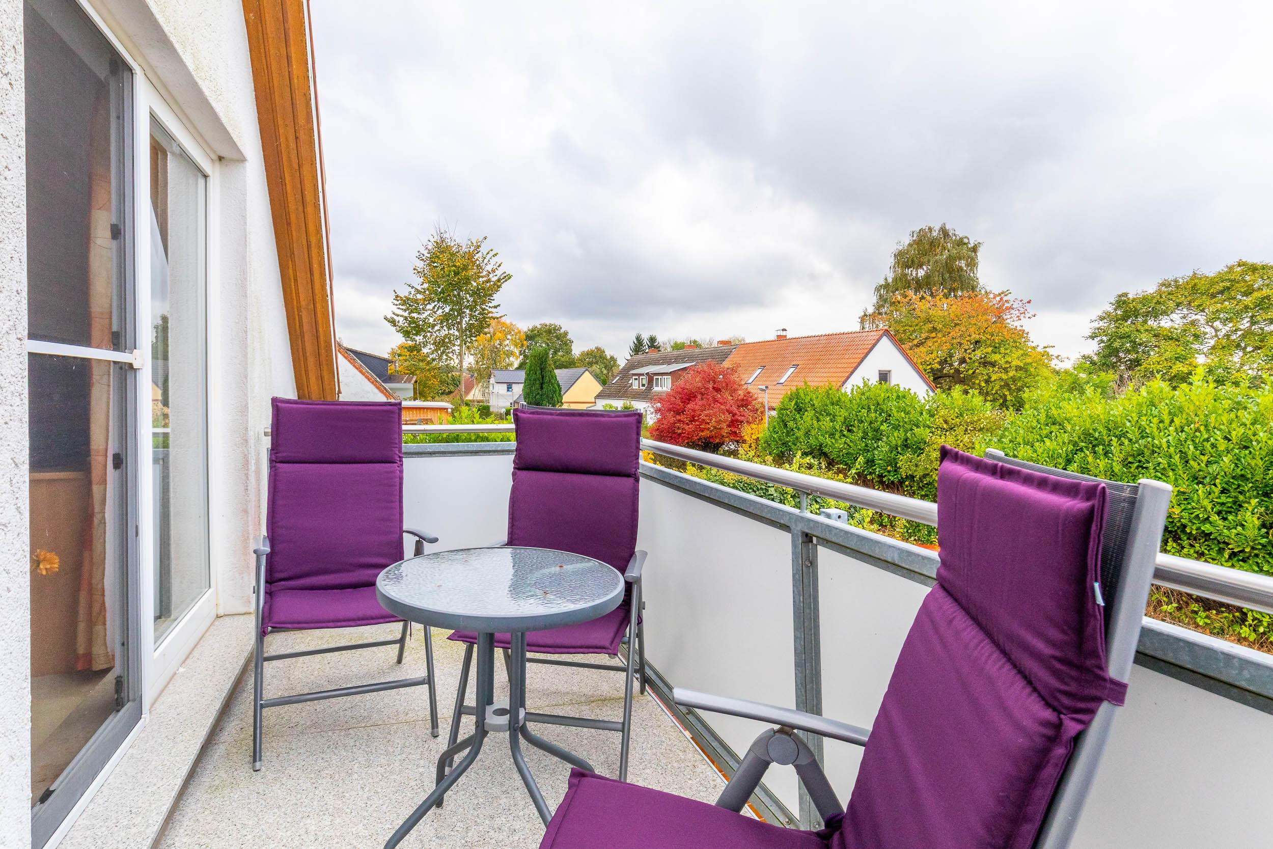 Der möblierte Westbalkon lädt zu einem Frühstück im Freien ein. Er ist bequem vom Wohnzimmer erreichbar.