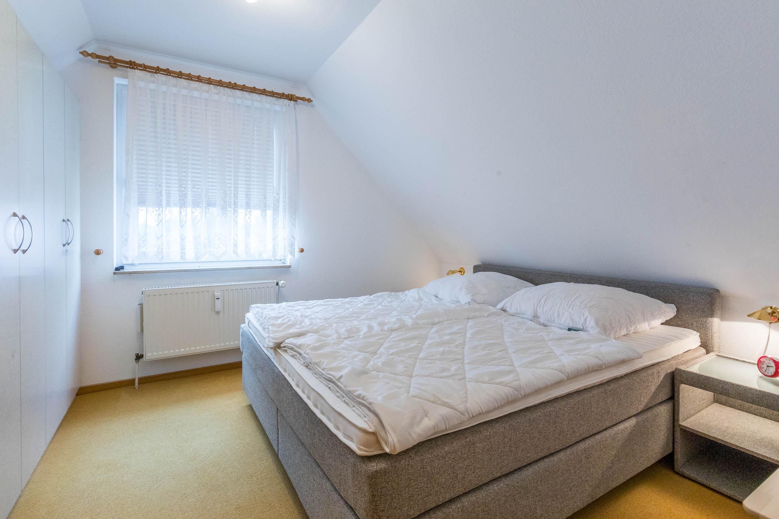 Das Schlafzimmer in der 2. Wohnebene, dem DG, ist mit einem Doppelbett (180x200cm/ Höhe 60cm) und einem großen Kleiderschrank eingerichtet.