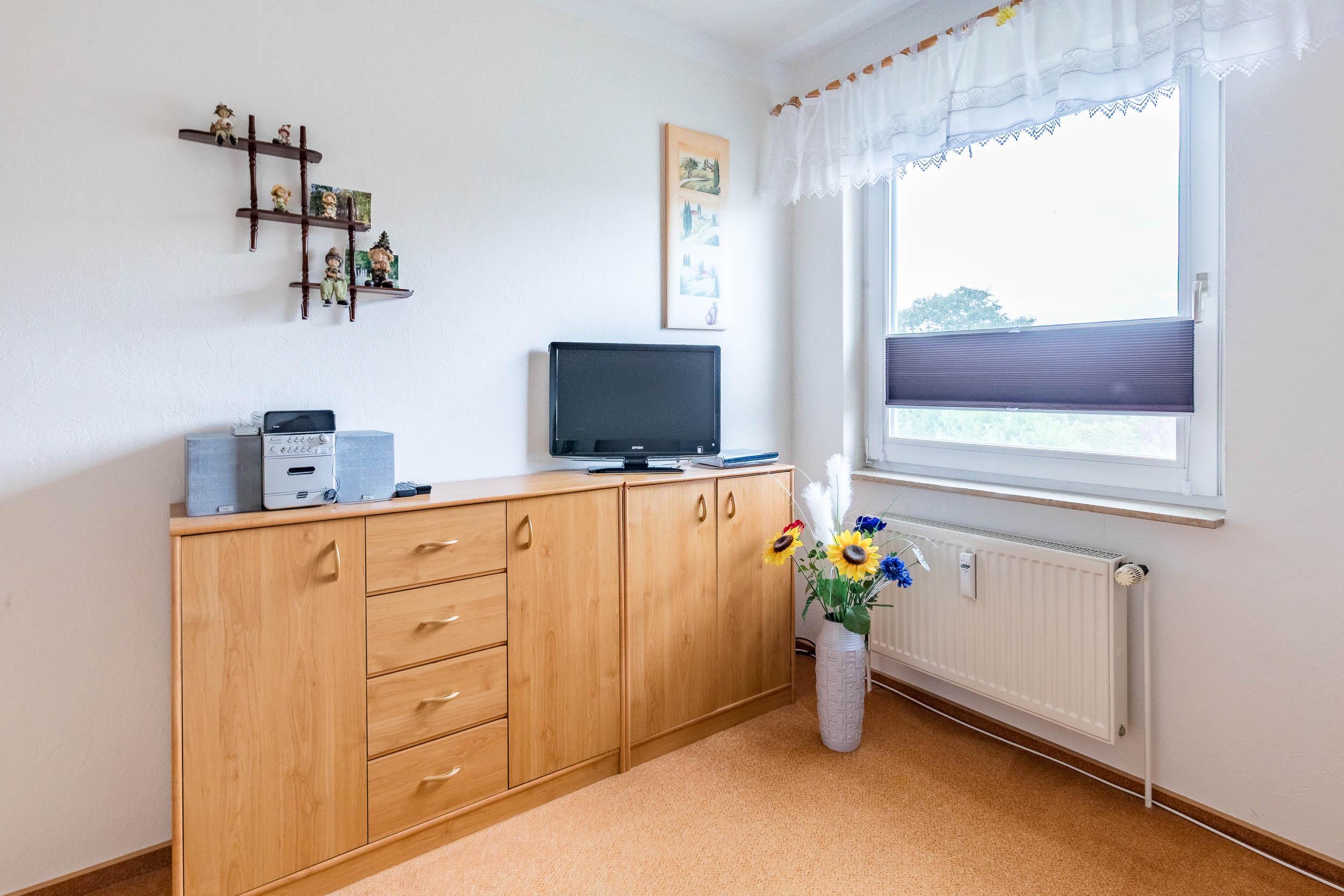 Weiterhin befindet sich in dieser Wohnebene das Kinder-/ Gästezimmer. Dieses ist mit einer ausziehbaren Schlafcouch (Liegefläche 160x200cm/ Höhe 42cm) für 2 Personen, Schreibtisch, kleinem TV und Mini-Stereoanlage ausgestattet.