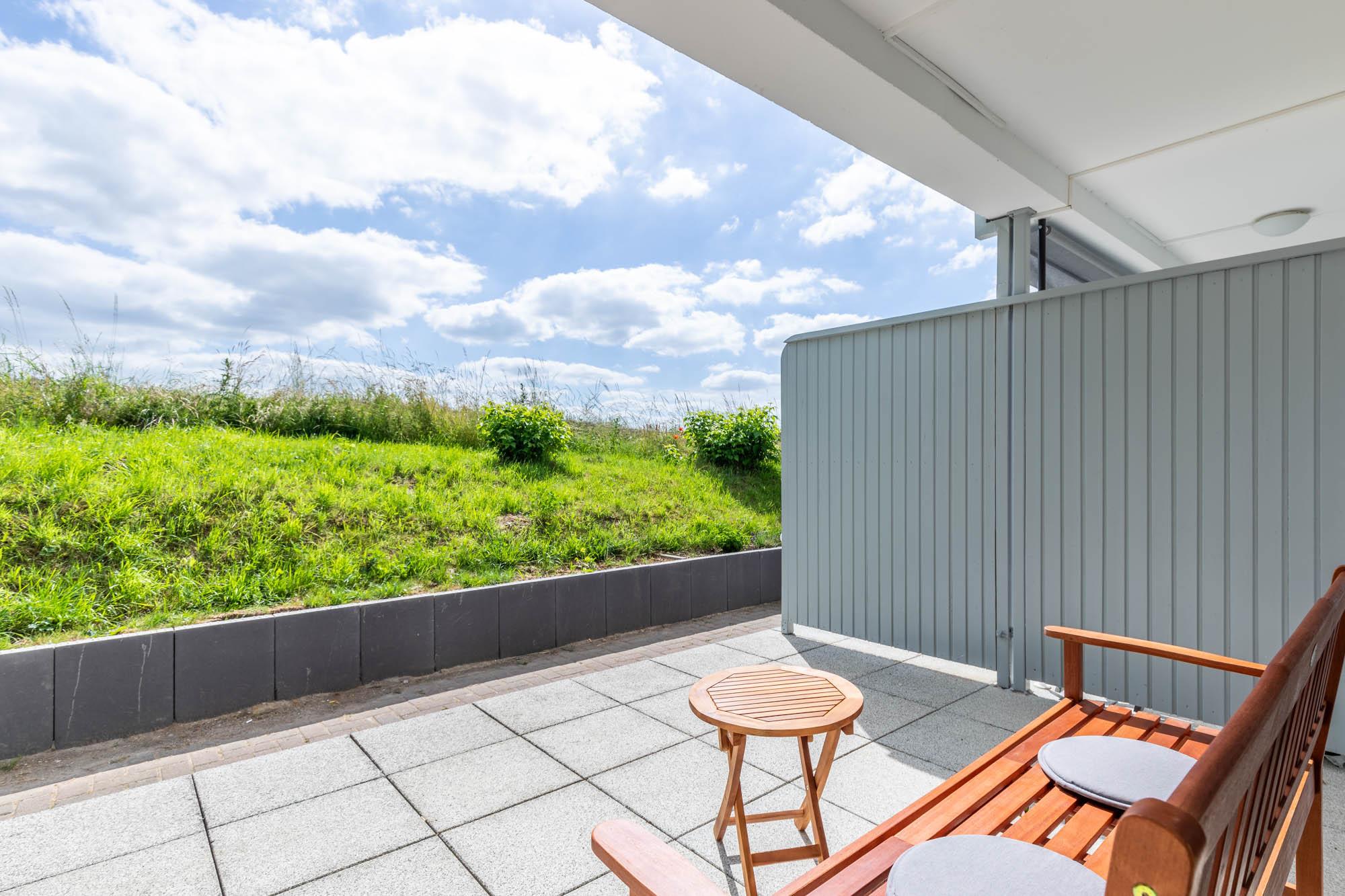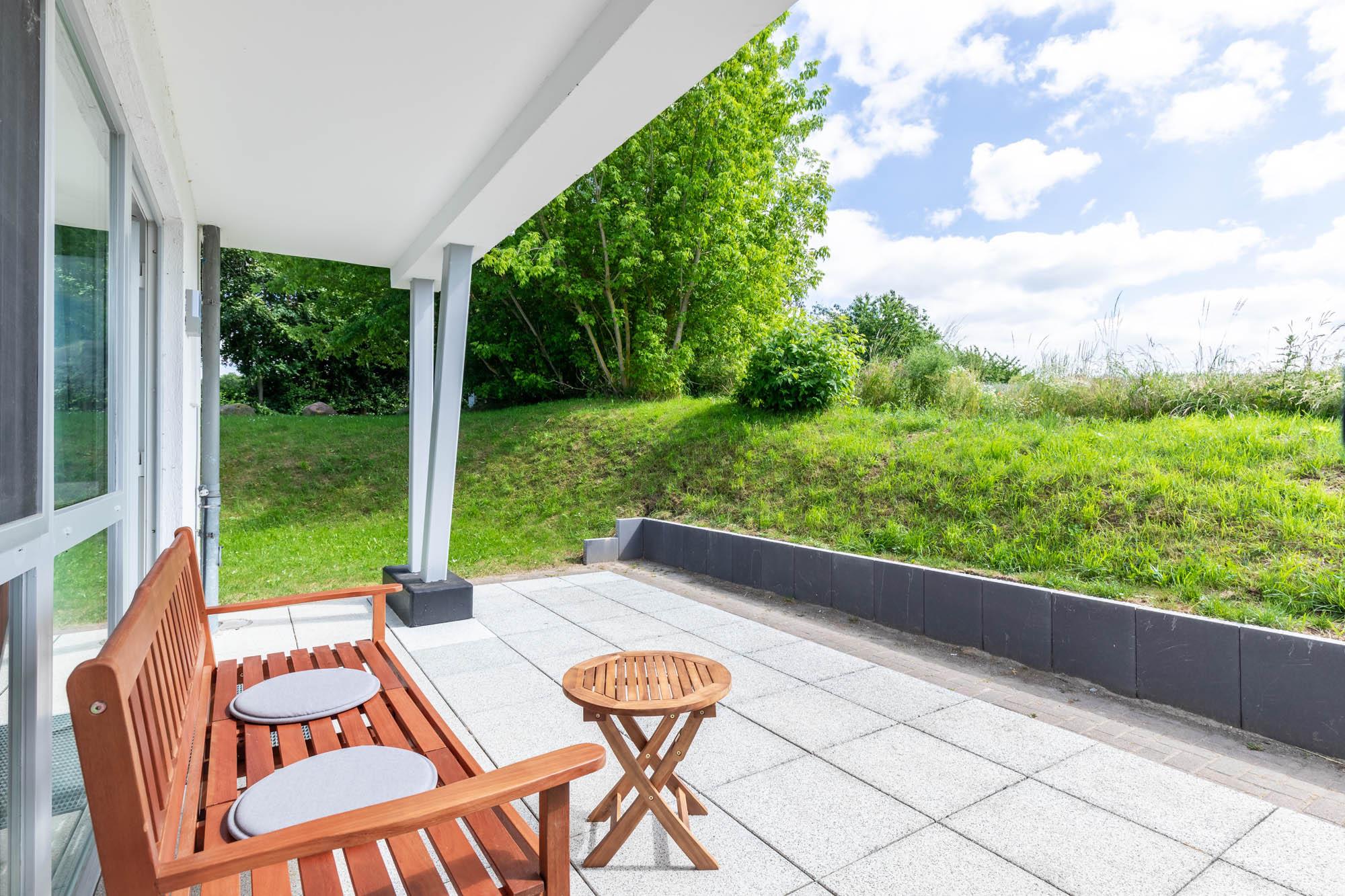 Genießen Sie die Aussichten auf beiden möblierten Terrassen: vom Wohnzimmer aus begehen Sie die Nord-Terrasse zur Ostsee, vom Schlafzimmer begehen Sie die Südterrasse mit Blick ins Grüne.