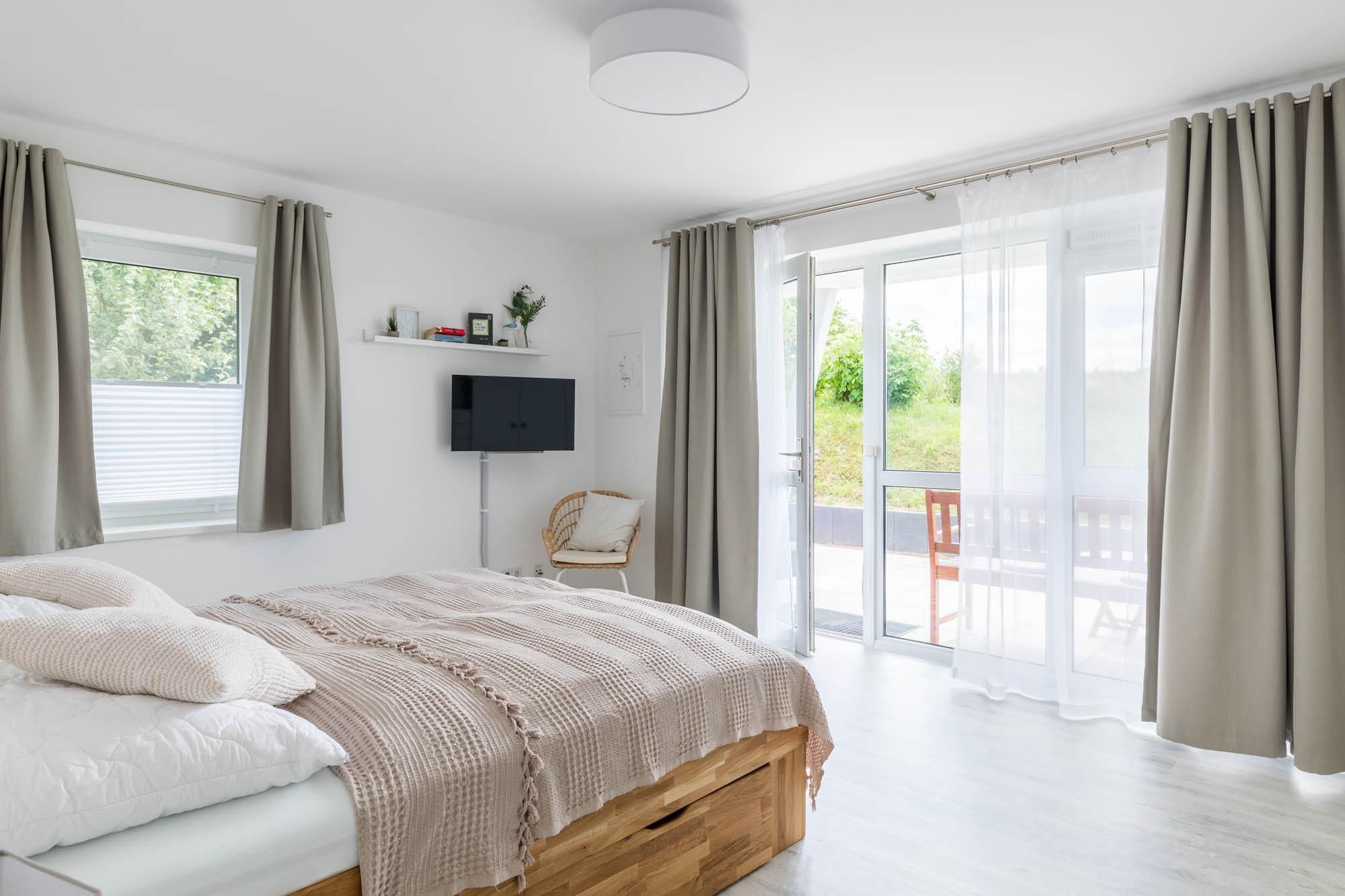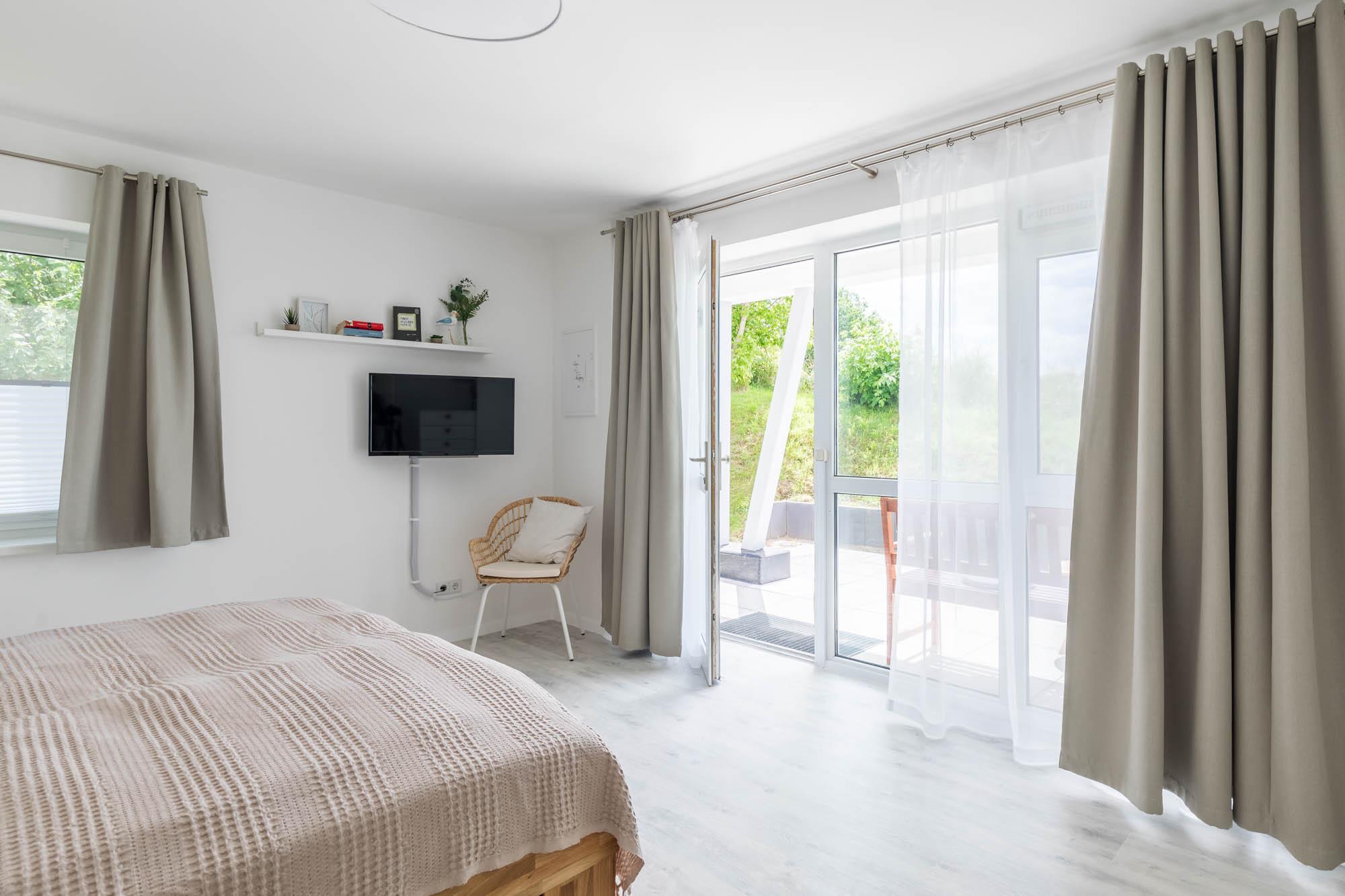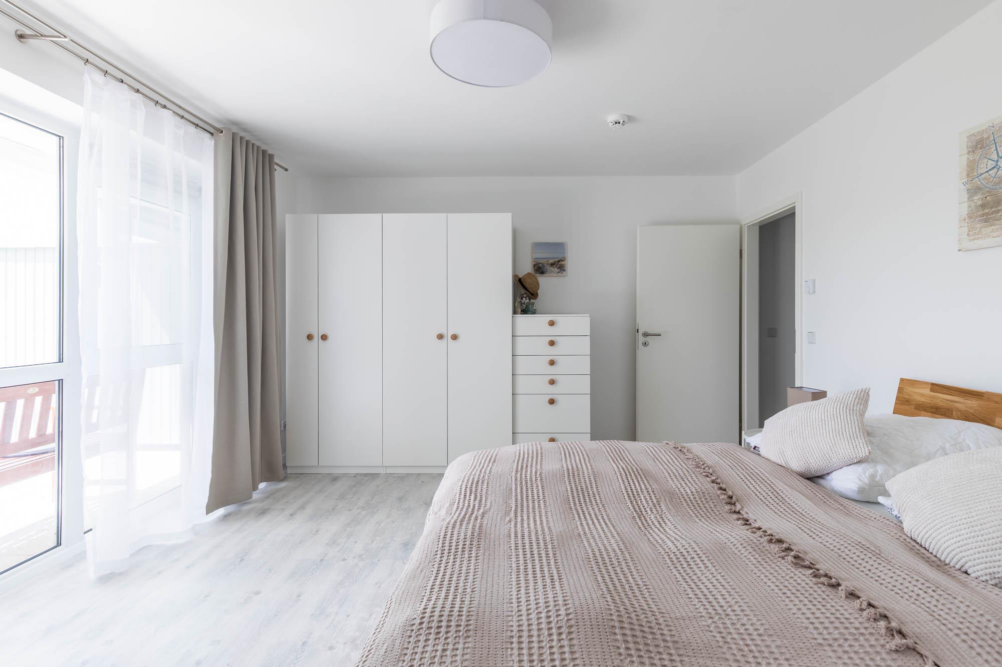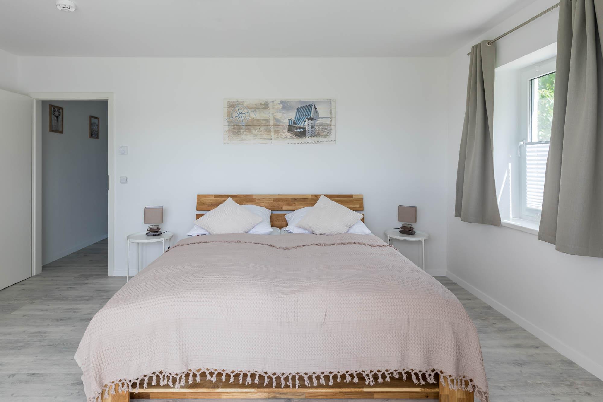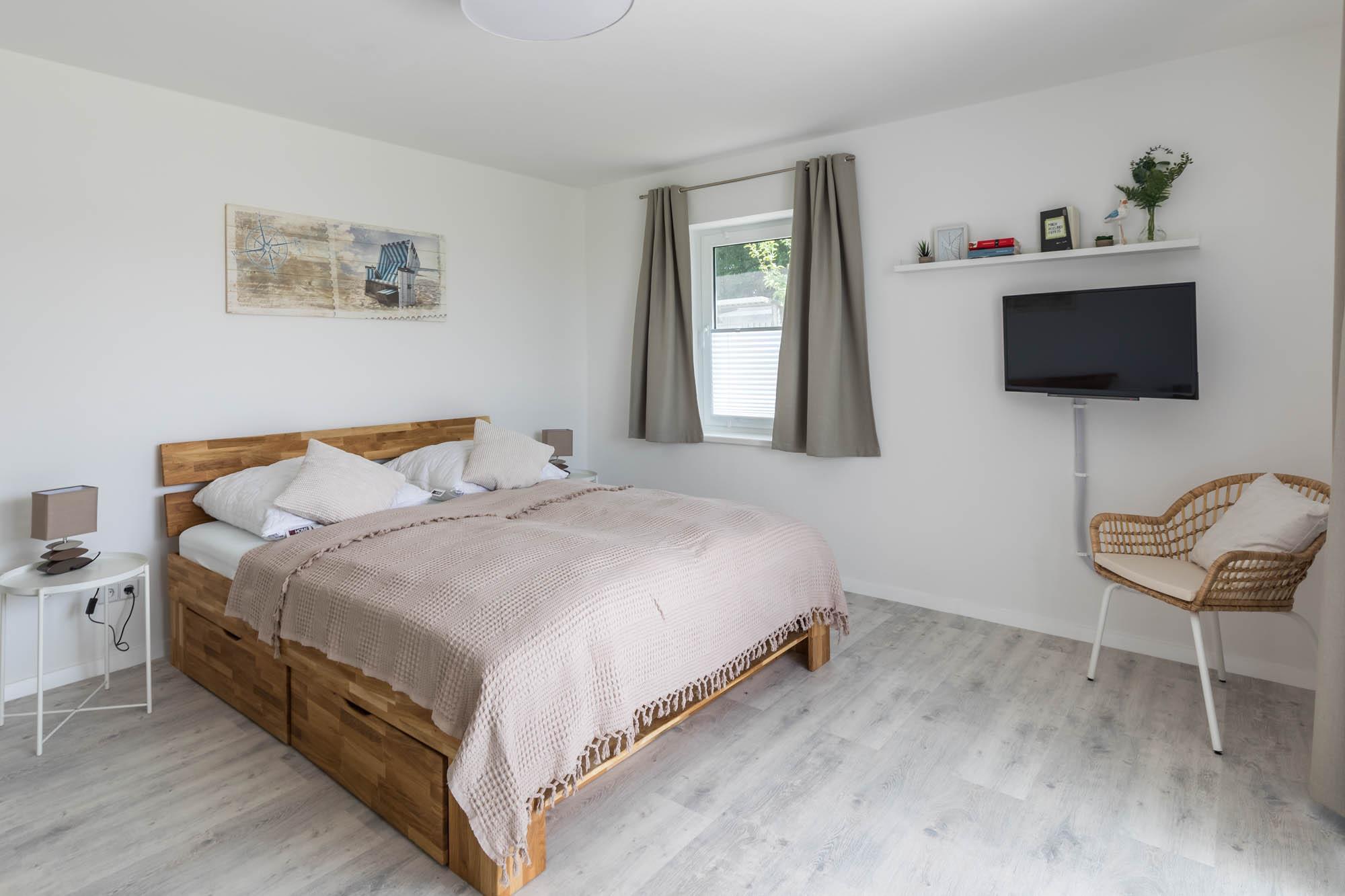 Im modernen Schlafzimmer wartet ein gemütliches Doppelbett auf Sie. Ihre Urlaubsgarderobe können Sie gern im Kleiderschrank sowie in der Kommode ablegen. Vom Bett aus können Sie auch in diesem Zimmer gemütlich fernsehen.