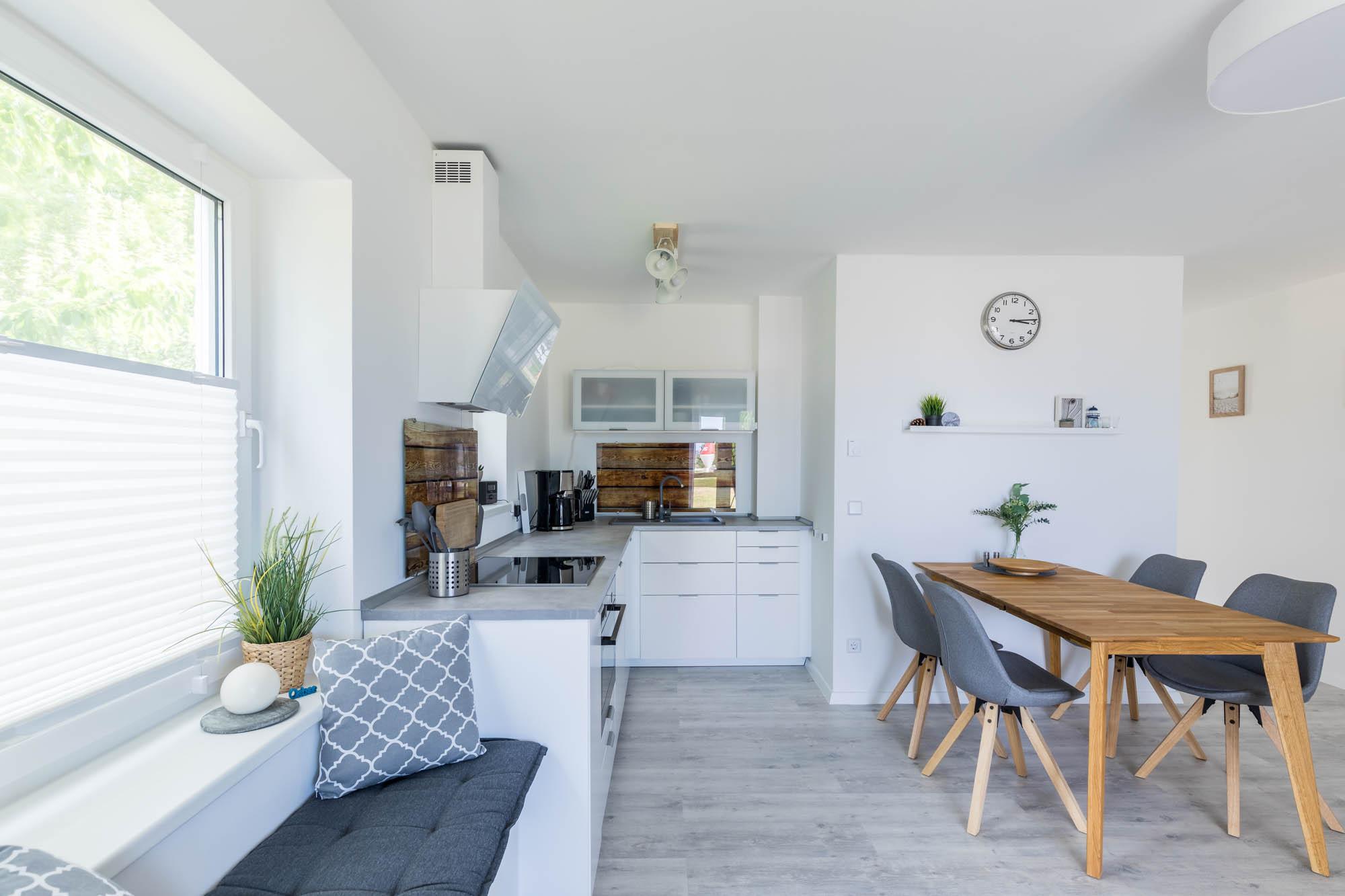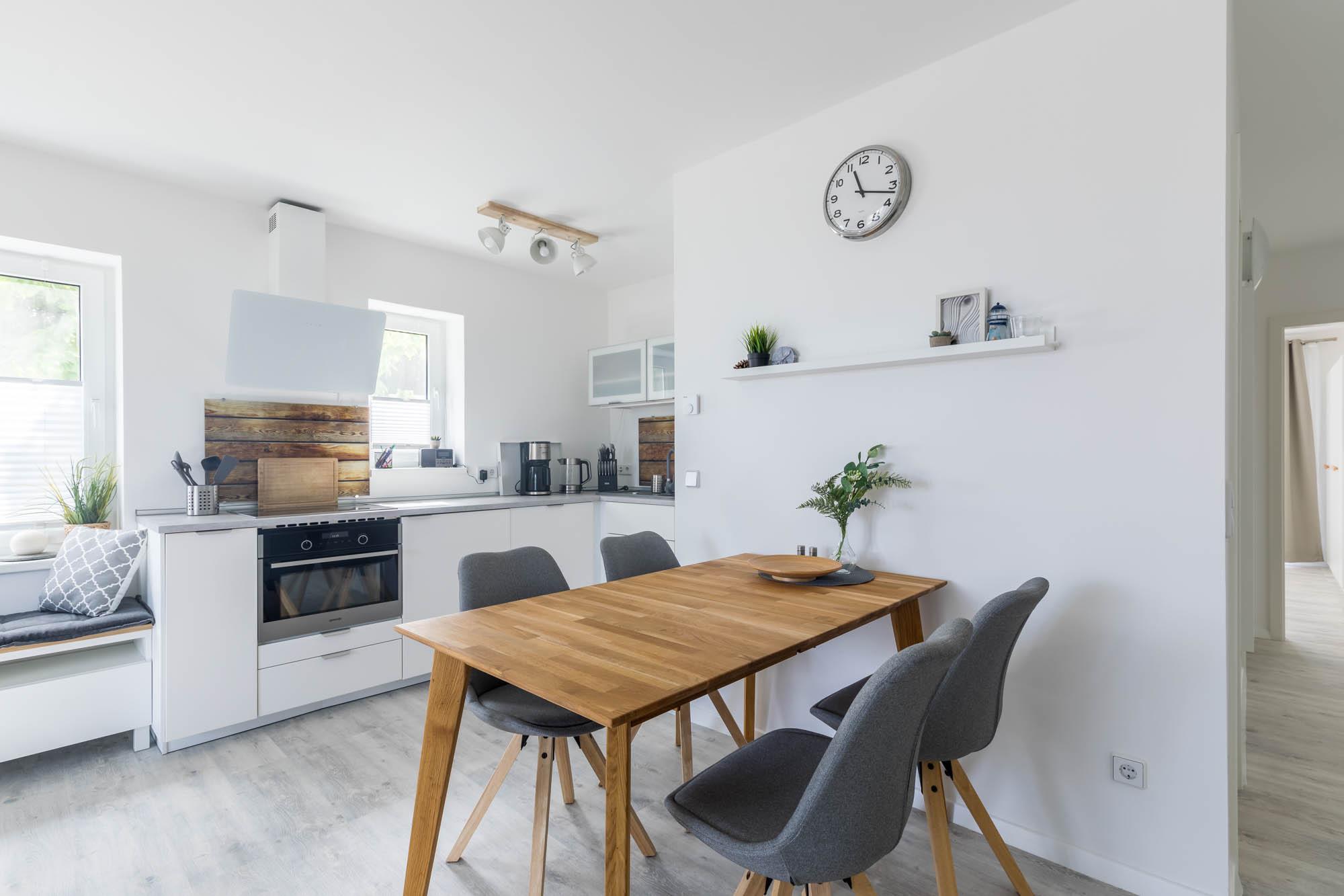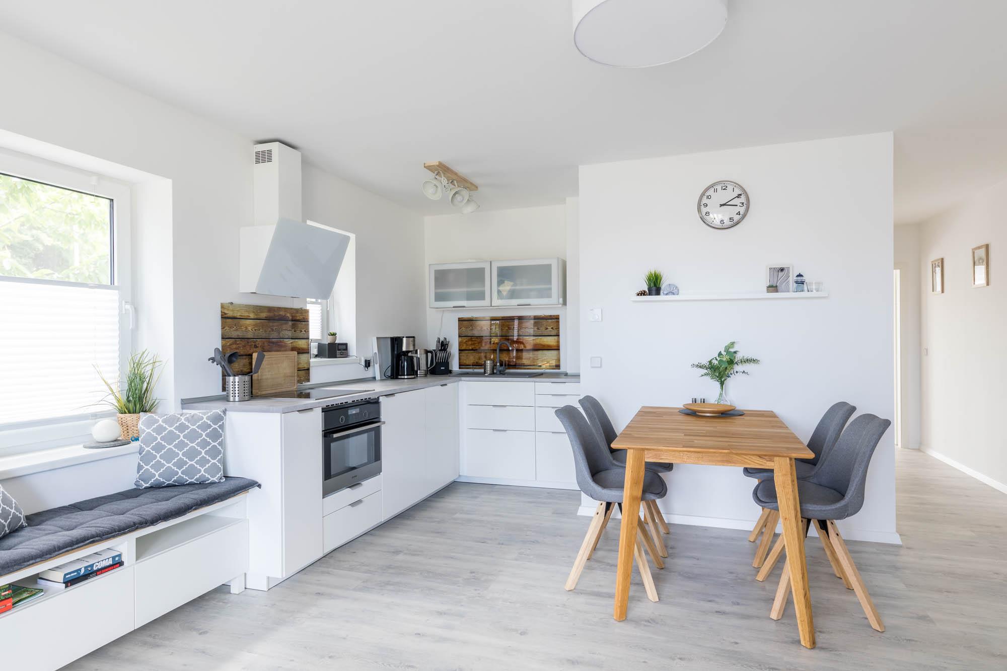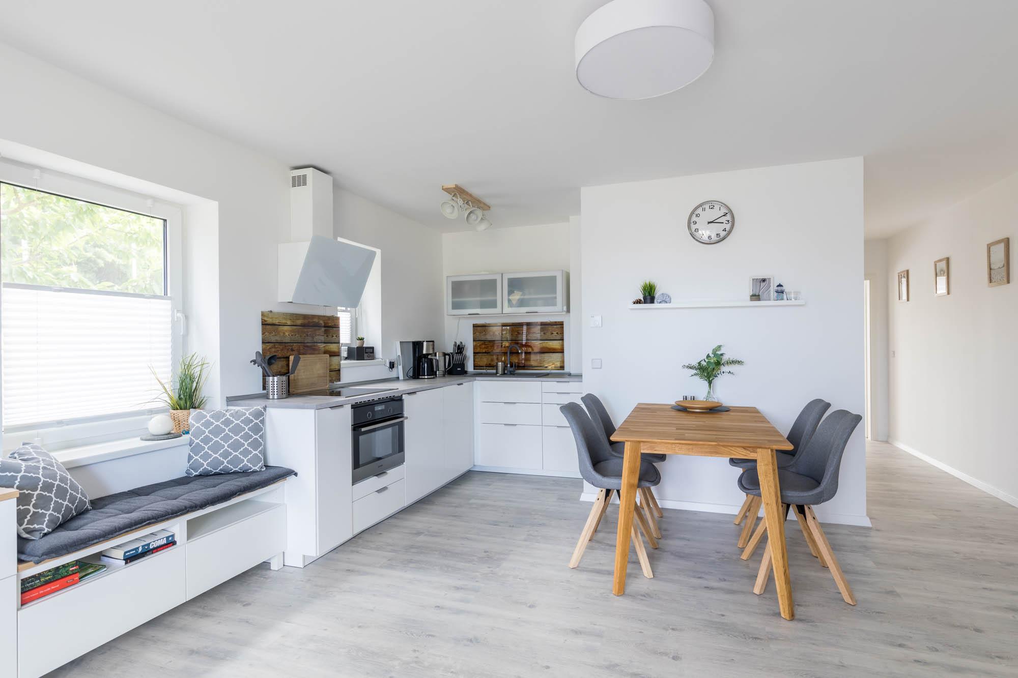 In der komfortablen offenen Küchenzeile finden Sie eine hervorragende Ausstattung für eine Selbstverpflegung. Geschirrspüler, Backofen, Herd mit Cerankochfeld, Kühlschrank sowie sämtliche Kleingeräte gehören hier zum Inventar.