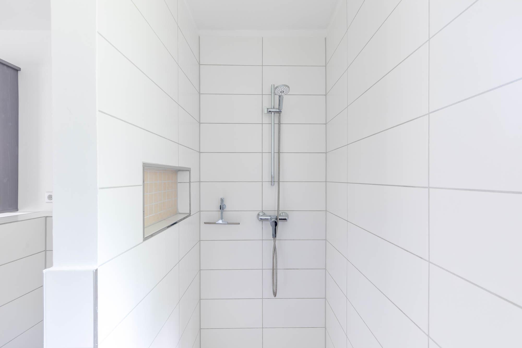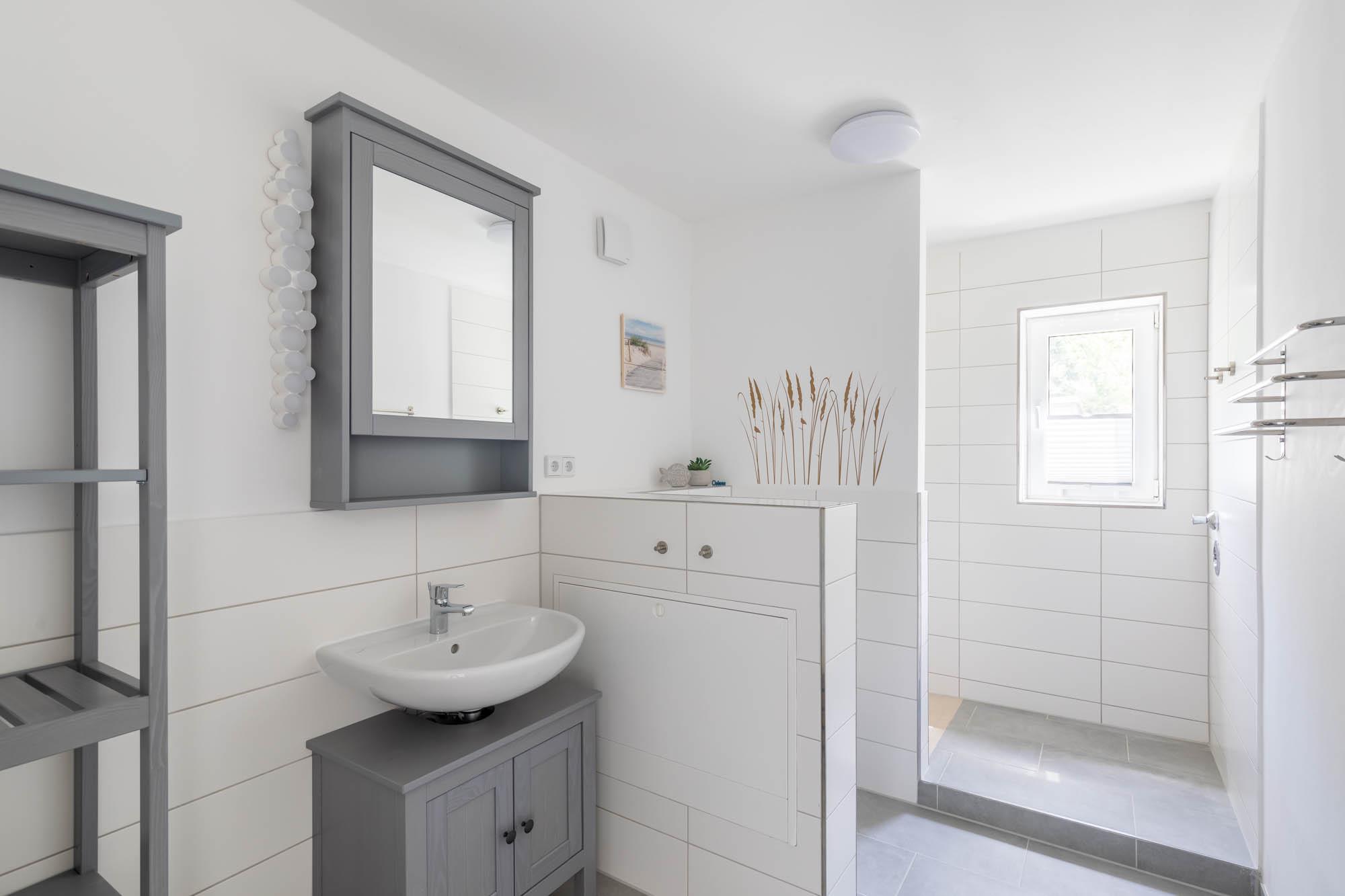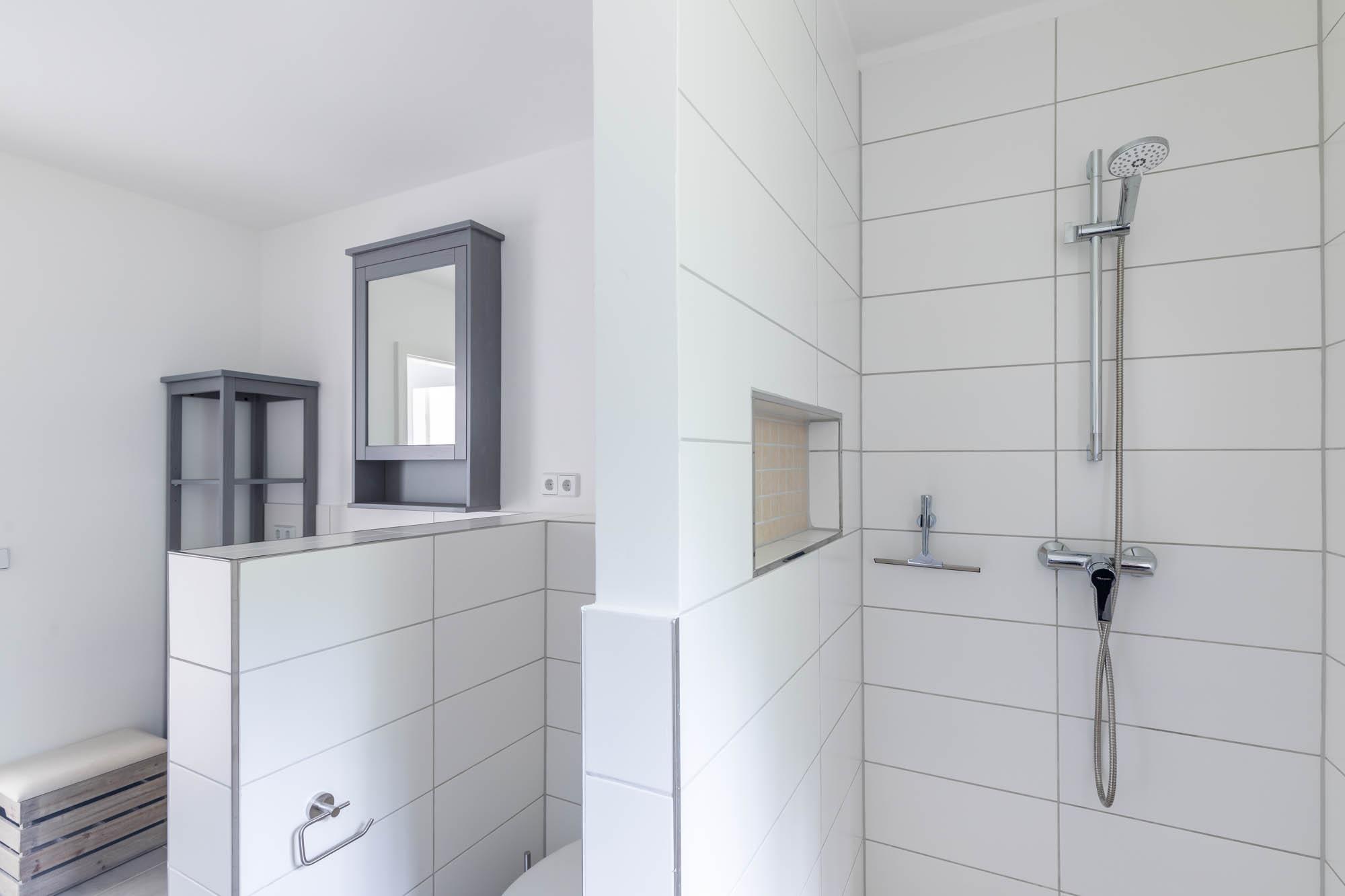 Das hell geflieste große Bad mit Fenster ist mit Dusche und WC ausgestattet.