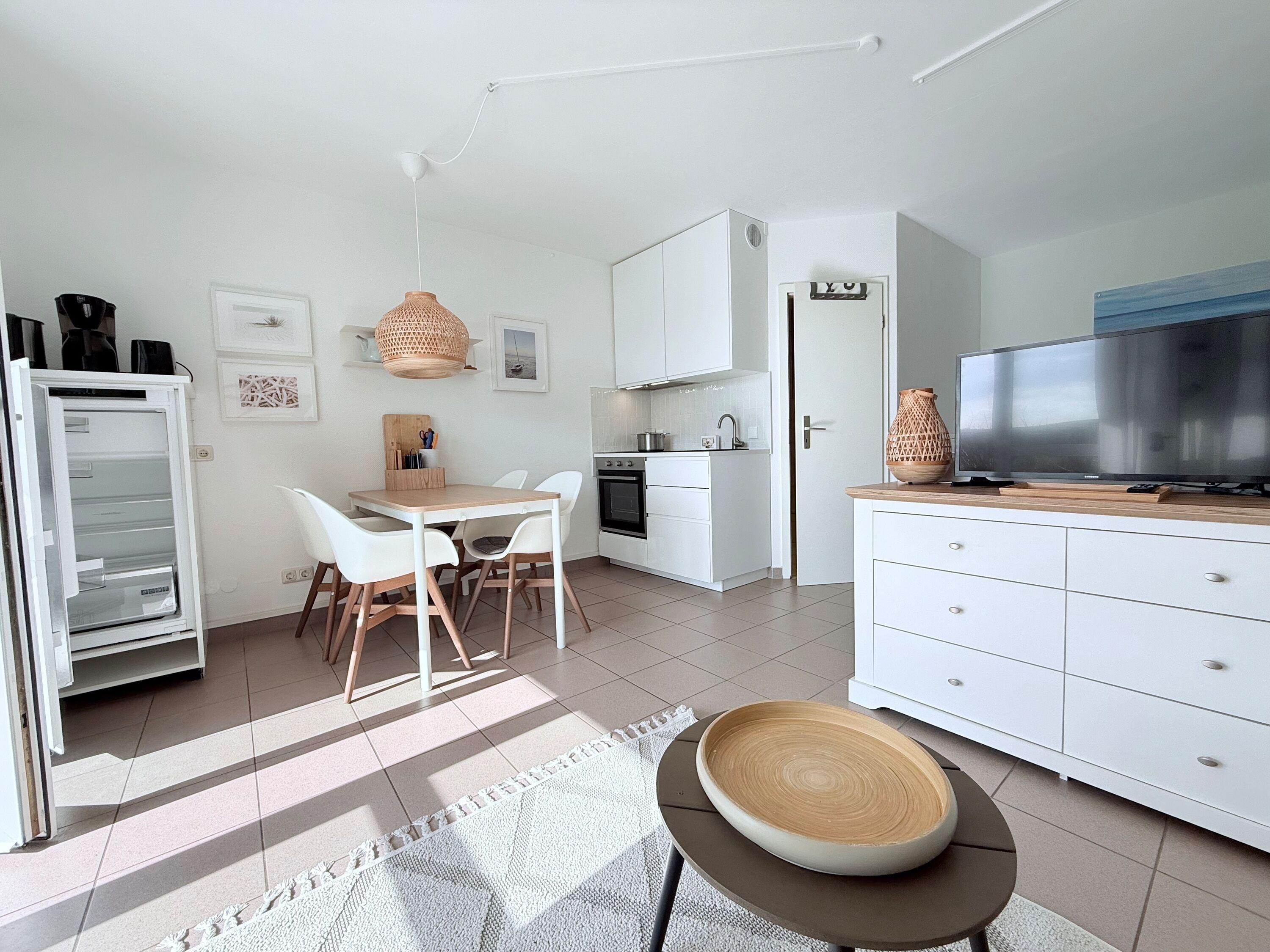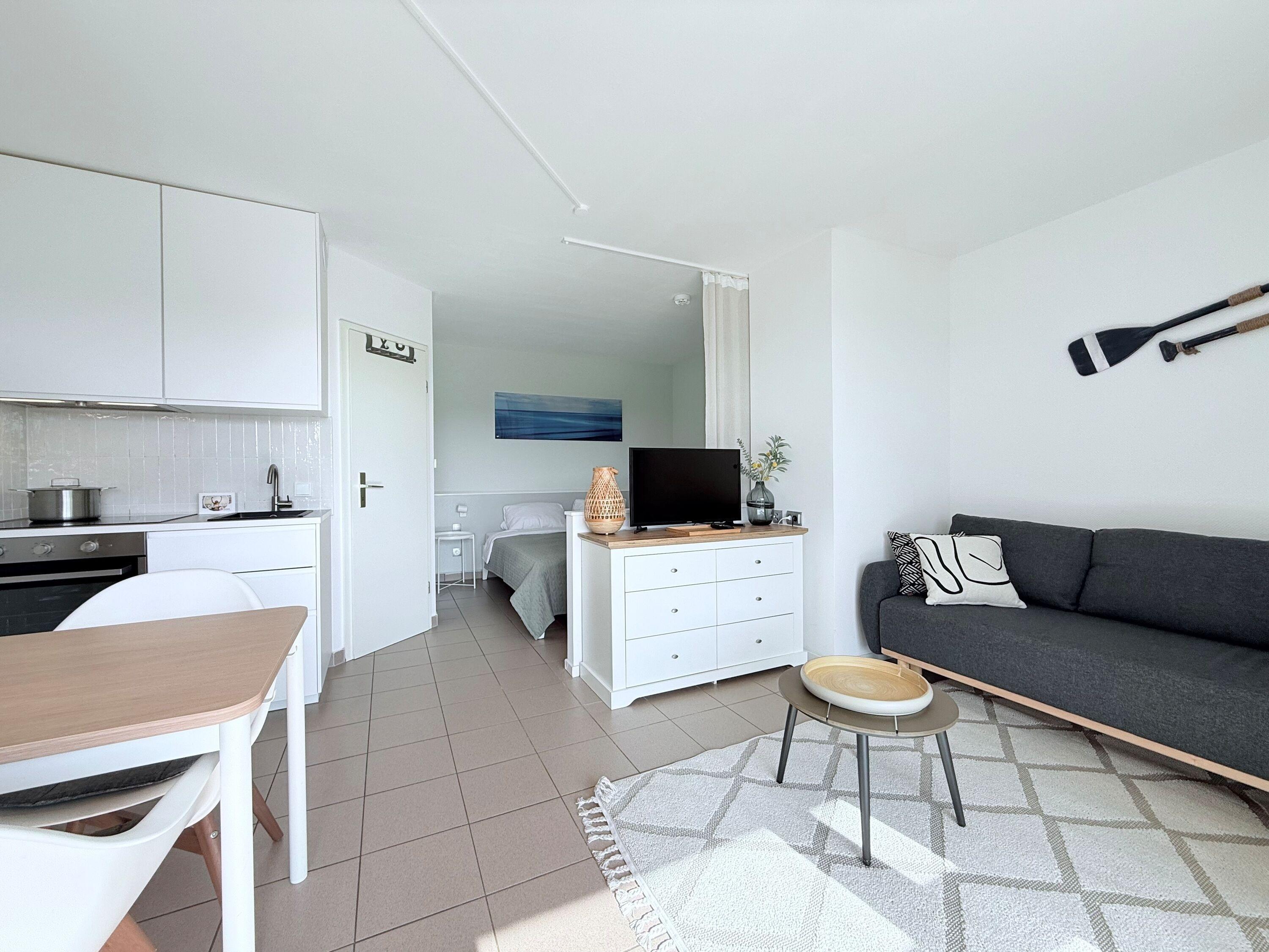 Wohn- und Schlafbereich sind offen miteinander verbunden, eine kleine Singleküche mit angeschlossener Essecke reihen sich hervorragend ein. Die gemütliche Einrichtung sorgt mit ihren modernen Farben für herrliche Urlaubsstimmung. Der Flatscreen-TV befindet sich mittig zwischen dem Wohnbereich und Schlafbereich. Die bequeme Couch bietet bei Bedarf eine dritte Schlafmöglichkeit.