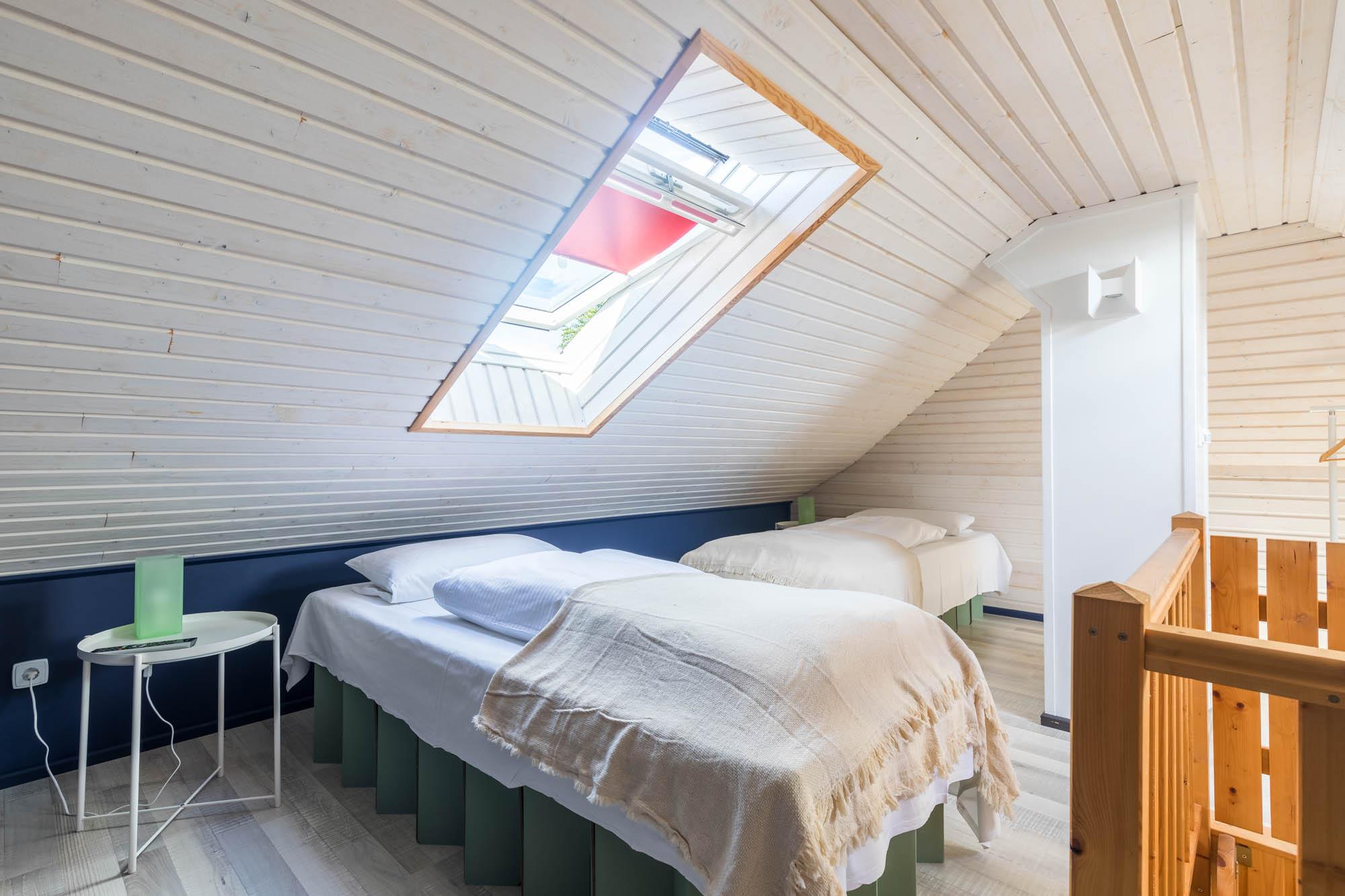 Vom Wohnbereich aus gelangen Sie über eine Raumspartreppe ins offene Dachgeschoss. Dieser Bereich ist eher für größere Kinder geeignet, aber die Einzelbetten können auch von Erwachsenen genutzt werden. Ein eigener Flatscreen-TV an der Wand sorgt auch auf dieser Etage für Unterhaltung. Auch hier können auf einer Kleiderstange ein Teil der Urlaubsgarderobe aufbewahrt werden.
