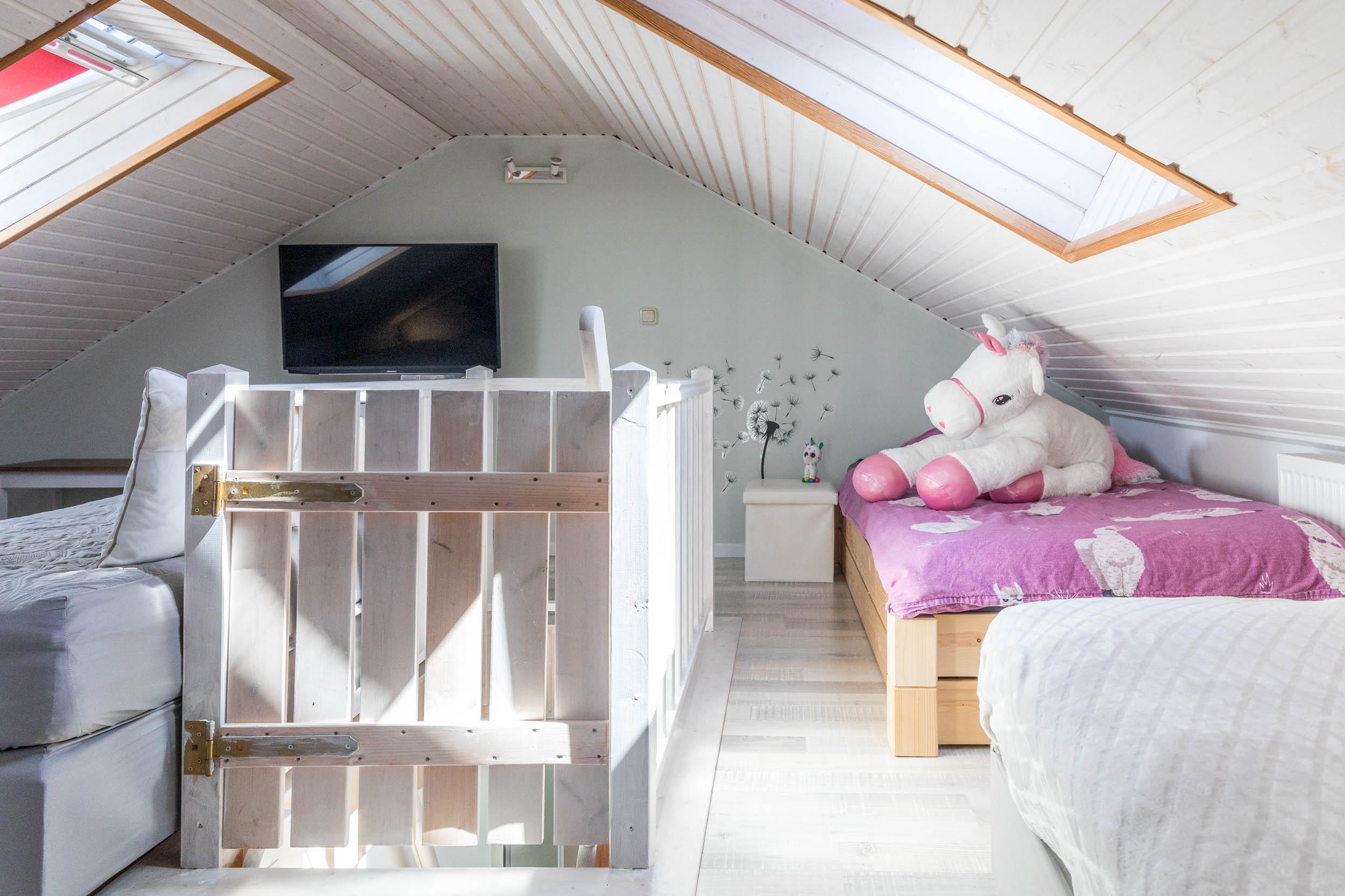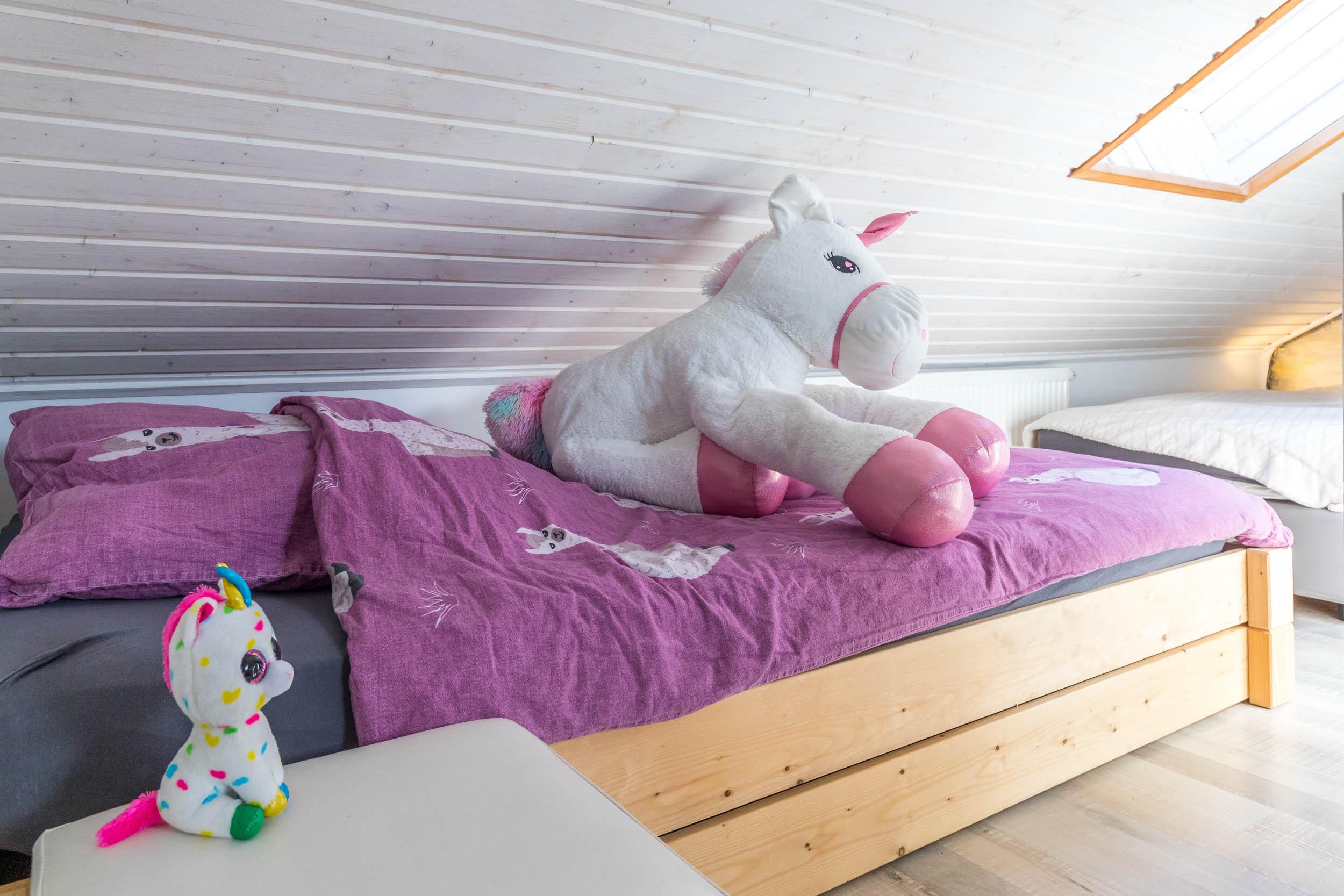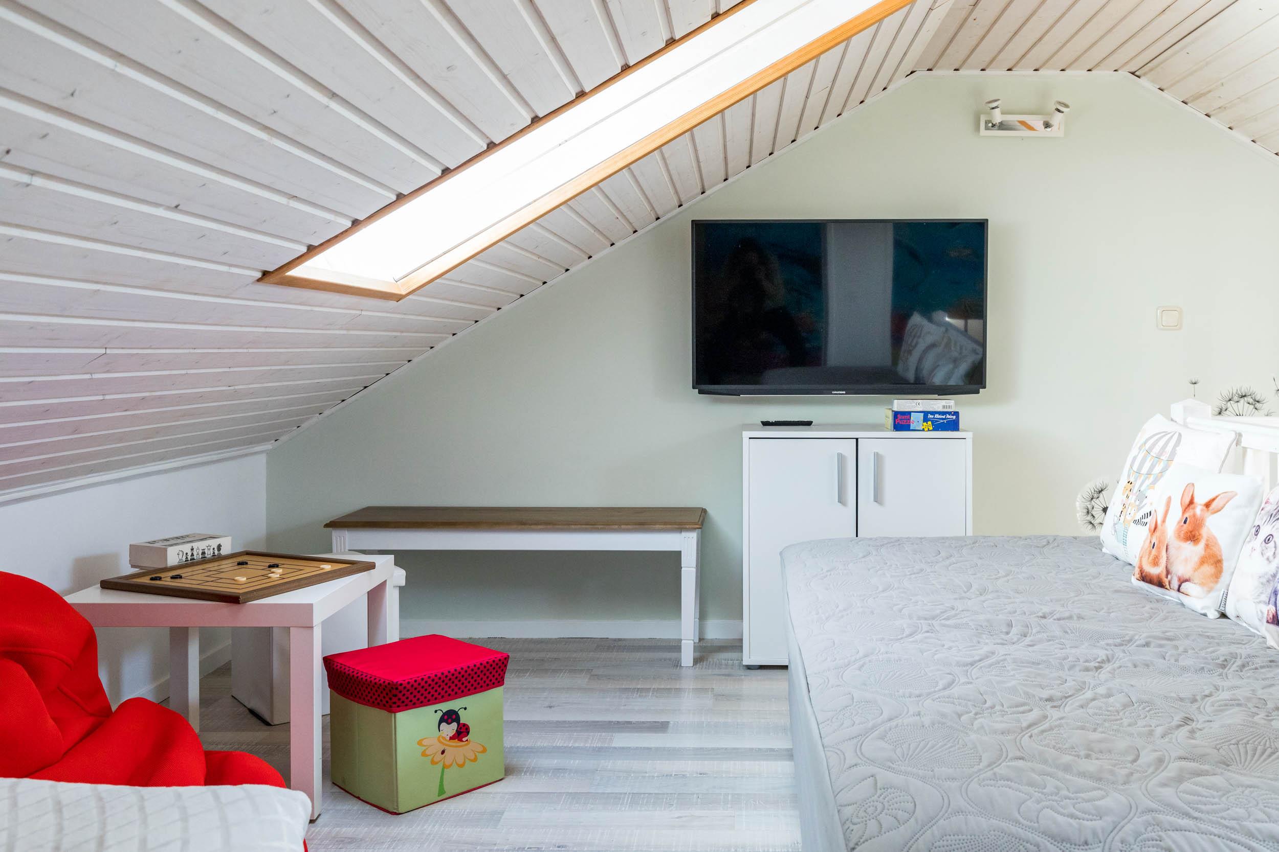 Das Schlafzimmer ist mit einem Doppelbett und einem geräumigen Kleiderschrank ausgestattet. Außerdem ist ausreichend Platz für das Babybett. Vom Wohnbereich aus gelangen Sie über eine Raumspartreppe ins offene Dachgeschoss. Dieser Bereich ist eher für größere Kinder geeignet. Hier stehen 3 Einzelbetten und ein Sofa bereit. Ein eigener Flatscreen-TV an der Wand sorgt auch auf dieser Etage für Unterhaltung.