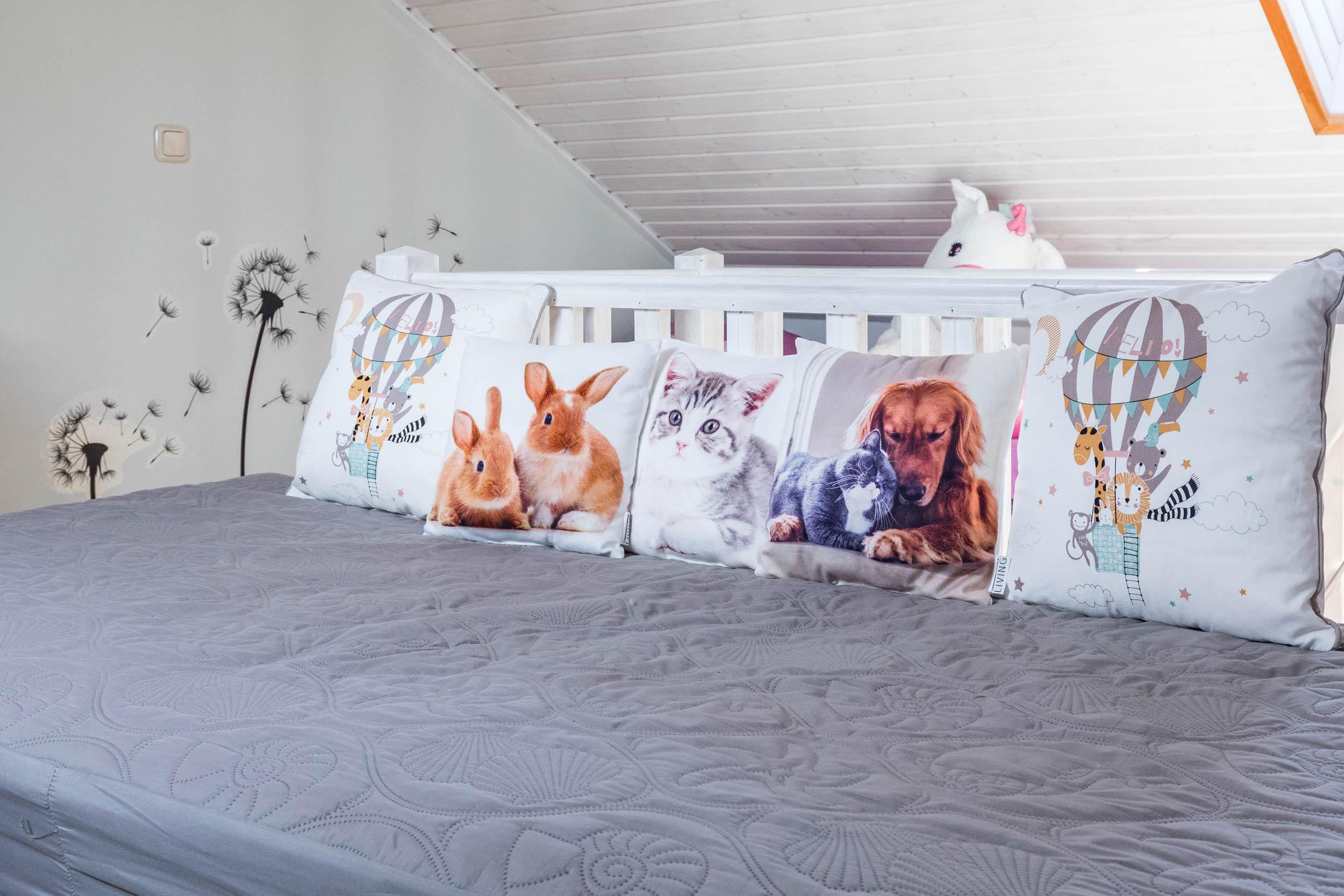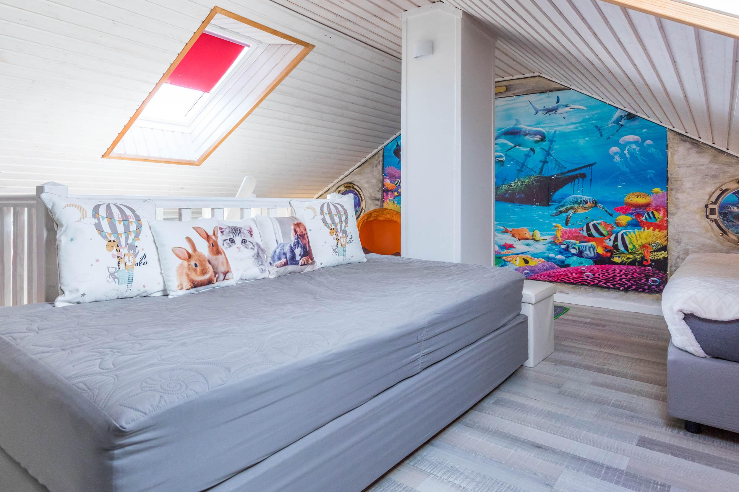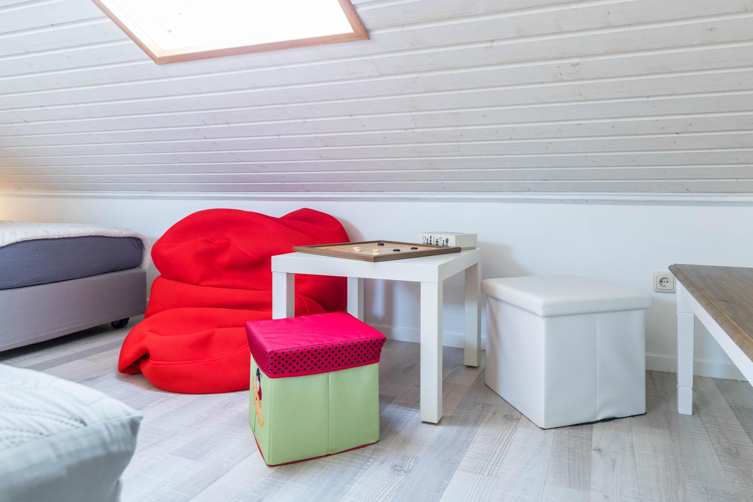 Das Schlafzimmer ist mit einem Doppelbett und einem geräumigen Kleiderschrank ausgestattet. Außerdem ist ausreichend Platz für das Babybett. Vom Wohnbereich aus gelangen Sie über eine Raumspartreppe ins offene Dachgeschoss. Dieser Bereich ist eher für größere Kinder geeignet. Hier stehen 3 Einzelbetten und ein Sofa bereit. Ein eigener Flatscreen-TV an der Wand sorgt auch auf dieser Etage für Unterhaltung.