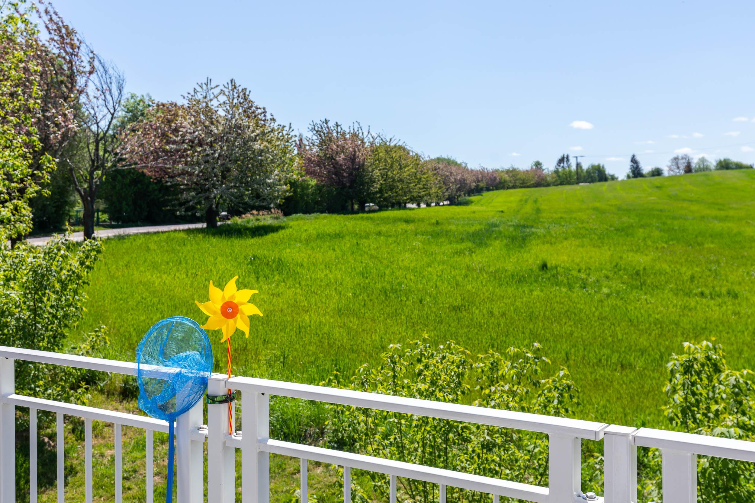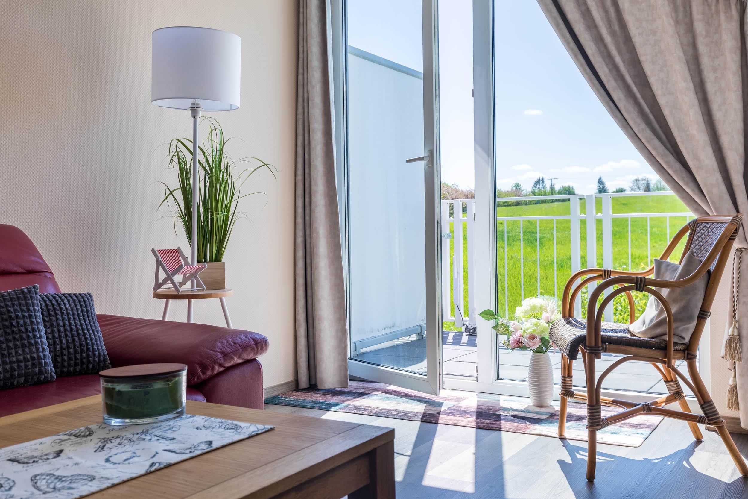 Von hier aus begehen Sie auch den möblierten Südbalkon mit Blick ins Grüne.