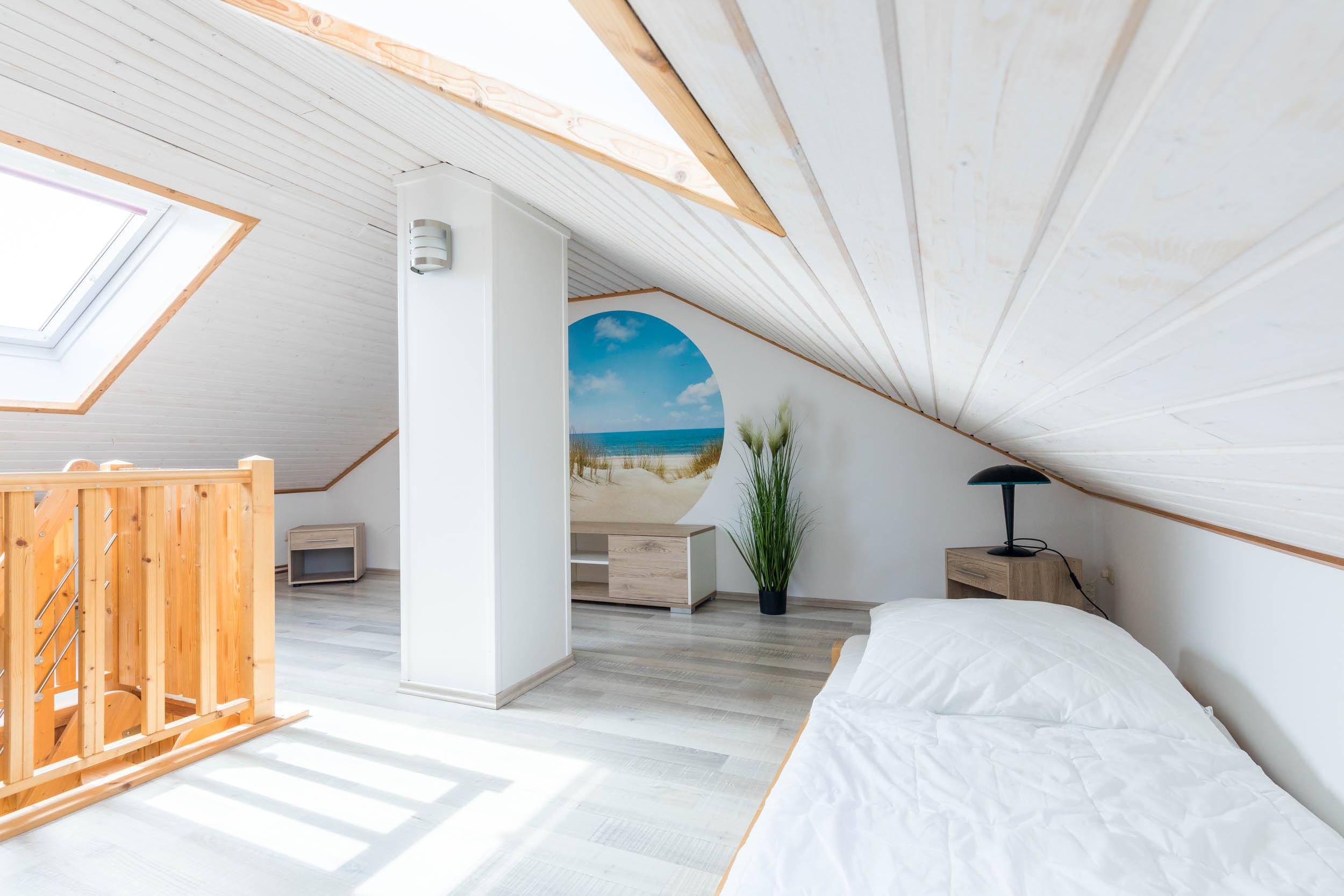 Vom Wohnbereich aus gelangen Sie über eine Raumspartreppe ins offene Dachgeschoss. Dieser Bereich ist eher für größere Kinder geeignet. Hier stehen 2 flache Einzelbetten (je 90x200cm) bereit. Ein eigener Flatscreen-TV an der Wand sorgt auch auf dieser Etage für Unterhaltung.