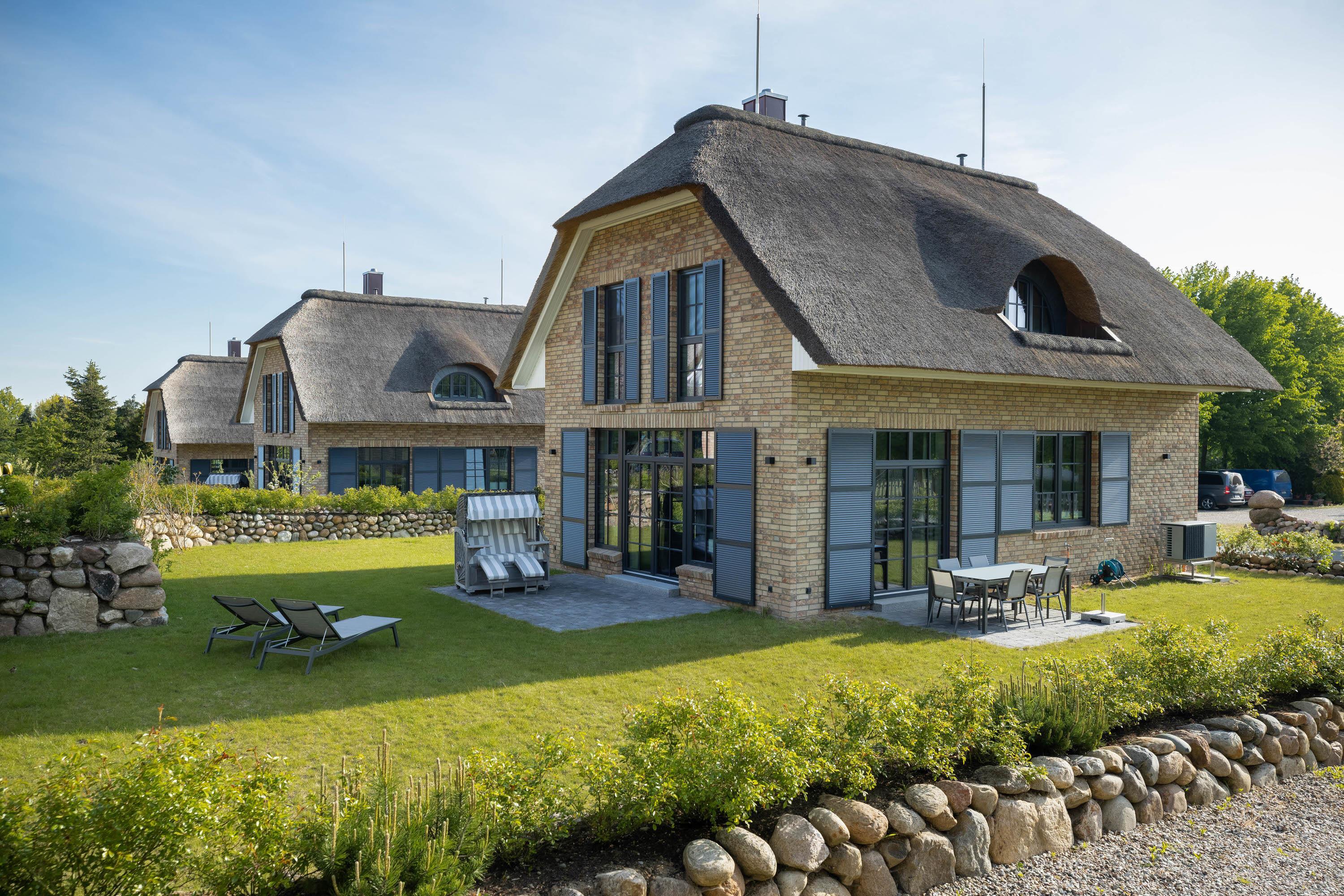 Modernes Reetdachhaus mit Sauna und Naturpool nahe Ostsee für erholsamen Familienurlaub.