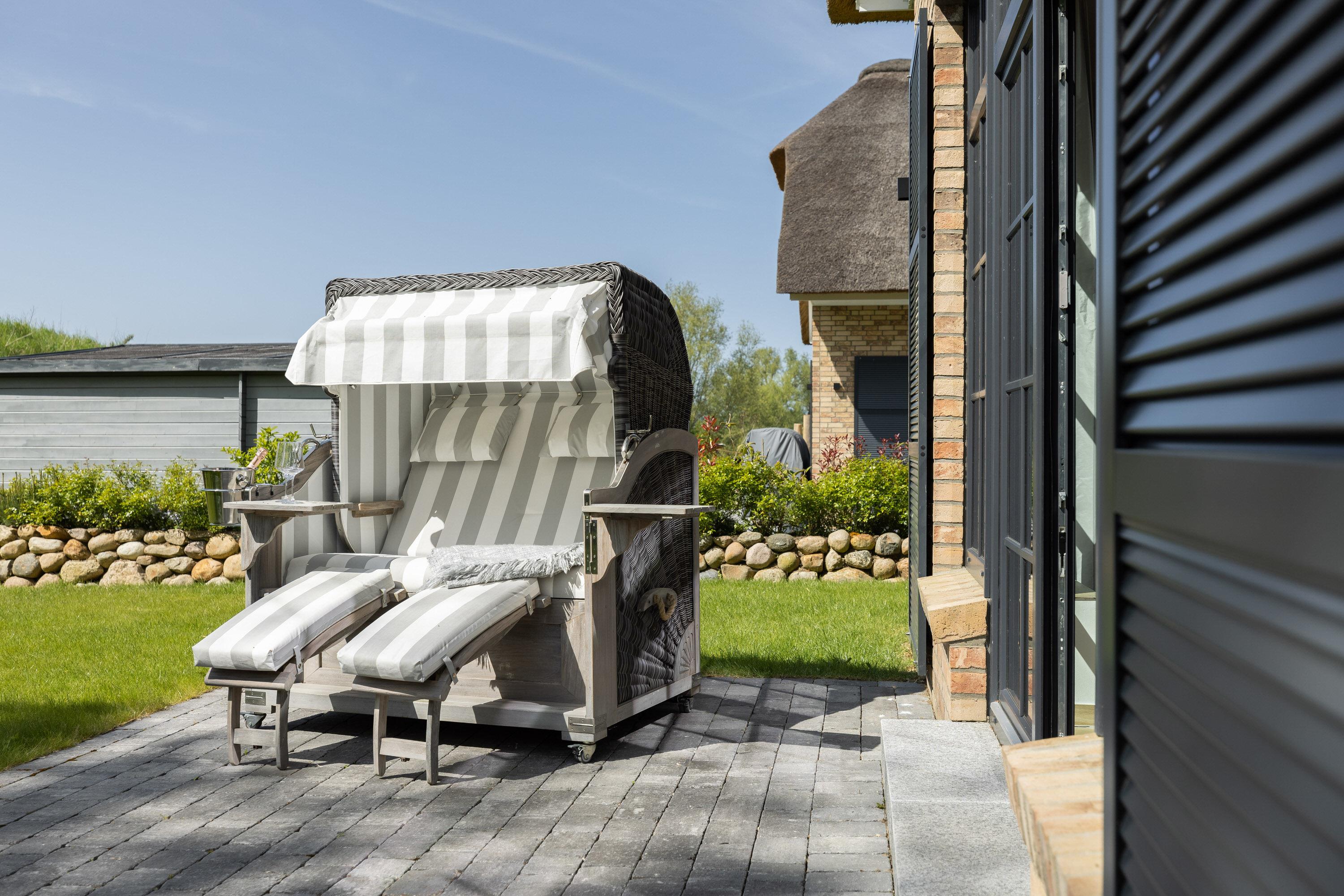 Zum Haus gehört ein eigener Garten mit Terrasse, der mit Gartenmöbeln, einem Strandkorb und einem Sonnenschirm ausgestattet ist - ideal für den Urlaub mit Kindern und/oder Hund! Wir bitten zu berücksichtigen, dass wir einen zweiten Hund nur auf Nachfrage erlauben!