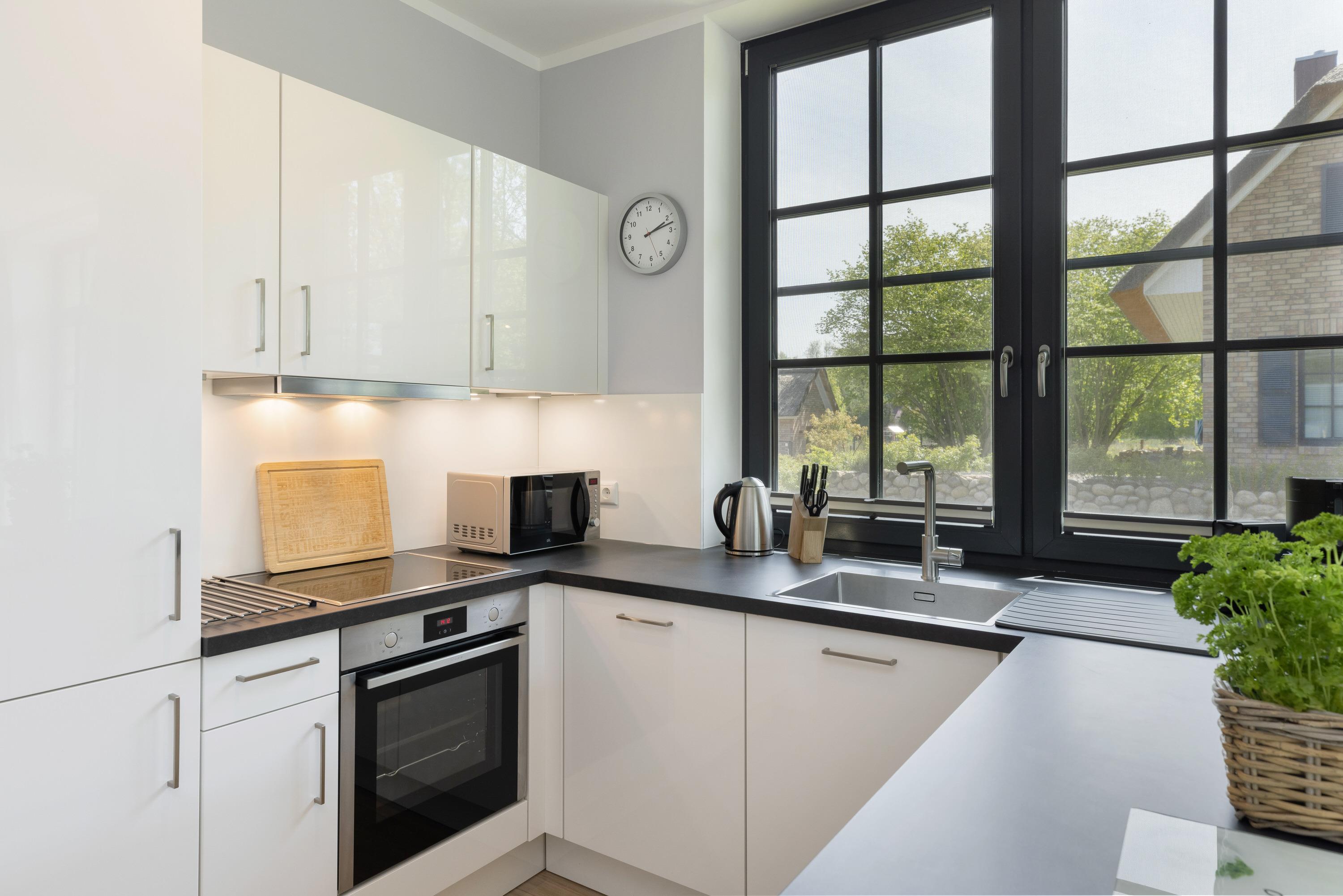 Die moderne, großzügige Küche ist offen angelegt und mit allem ausgestattet, was man benötigt, um nicht nur den schnellen Snack für zwischendurch, sondern auch das Mehrgangmenü am Abend zubereiten zu können. Großzügige Fensterfronten, ein komfortabler Esstisch und eine gemütliche Sitzgruppe vor dem Kamin prägen den lichtdurchfluteten Wohnbereich. Und was gibt es Schöneres an kühlen Abenden, als das Flackern von brennenden Holzscheiten im Kamin! Wer die raue Schönheit der Küste in Herbst und Winter liebt, weiß die Wärme und Behaglichkeit eines Kaminfeuers zu schätzen. Denken Sie daher bei Ihrer Buchung am besten gleich daran, Kaminholz für den ersten Abend zu bestellen.