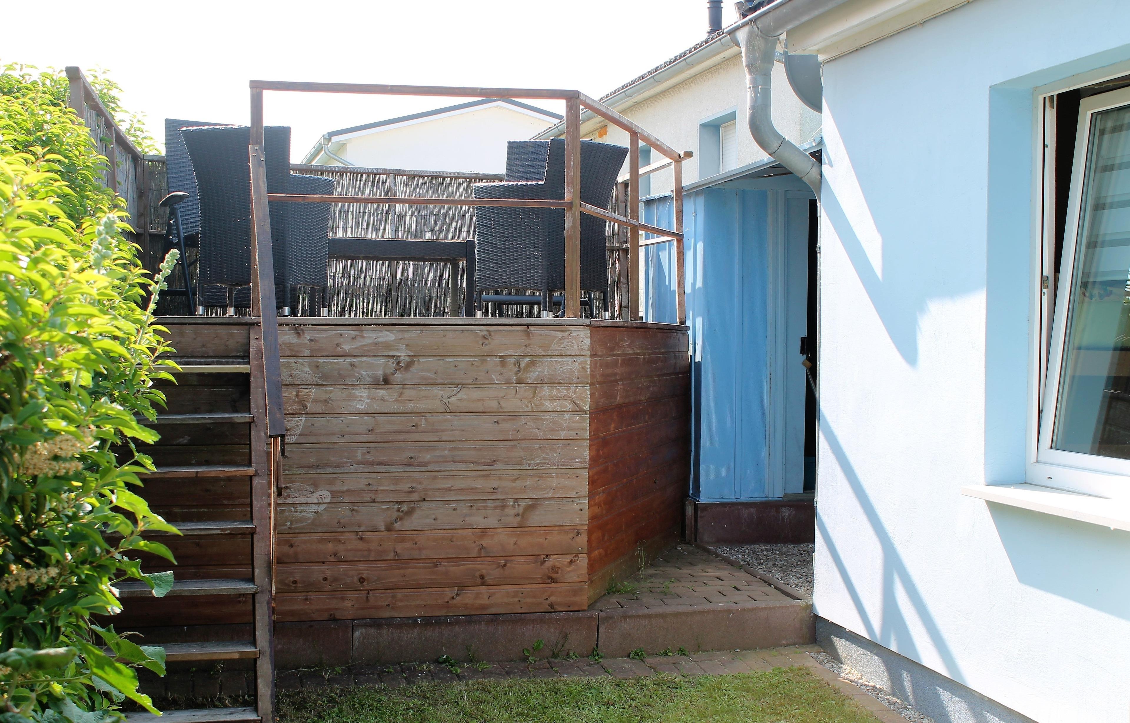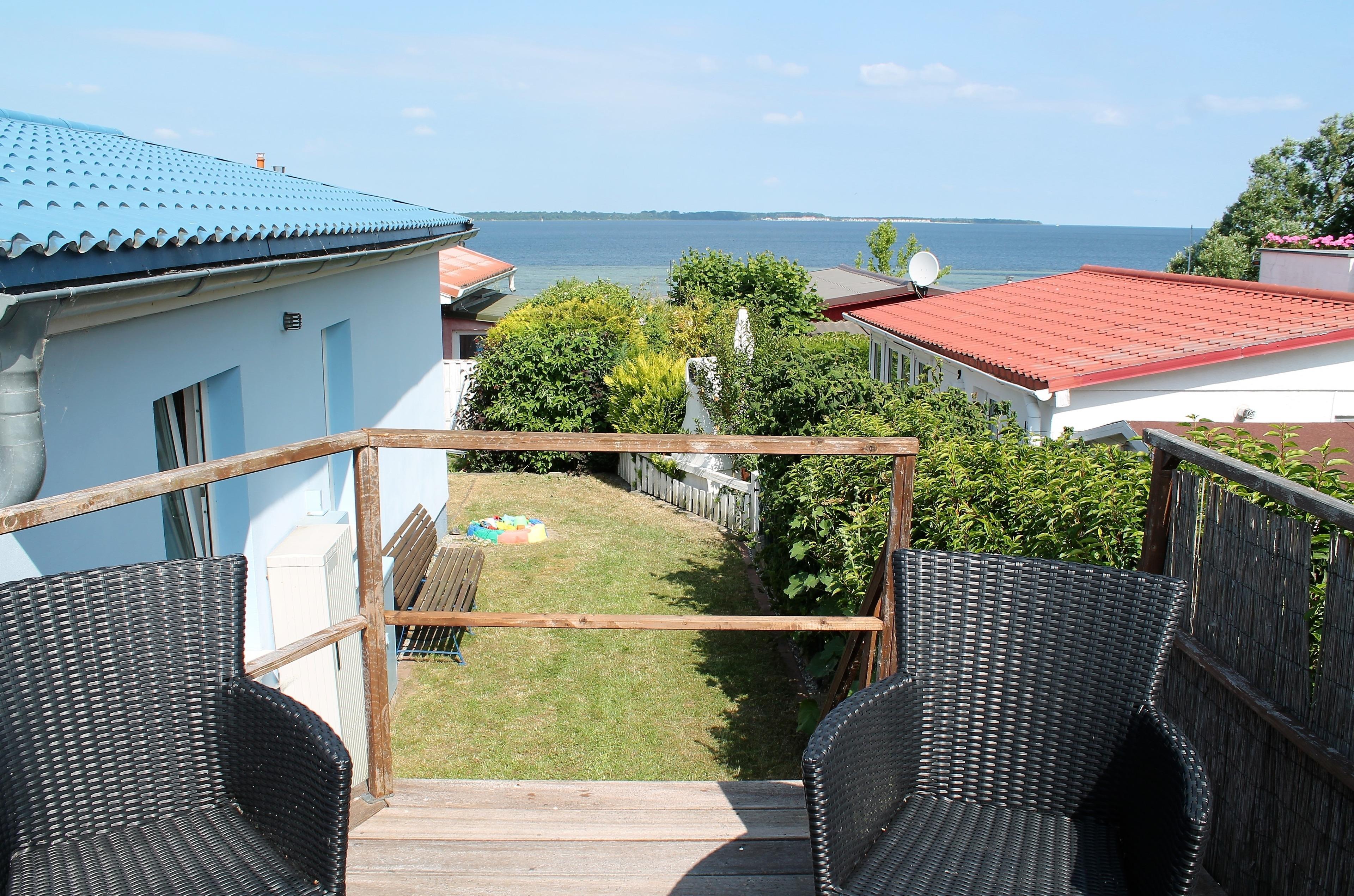 Außenbereich: An der Vorderseite des Ferienhauses befindet sich eine Terrasse (zur Hälfte überdacht) mit Sitzmöglichkeiten, Tisch, Hollywoodschaukel und Grill. Auf der Rückseite des Ferienhauses ist eine Hochterrasse mit bequemen Sitzmöbeln, von der aus sie ebenfalls den Blick über die schöne Bucht der " Wohlenberger Wiek" genießen können. Es bestehen neben dem Ferienhaus Parkmöglichkeiten für zwei PKW
