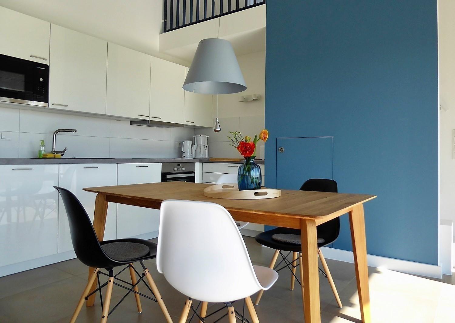 Das Ferienhaus Seeschwalbe, erbaut im Jahr 2019, bietet auf 100 qm Platz für bis zu 5 Personen. Der großzügige Wohnbereich ist ausgestattet mit einem gemütlichen Couchbereich, TV und Kaminofen. Die offene Küche verfügt über eine Spülmaschine, einen Backofen mit Induktionsherd und eine Mikrowelle, ergänzt durch einen angrenzenden Essbereich. WLAN ist ebenfalls vorhanden. Es gibt zwei Schlafzimmer: eines mit einem Doppelbett (180x200) und eines mit einem Etagenbett (90x190) sowie einem Einzelbett (90x200). Für Freizeitaktivitäten sorgt ein Spielboden im Obergeschoss. Die beiden Bäder beinhalten jeweils Dusche und WC, wobei eines zusätzlich mit einer Badewanne ausgestattet ist. Ein Waschtrockner sowie eine große Sauna bieten weiteren Komfort. Haustiere sind nicht erlaubt, und das Haus ist behindertenfreundlich. Zwei Parkplätze und ein Fahrradschuppen stehen ebenfalls zur Verfügung.