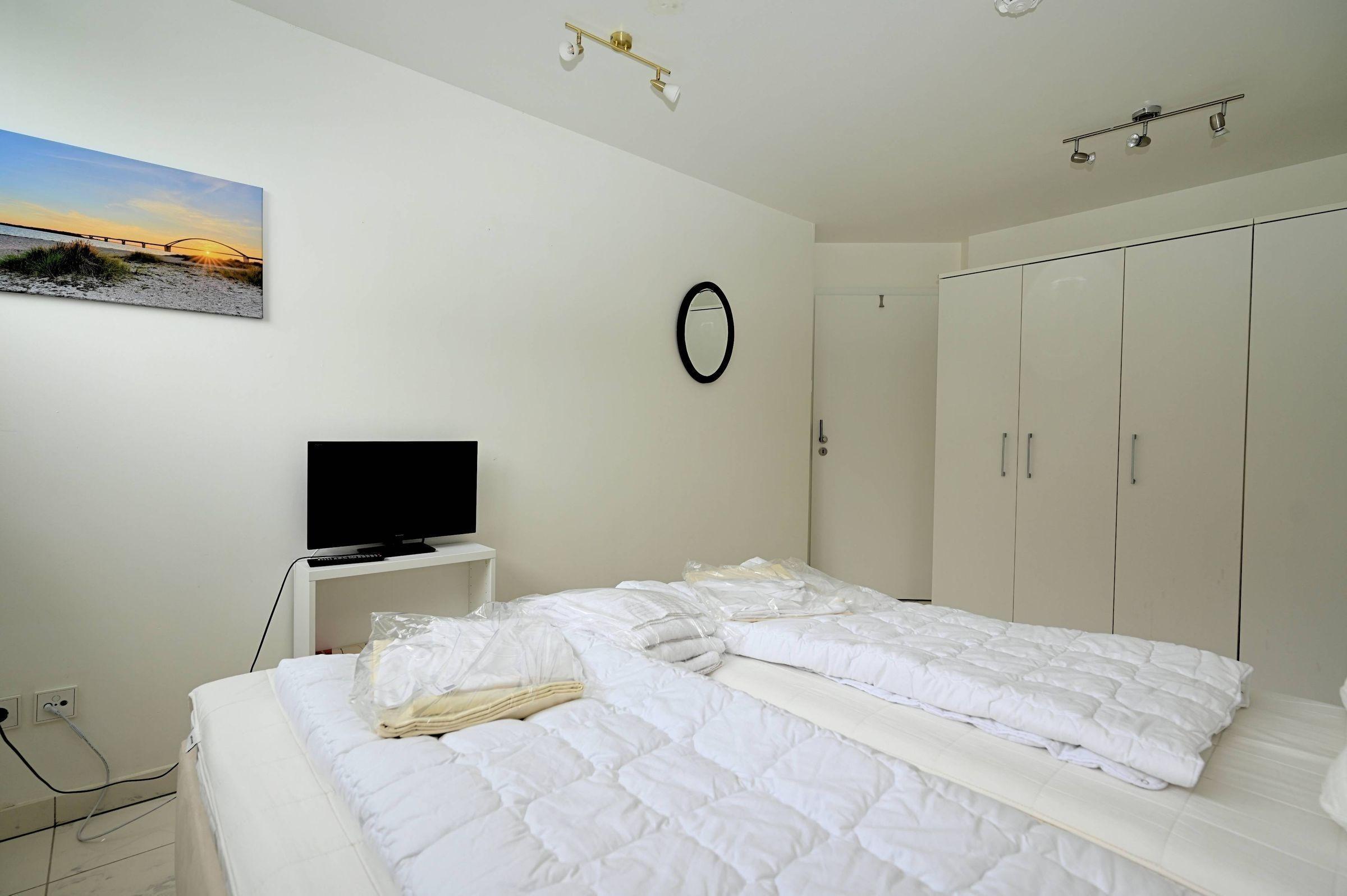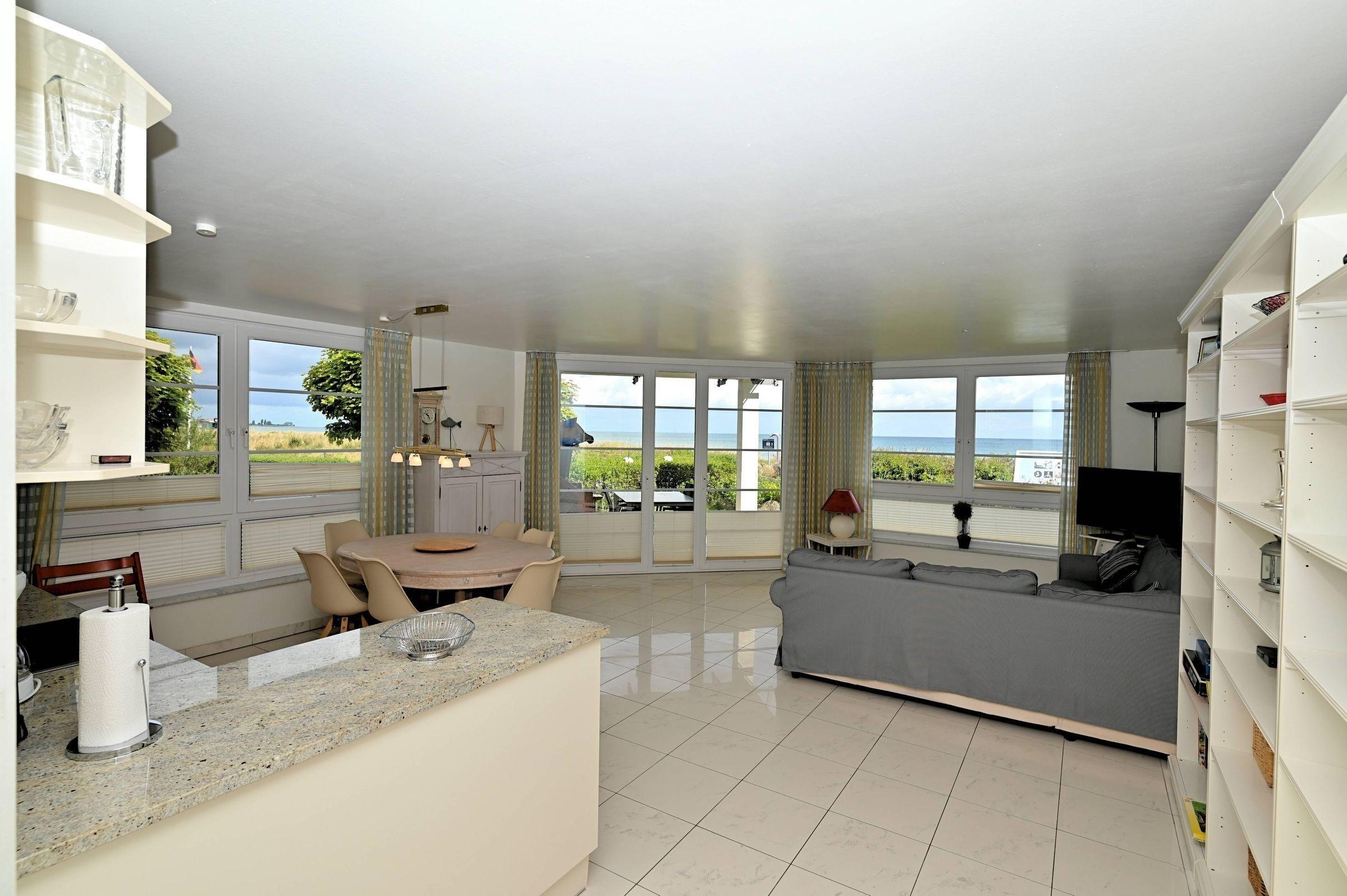 Die große, moderne Ferienwohnung bietet auf 85 qm ausreichend Platz und eine umfassende Ausstattung. Zwei helle Schlafzimmer mit großen Fenstern, eines ausgestattet mit einem Doppelbett, Fernseher und geräumigem Kleiderschrank, ermöglichen erholsamen Schlaf. Das weitläufige Wohnzimmer besticht durch direkten Zugang zur möblierten Terrasse und große Fenster, die einen herrlichen Blick auf die Ostsee bieten. Eine gemütliche Eckcouch und ein Flachbild-Fernseher sorgen für Gemütlichkeit.