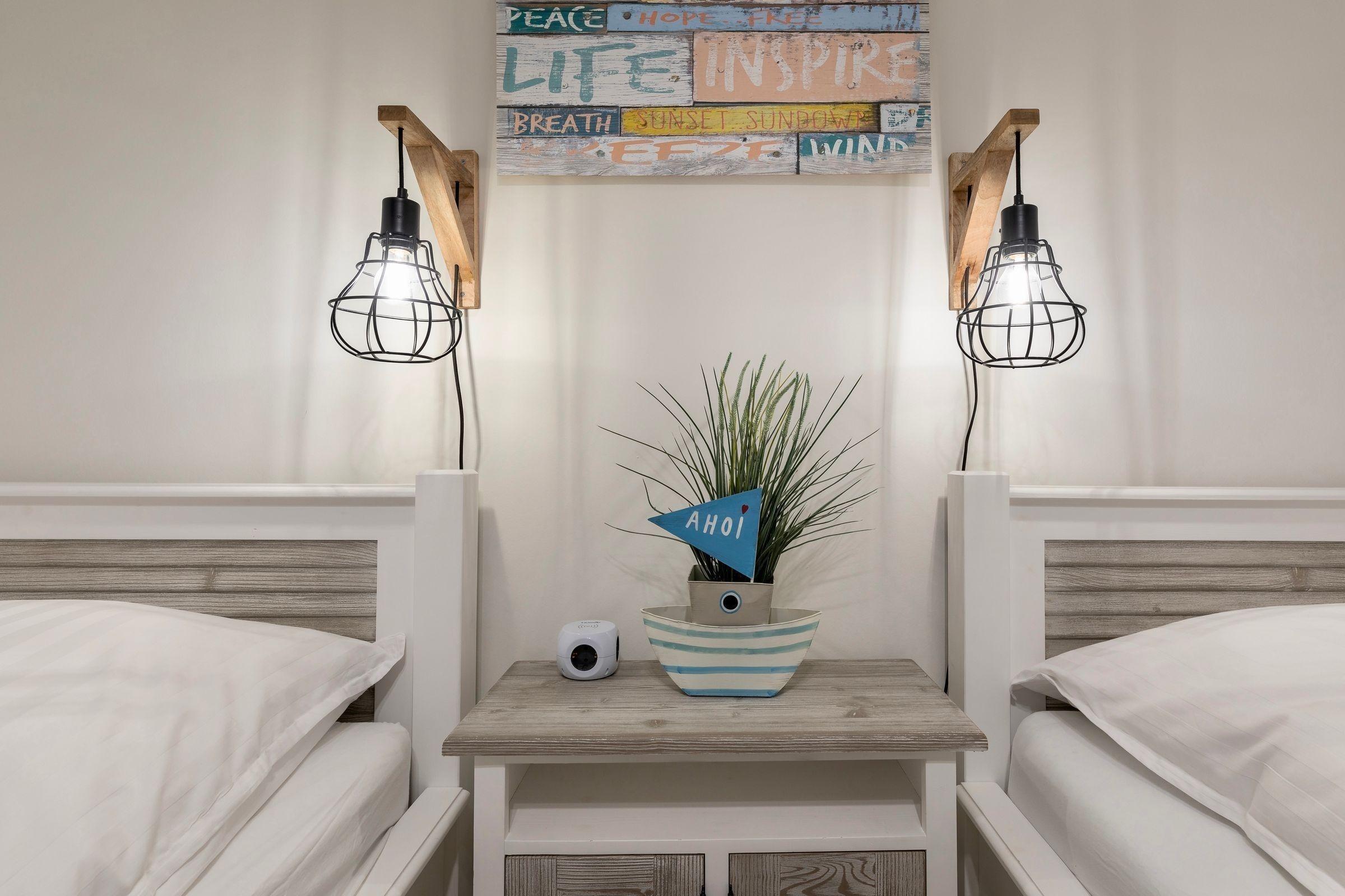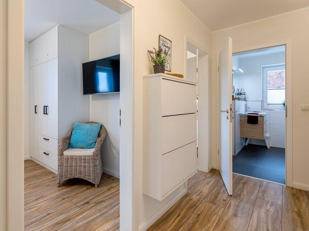 Die Ferienwohnung „Strandliebe“ im Erdgeschoss bietet einen herrlichen Blick auf das Meer aus jedem Raum. Sie verfügt über ein lichtdurchflutetes Wohnzimmer mit einer gemütlichen Couch, Smart-TV und Esstisch für vier Personen. Die moderne Einbauküche ist voll ausgestattet und bietet alles Notwendige zum Kochen. Zwei Schlafzimmer stehen zur Verfügung: eines mit einem Doppelbett (180 x 200 cm) und eines mit zwei Einzelbetten (90 x 200 cm), beide ausgestattet mit Smart-TVs und ausreichend Stauraum. Das Badezimmer ist hell und bietet eine Dusche sowie einen beheizbaren Handtuchhalter. Eine Fußbodenheizung sorgt für Wärme an kühlen Tagen. Zur Wohnung gehört ein PKW-Stellplatz, und Fahrräder können im gemeinschaftlich genutzten Fahrradraum untergestellt werden. Zudem ist die Unterkunft mit kostenfreiem WLAN und einer Waschmaschine mit integriertem Trockner ausgestattet.