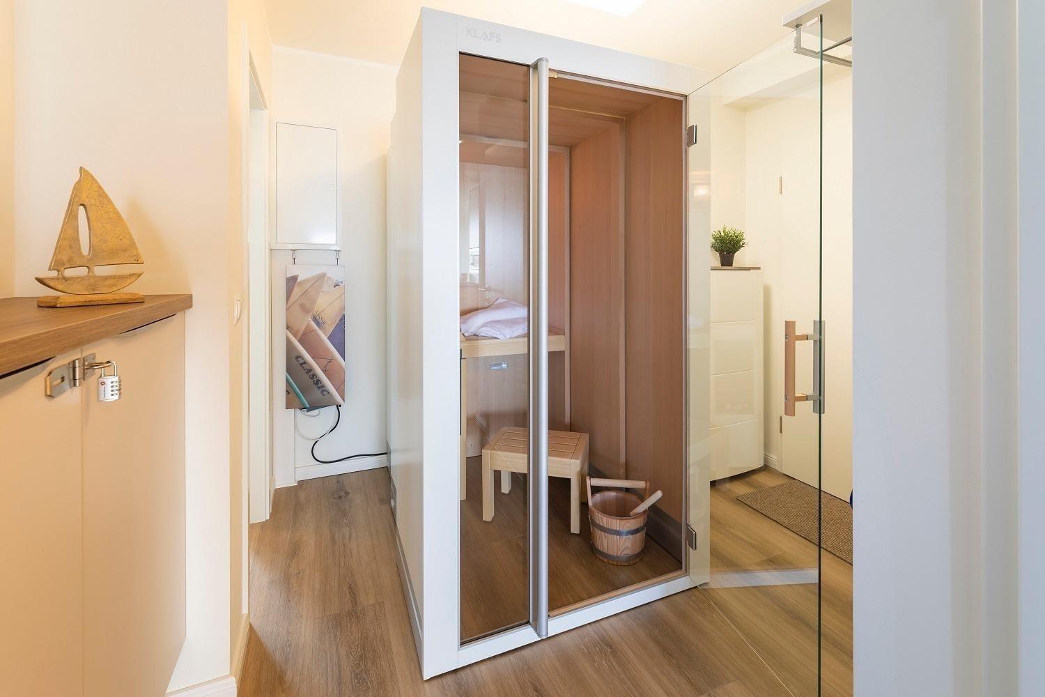 Die Ferienwohnung „Schöne Aussicht“ bietet Platz für vier Personen und beeindruckt mit einem unvergleichlichen Blick auf den weißen Sandstrand und die Ostsee. Der helle Wohnraum mit großer Fensterfront lädt mit einem gemütlichen Sofa, einem Esstisch und einem großen Fernseher zur Entspannung ein. Die offene Küche ist modern gestaltet und vollständig ausgestattet, einschließlich Induktionsherd, Backofen, Kühlschrank mit Gefriervöglichkeit, sowie Geschirrspüler. Zwei Schlafzimmer mit en Suite Duschbädern, Ruf Boxspringbetten und Fernsehern garantieren Komfort. Die bodentiefen Duschen sind mit Glastüren versehen und bieten moderne Annehmlichkeiten wie Handtuchwärmer. WLAN ist verfügbar, und eine Sauna ergänzt das Angebot. Ein Fahrstuhl im Haus sowie ein eigener Stellplatz sorgen für zusätzlichen Komfort.
