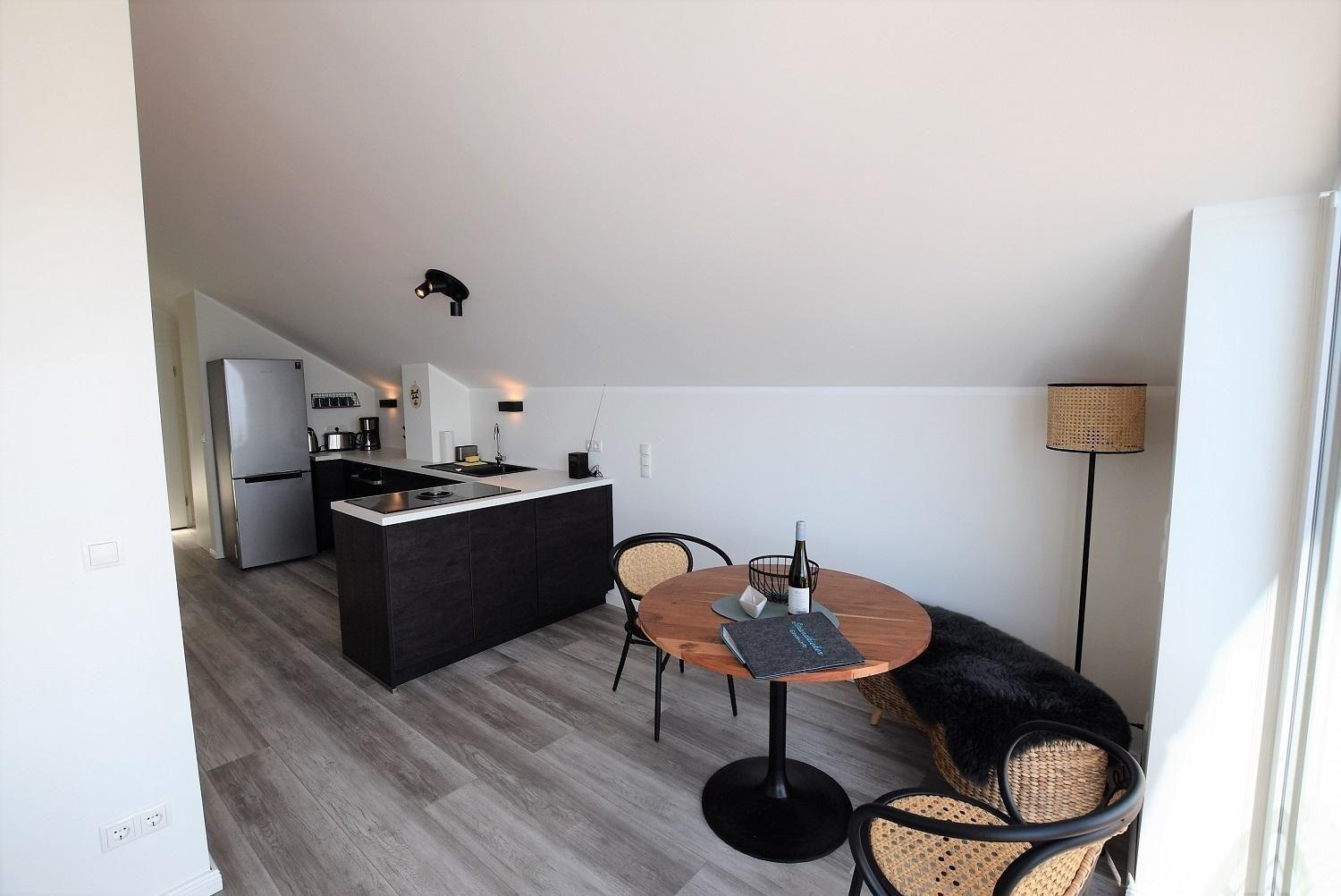 Die Ferienwohnung „Strandkieker“ im Standort Meeresblick bietet eine moderne und helle Studio-Ausstattung im 3. Obergeschoss. Sie verfügt über einen großzügigen, nach Osten ausgerichteten Balkon mit Meerblick. Der Wohnraum ist offen gestaltet und umfasst eine Essecke sowie eine voll ausgestattete Küchenzeile mit Geschirrspüler, Induktionsherd, Backofen, Kühlschrank mit Gefriermöglichkeit und weiteren Küchenutensilien. Ein komfortables Boxspring-Sofa und zwei Smart-TVs mit Kabelfernsehen laden zum Entspannen ein. Das Schlafzimmer bietet ein Boxspring-Doppelbett, verdunkelbare Dachfenster und einen weiteren Fernseher. Das Badezimmer ist modern mit einer bodentiefen Dusche und beinhaltet eine Waschmaschine sowie einen Handtuchwärmer. Die Wohnung ist bequem mit dem Fahrstuhl erreichbar und kostenlose Parkmöglichkeiten für einen PKW sowie zwei Fahrräder stehen bereit. Hunde sind willkommen (max. 20 kg).
