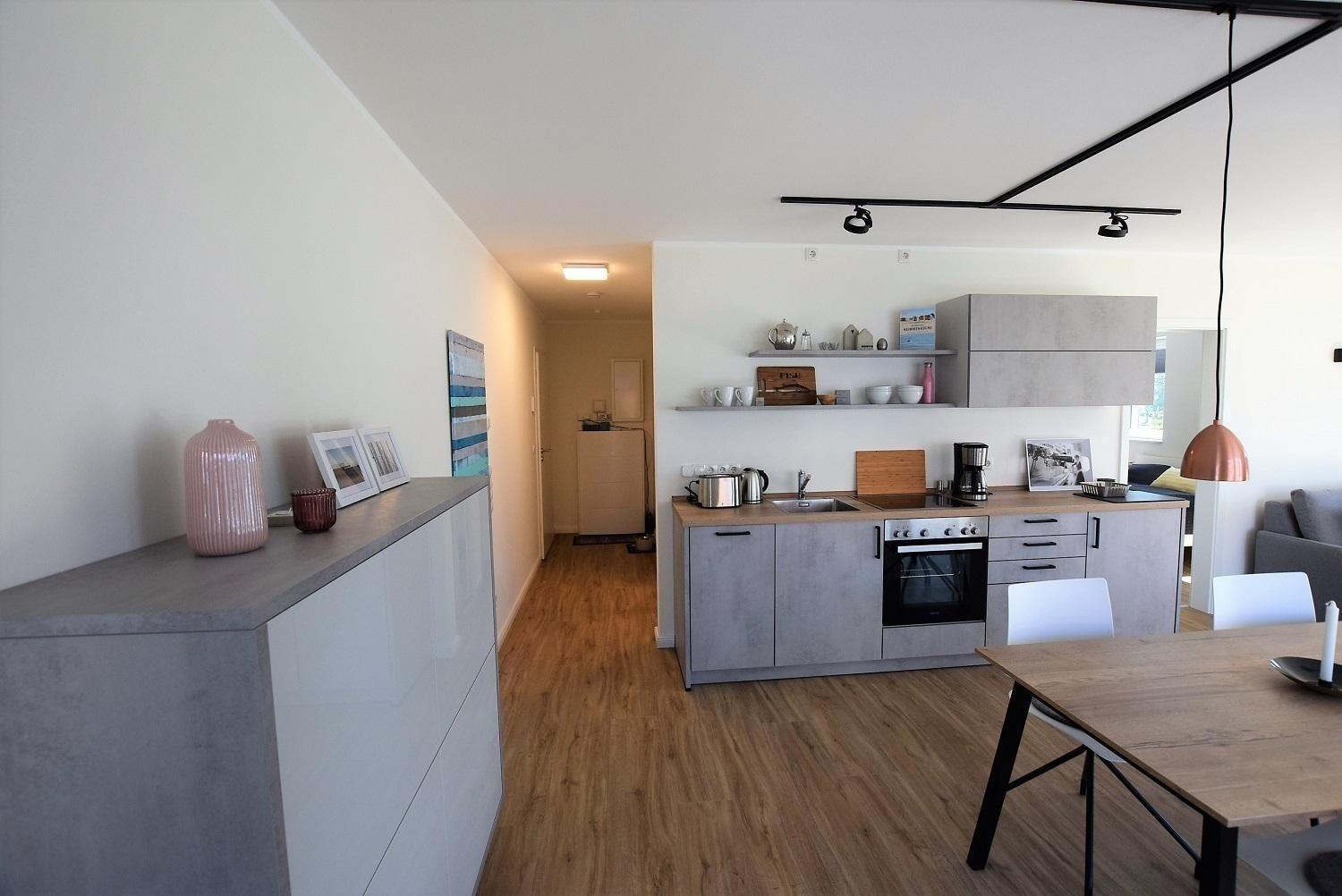 Die Ferienwohnung beeindruckt durch ihre offene Raumgestaltung und hochwertige Ausstattung. Im Schlafzimmer befindet sich ein komfortables Doppelbett (1,80 x 2,00), das für erholsame Nächte sorgt. Die offene Küche ist mit modernsten Geräten ausgestattet, darunter ein Geschirrspüler, Elektro-/Gasherd, Backofen, Kühlschrank, Kaffeemaschine, Toaster und Gefriermöglichkeiten, sodass das Kochen zum Vergnügen wird.