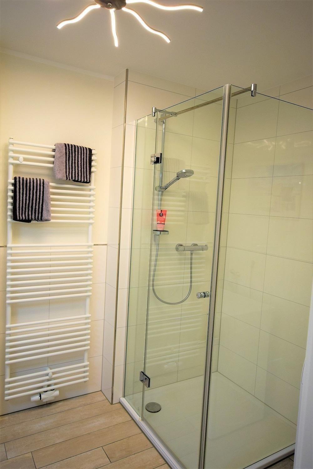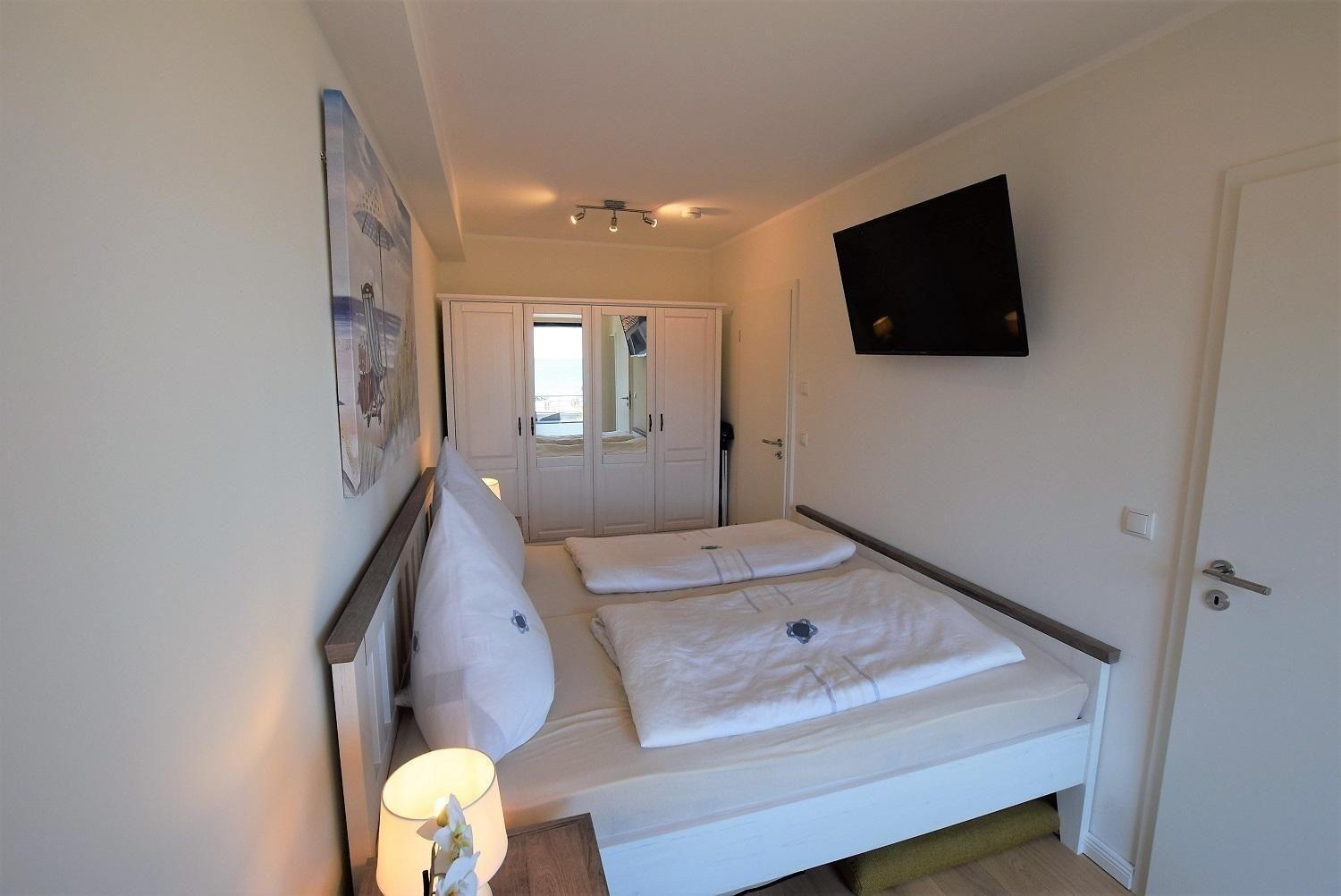 Die Ferienwohnung „Strandparadies“ im 1. Obergeschoss des Hauses "Meeresblick" bietet auf 49 qm Platz für bis zu vier Personen. Der großzügige Wohn- und Essbereich überzeugt durch große Terrassentüren, die viel Tageslicht und Meerblick bieten. Das große Sofa kann ausgezogen werden, um Platz für zwei Gäste zu schaffen. Die moderne L-förmige Küche ist mit Geschirrspülmaschine, Ceranfeld, Backofen und Kühlschrank mit Gefrierfach ausgestattet. Das Schlafzimmer bietet ein großes Doppelbett und einen geräumigen Kleiderschrank. Das Bad verfügt über eine Dusche, WC und einen Waschtisch mit Ablagefläche. WLAN ist kostenlos verfügbar. Ein Fahrstuhl sorgt für bequemen Zugang zur Wohnung. Ein fester Parkplatz sowie ein Unterstellplatz für zwei Fahrräder stehen zur Verfügung.