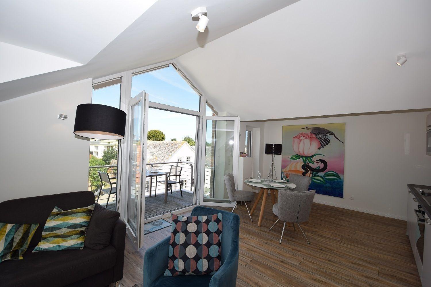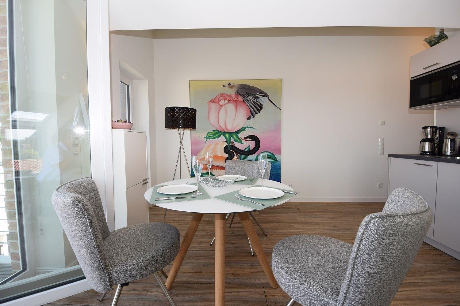 Die Studiowohnung "Storchennest" im Haus Meeresblick bietet Platz für zwei bis drei Personen und überzeugt durch ihre helle, moderne Ausstattung. Der Wohnraum ist lichtdurchflutet und verfügt über eine große Fensterfront sowie ein gemütliches Sofa, das zum Entspannen einlädt. Eine offene Küche mit angrenzendem Essplatz ist umfangreich ausgestattet, darunter Herd, Backofen, Kühlschrank mit Gefriermöglichkeit, Kaffeemaschinen und eine Spülmaschine. Das komfortable Schlafzimmer ist mit einem großen Doppelbett und einem großzügigen Schrank für ausreichend Stauraum ausgestattet. Das moderne Duschbad bietet eine bodentiefen Dusche, einen Waschtisch mit Spiegel und einen Handtuchwärmer. Ein Balkon mit Möbeln lädt dazu ein, die frische Luft zu genießen. WLAN ist verfügbar und ein Lift sorgt für barrierefreien Zugang. Haustiere sind erlaubt, maximal zwei mittelgroße Hunde.