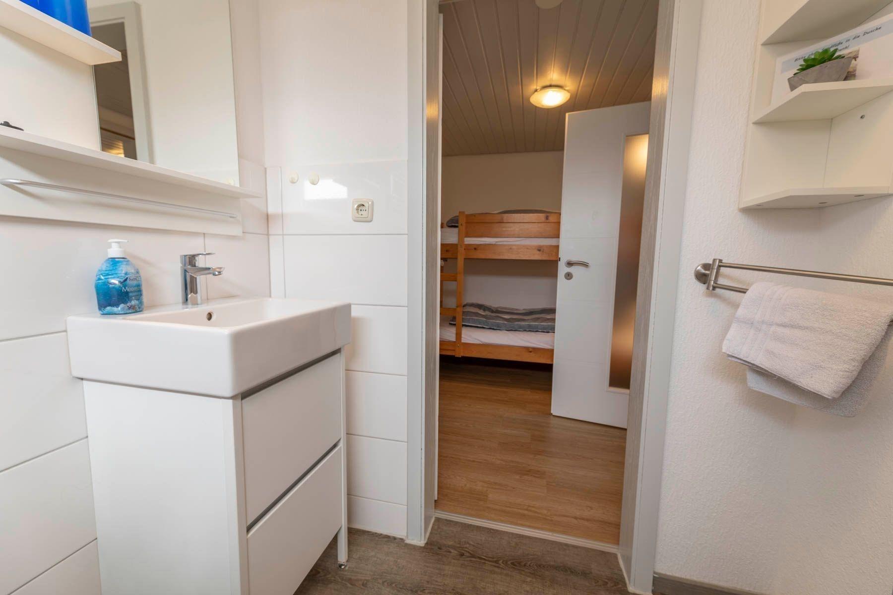 Die Ferienwohnung bietet eine anspruchsvolle Ausstattung und viel Komfort für einen erholsamen Aufenthalt. Sie verfügt über ein Schlafzimmer mit einem Doppelbett sowie ein Wohnschlafzimmer mit zwei Einzelbetten. Das Badezimmer ist mit einem Fenster ausgestattet und bietet Ablagemöglichkeiten mit Spiegel.