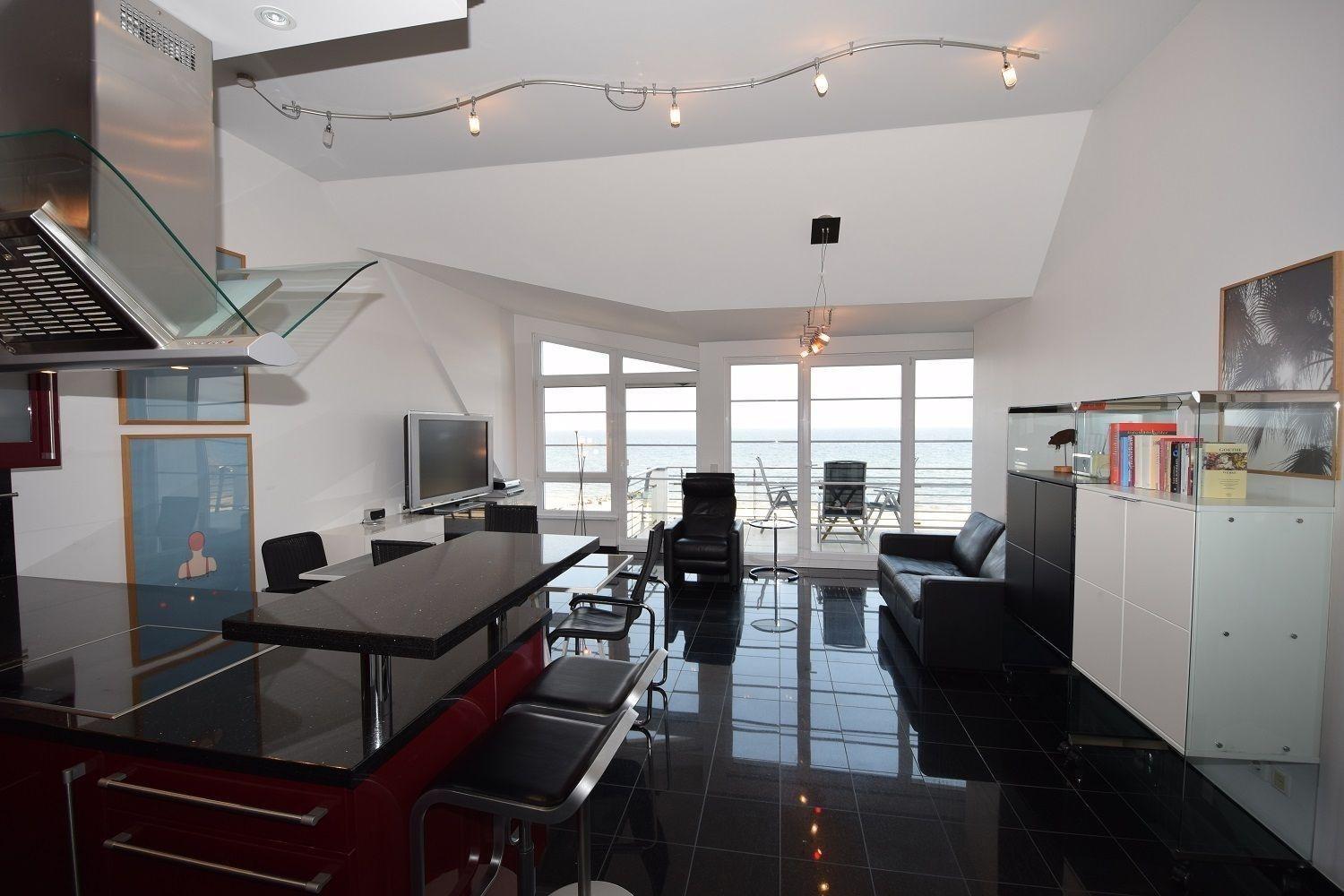 Die moderne und helle Ferienwohnung in Hohwacht bietet einen einzigartigen Panoramablick auf den feinen Sandstrand. Der Wohnraum verfügt über große Fensterfronten, einen Wohnbereich mit bequemen Ledersofa und großem TV sowie eine Essecke mit angrenzender Küchenzeile. Die Küche ist offen gestaltet und mit Geschirrspüler, Herd, Backofen, Kühlschrank mit Gefrierfach sowie weiteren Küchenutensilien ausgestattet. Das Schlafzimmer bietet ein großes Doppelbett und ausreichend Stauraum mit Kleiderschrank und Kommoden. Das moderne Badezimmer ist gefliest und verfügt über eine bodentiefe Dusche, einen Waschtisch mit großem Spiegel sowie einen Föhn und Handtuchwärmer. Eine Waschmaschine ist in der Küche nutzbar, während ein Trockner im Keller bereitsteht. Die Lage in der Nähe des Strandes und wichtiger Einrichtungen ergänzt das Angebot der Unterkunft.