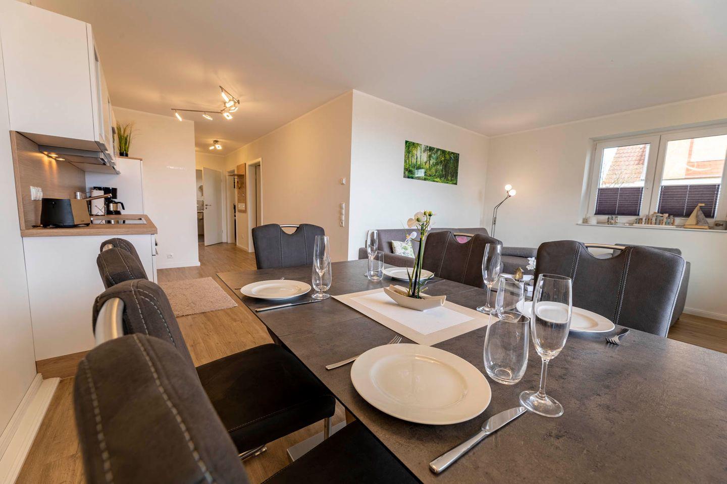 Am Esstisch können alle Gäste der Unterkunft zu gemeinsamen Mahlzeiten zusammenkommen. Direkt angrenzend befindet sich die offene Küche in modernem Design. Diese ist vollumfänglich ausgestattet und verfügt neben einem Geschirrspüler auch über einen Ceran- Herd mit Backofen, eine Mikrowelle, Kaffeemaschine, Wasserkocher, Toaster, einen Kühlschrank mit Gefriermöglichkeit und zahlreiche weitere Vorzüge.
