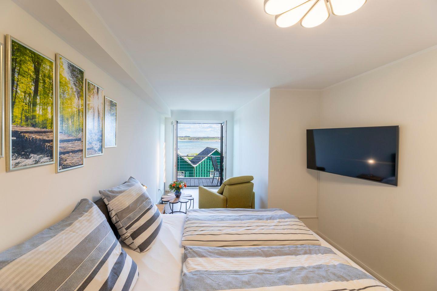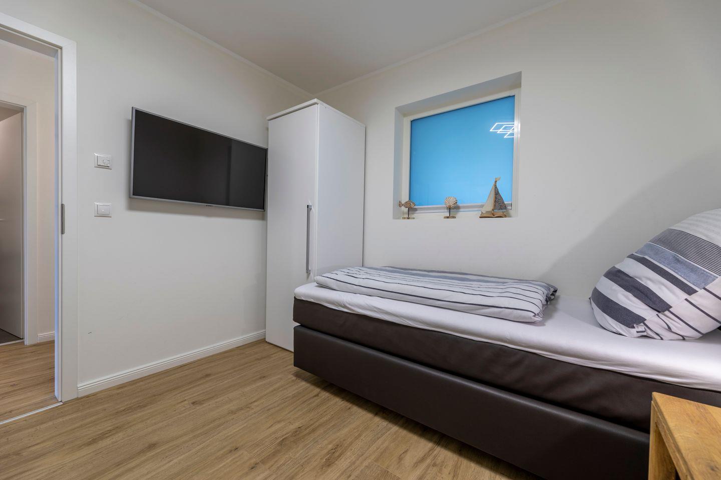 Zwei Schlafzimmer sorgen für erholsame Urlaubsnächte. Im ersten Schlafraum mit Doppelbett sorgt der geräumige Schrank und der eigene Fernseher für zusätzlichen Komfort.