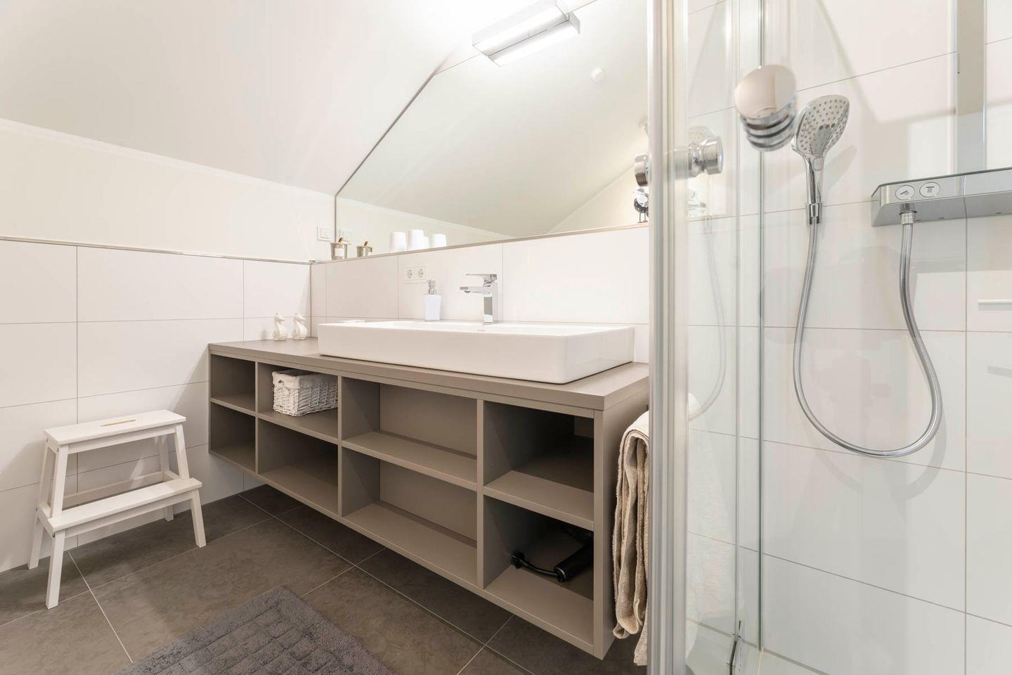 Das Badezimmer besitzt eine bodentiefe Dusche. Helle Fliesen sorgen für einen modernen Gesamteindruck. Deckenspots, ein Waschtisch mit großem Spiegel und ein Fön sind hier ebenso vorhanden wie ein Handtuchwärmer.