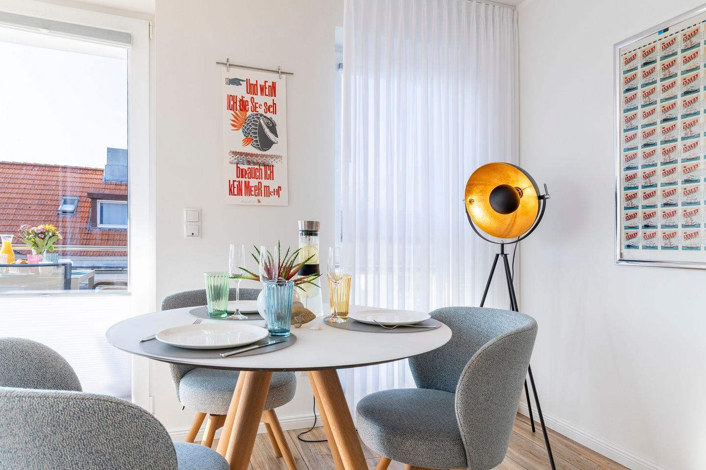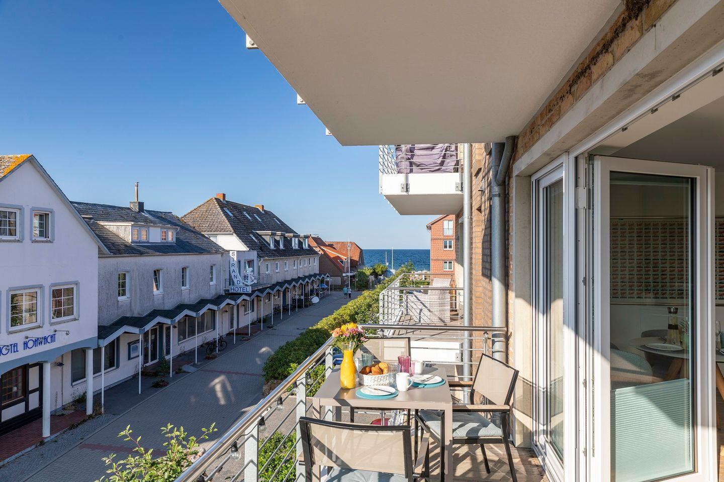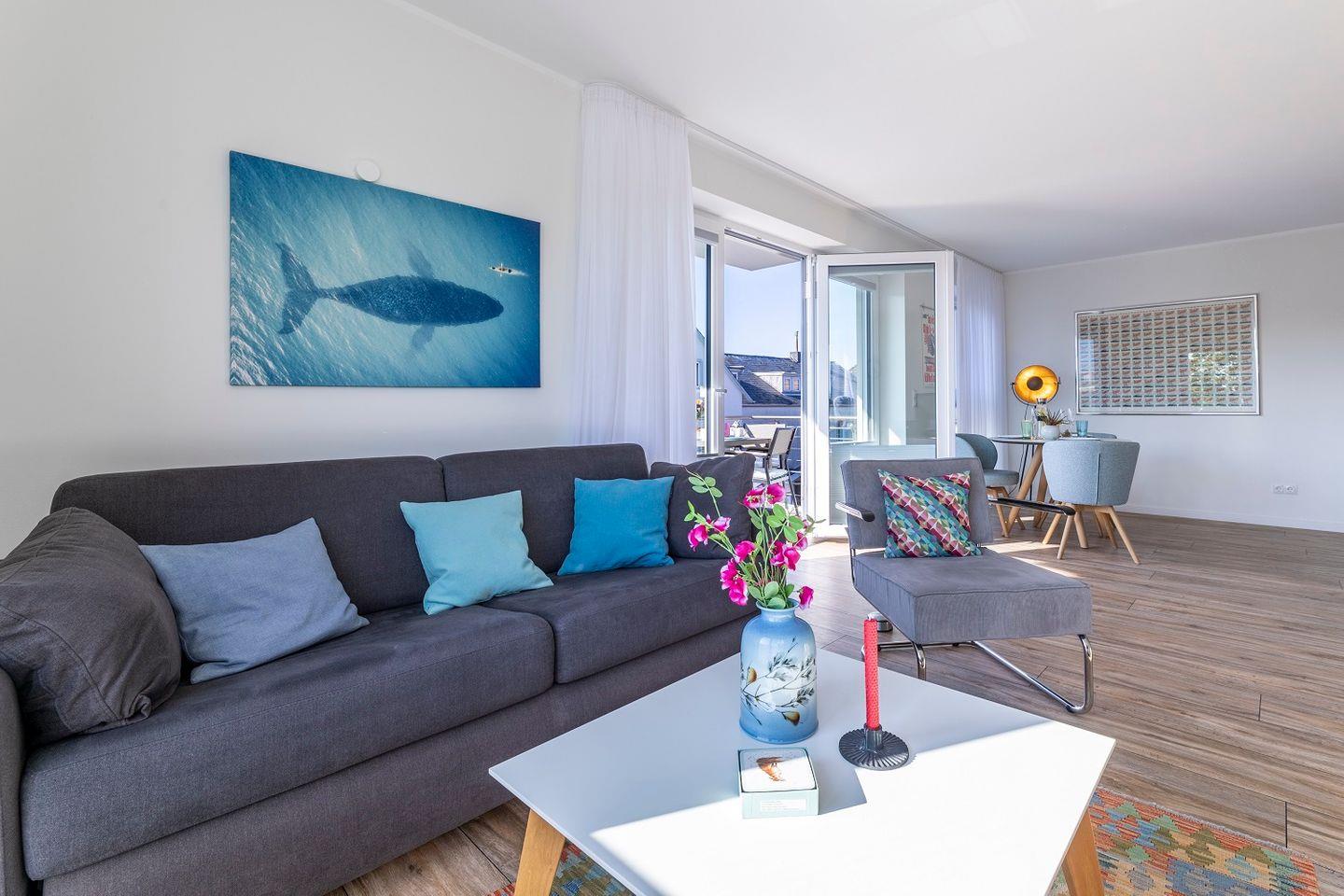 Der helle Wohnraum der Ferienwohnung "Große Freiheit" verfügt über eine große Fensterfront, hinter welcher sich der schöne Balkon der Wohnung erstreckt. Direkt davor befindet sich das gemütliche Sofa und ein Sessel, die nach einem langen Tag am Meer zum Entspannen einladen. Eine Fernseher runden den Wohnbereich ab.