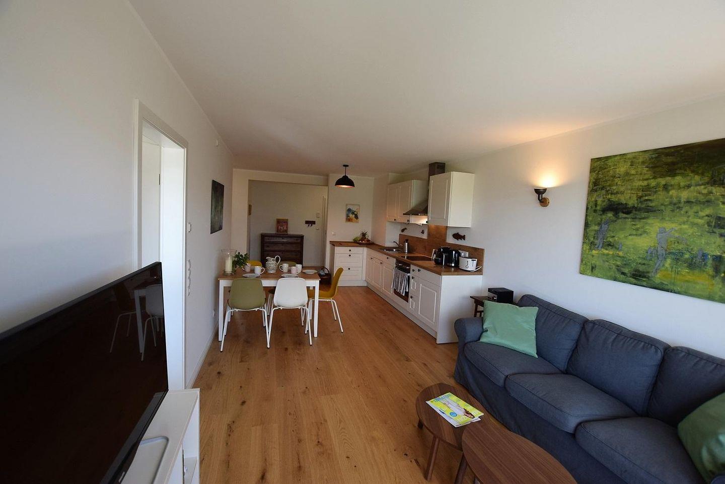 Am Esstisch können alle Gäste der Unterkunft zu gemeinsamen Mahlzeiten zusammenkommen. Direkt angrenzend befindet sich die offene Küche in modernem Design. Diese ist vollumfänglich ausgestattet und verfügt neben einem Geschirrspüler auch über einen Ceran- Herd mit Backofen, Kaffeemaschine, Wasserkocher, Toaster, einen Kühlschrank mit Gefriermöglichkeit und zahlreiche weitere Vorzüge.