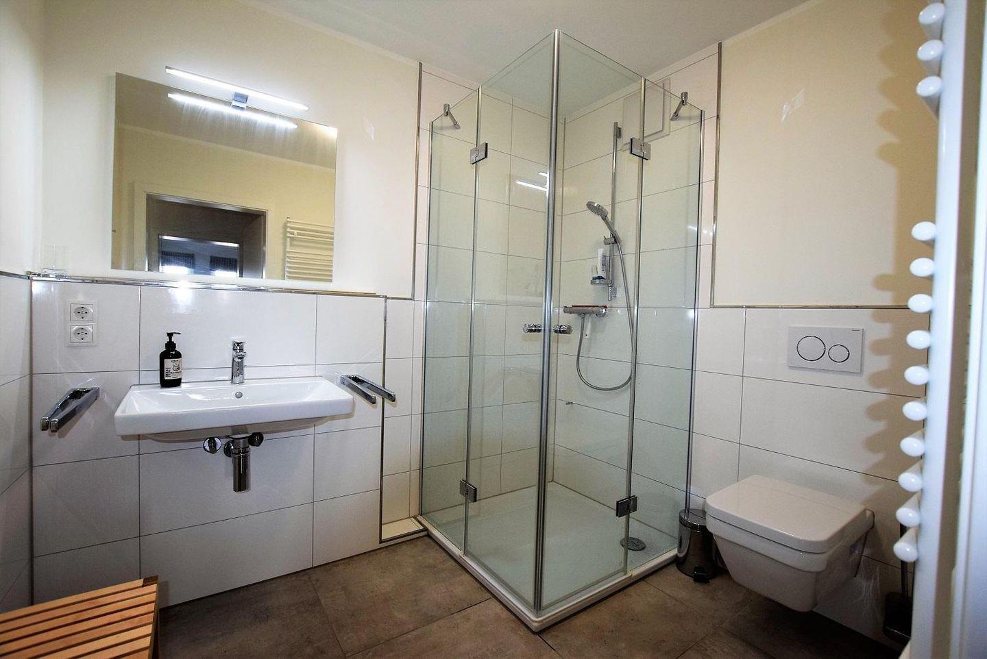 Diese Unterkunft verfügt über ein Vollbad mit Waschtisch, Dusche und WC. Die Beleuchtung mit Deckenspots und der Handtuchhalter sorgen für modernen Komfort.