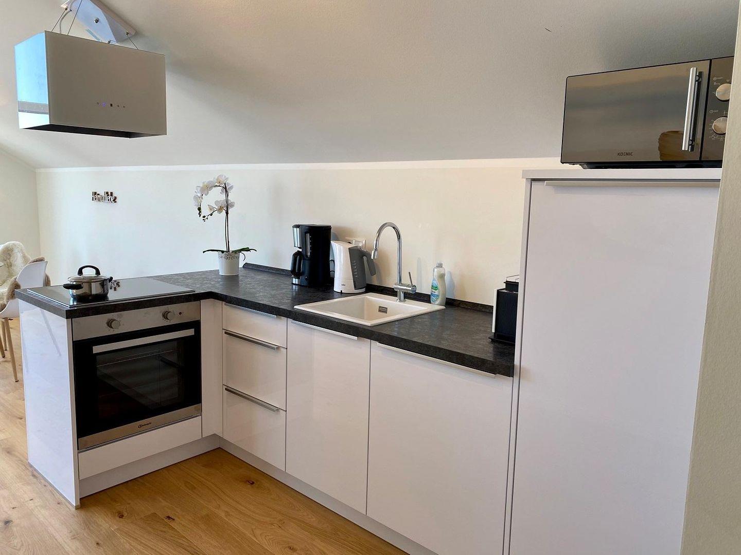 Die Küche ist umfassend ausgestattet und bietet ausreichend Arbeitsfläche, um im Urlaub auch mal anspruchsvoller zu kochen. Zu ihren Vorzügen gehören neben dem Induktionsherd und Backofen auch ein Kühlschrank (mit Gefriermöglichkeit), Kaffeemaschine, Wasserkocher, Toaster sowie eine praktische Spülmaschine. Selbstverständlich stehen auch Geschirr, Besteck und Küchenutensilien zur Verfügung.