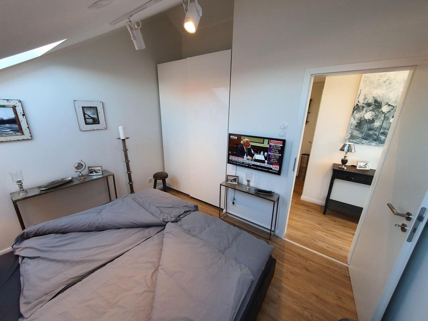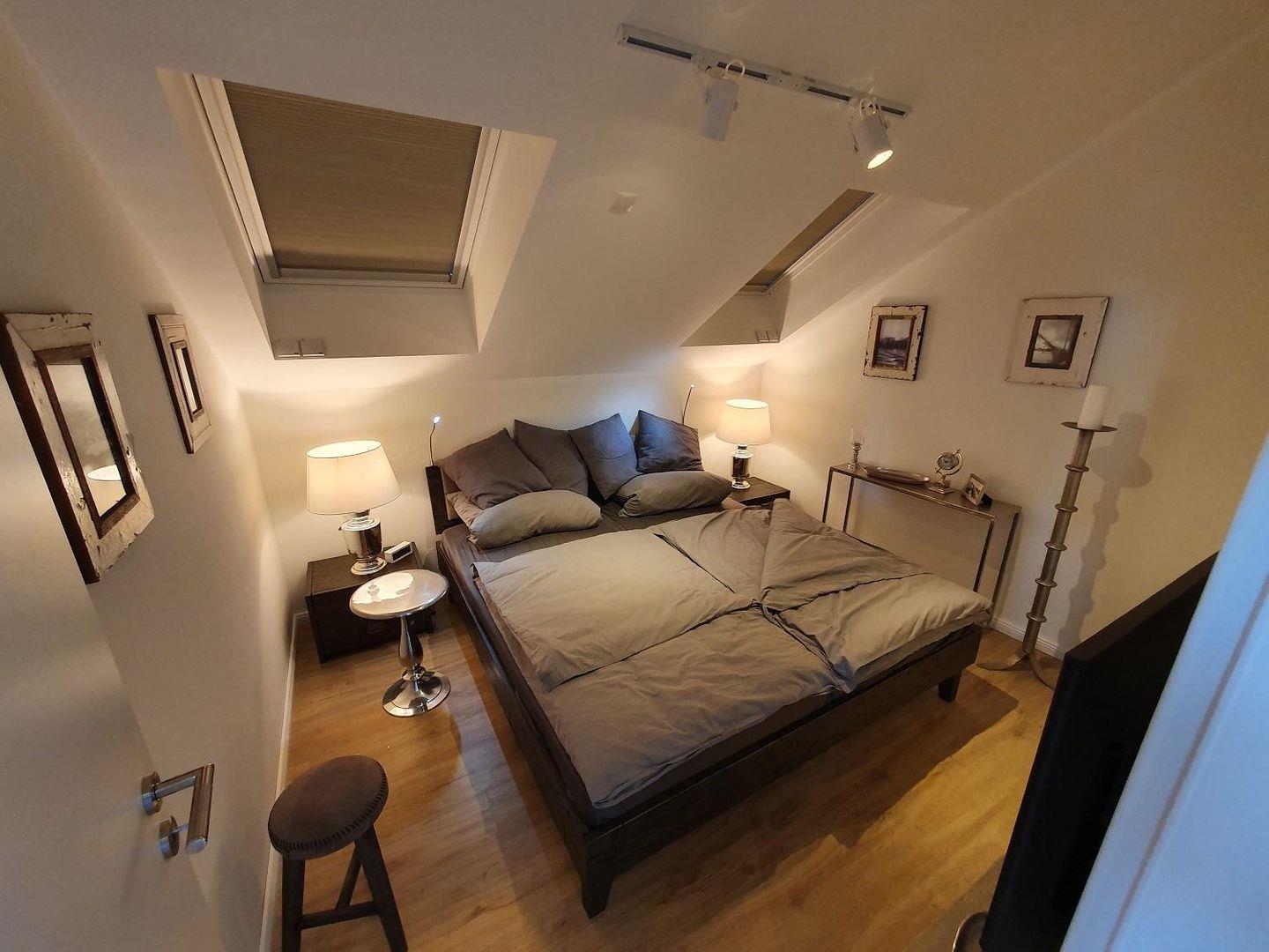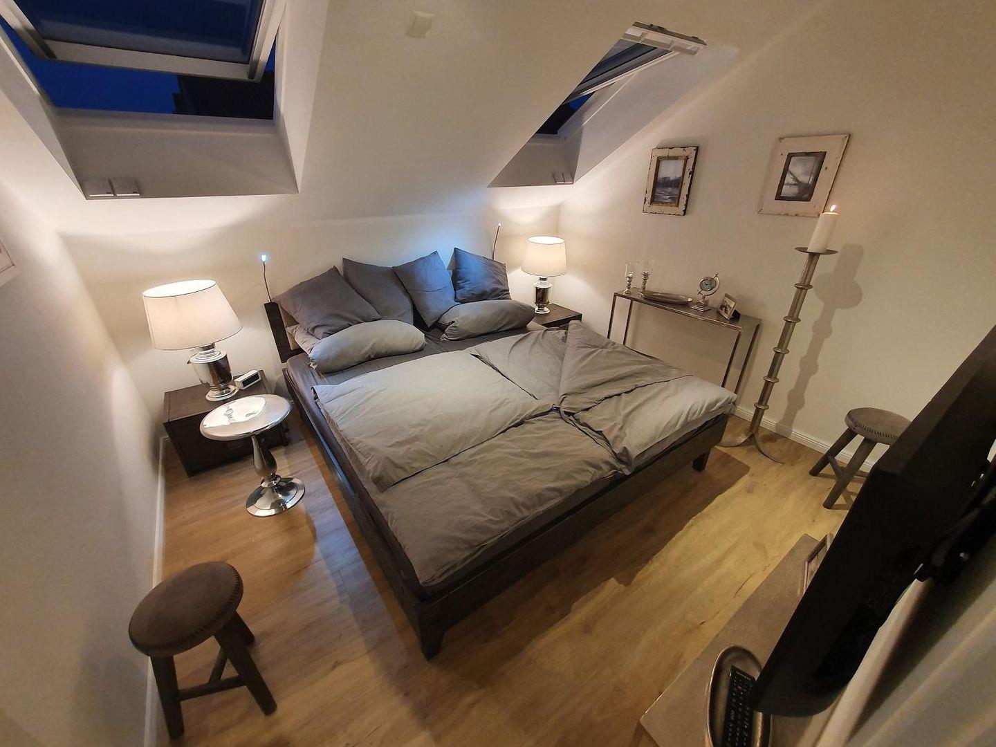 Das Schlafzimmer mit seinem gemütlichen anthrazitfarbenen 1,80 Meter breitem Arkazienholzbett, mit Kunstlederrückenlehne, modernen Leselampen, bequemen Matratzen und gemütlichen Nachttischlampen ist durch die Dachfenster lichtdurchflutet, aber dennoch nicht einsehbar. Ein hoher, individuell eingepasster Schlafzimmerschrank bietet jeden Komfort. Von innen beleuchtet, ist er mit allen erdenklichen Fächern, bis zum Fach für Schmuck und Brillen ausgestattet. Genießen Sie einen Tag im Bett, selbstverständlich mit fernsehen, auch im Schlafzimmer.