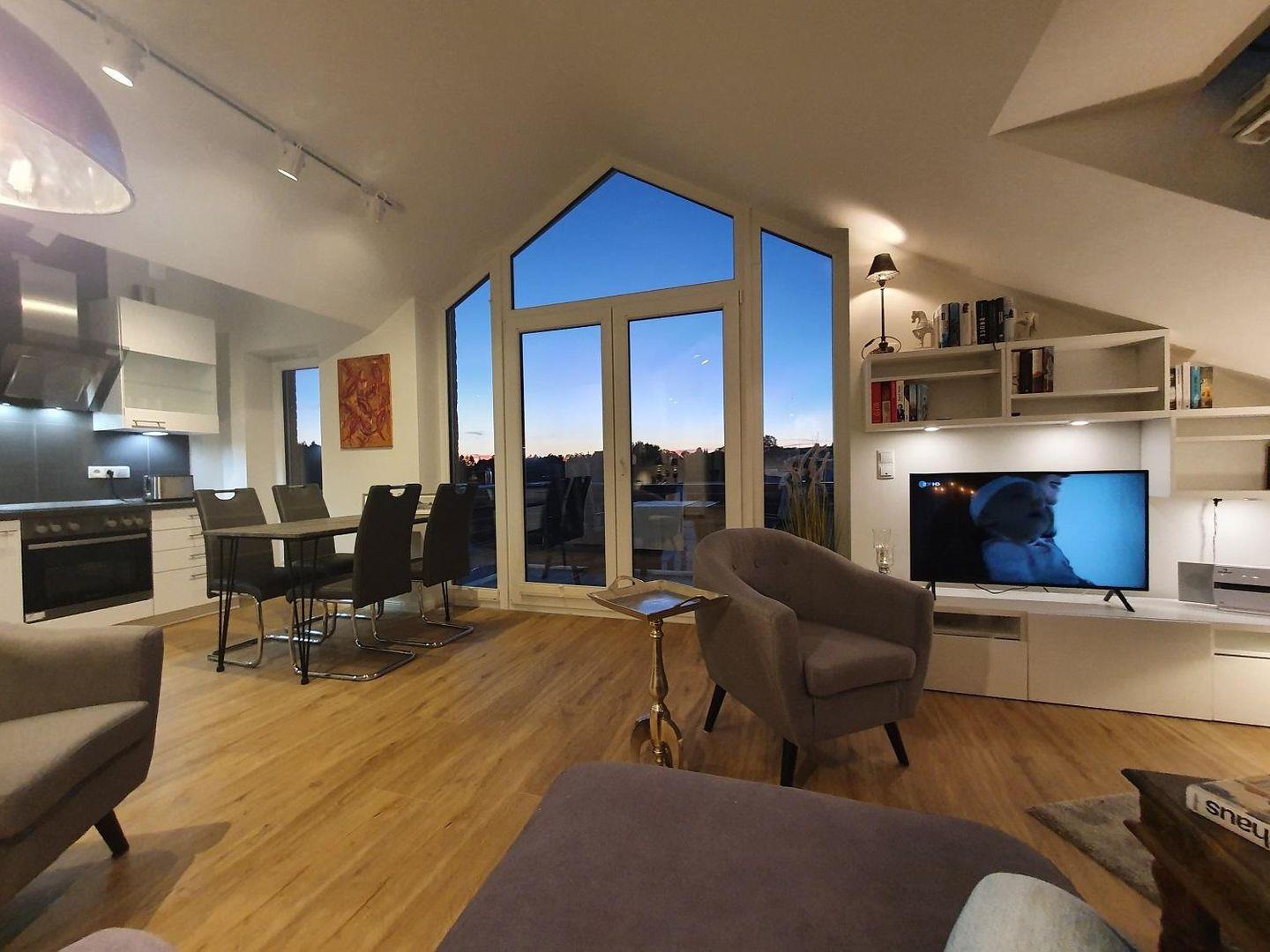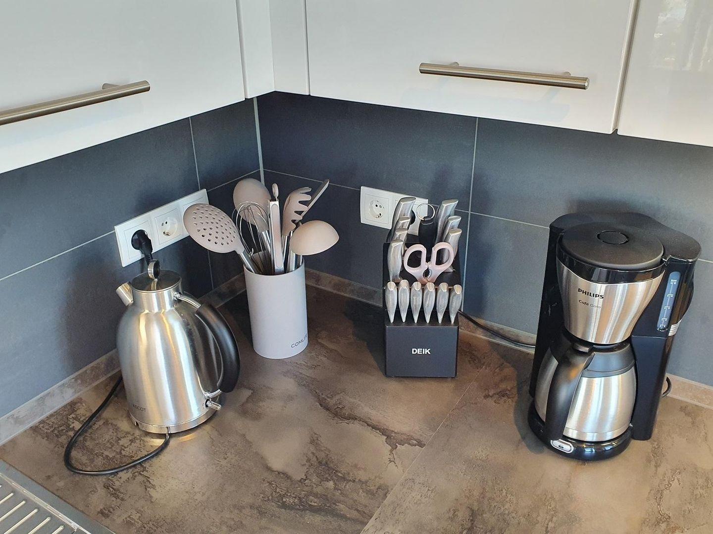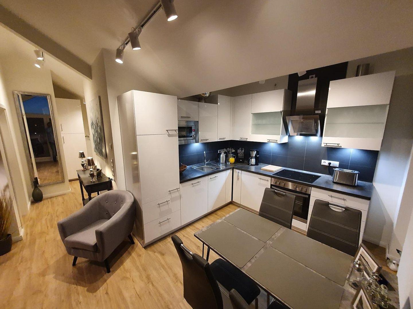 Eine hochwertige Einbauküche, die die besondere Höhe der Wände nutzt, stellt Ihnen jeden Kochkomfort, auch im Urlaub, zur Verfügung. Induktionsherd, Kühlschrank, Geschirrspülmaschine, Mikrowelle, Wasserkocher, Toaster, verglaste Schränke, Markengläser (Sekt, Weißwein, Rotwein, Trinkgläser), Markengeschirr Markenbesteck, Töpfe und Pfannen in jeder Größe sind vorhanden. Die Sitzecke in der offenen Küche bietet Platz für vier Personen.