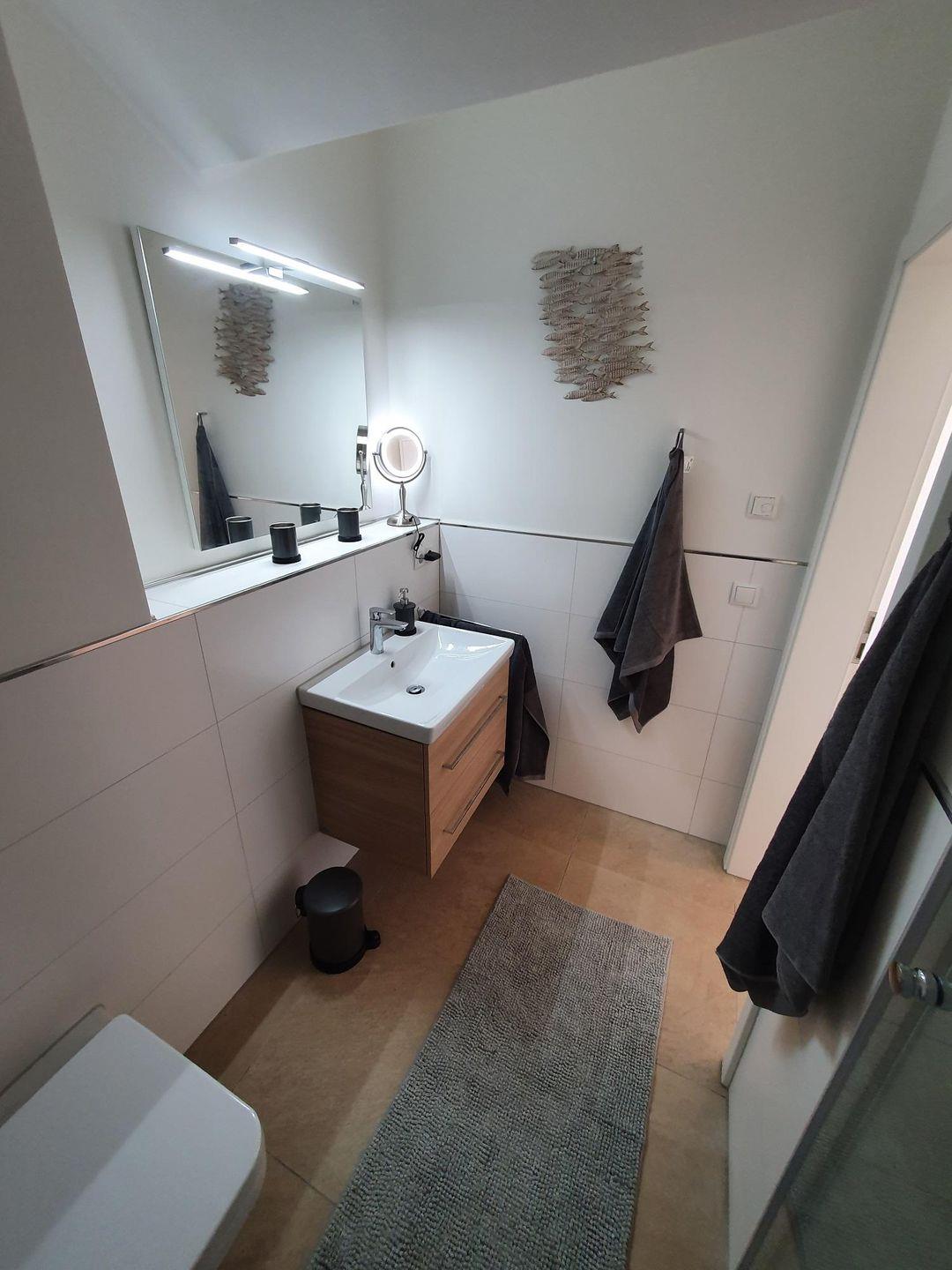 Das großzügige Bad bietet eine große Dusche, Designwaschbecken, Schminkspiegel, Fön und ausreichend Abstellfläche für Ihre Badutensilien.