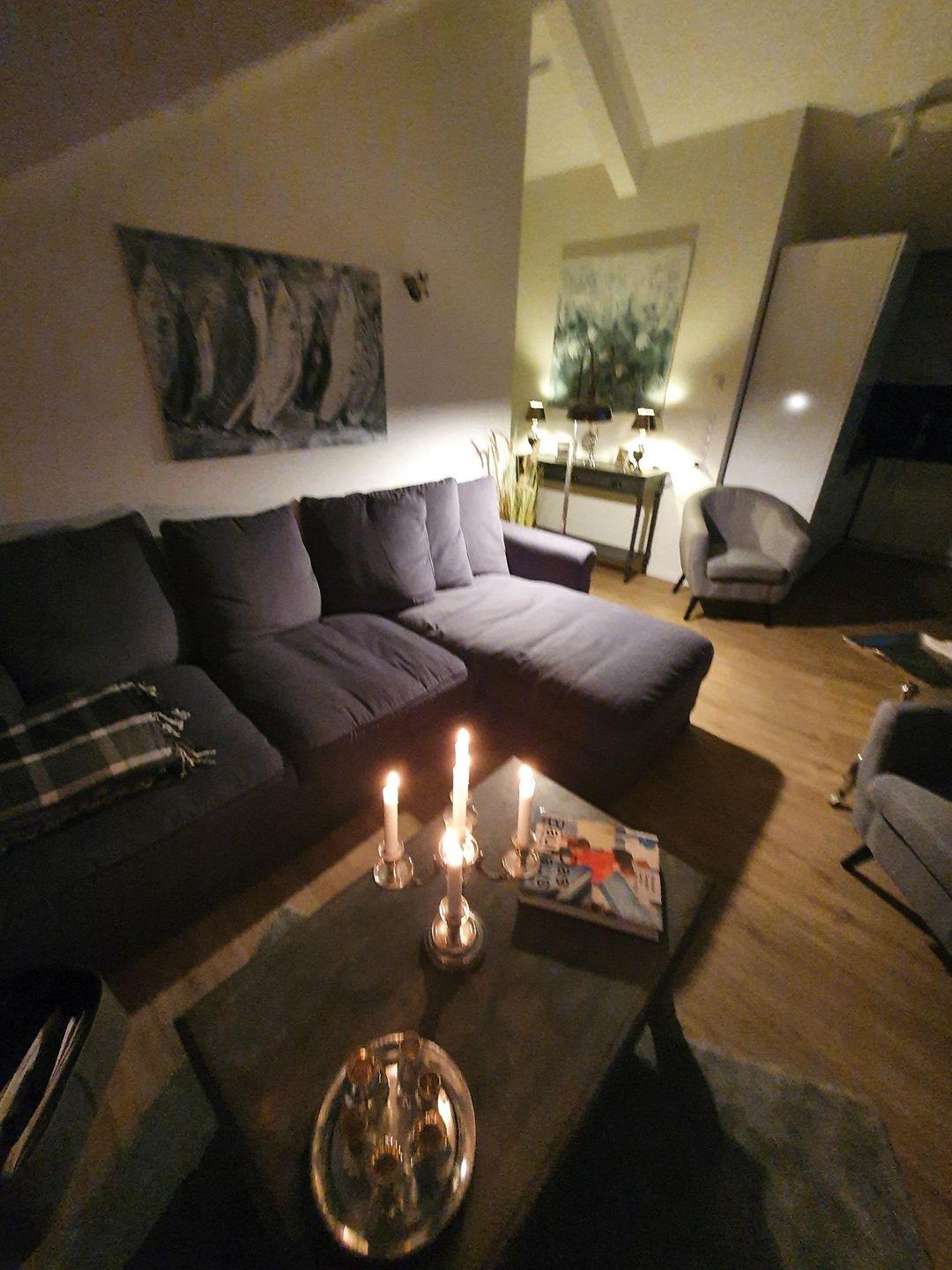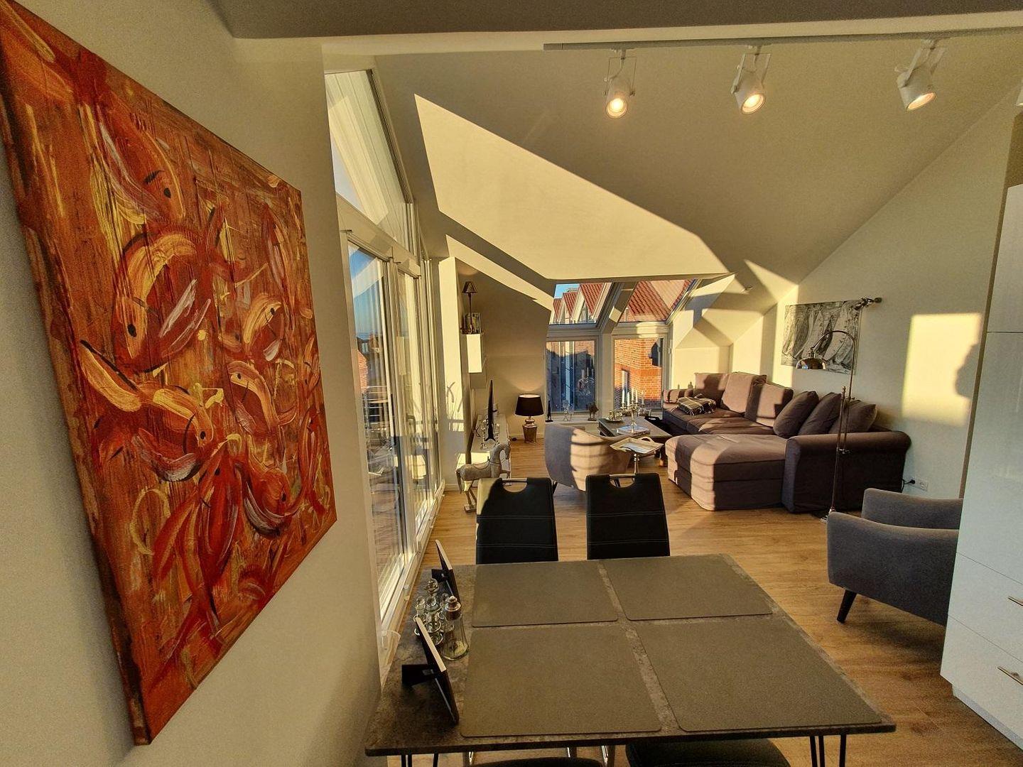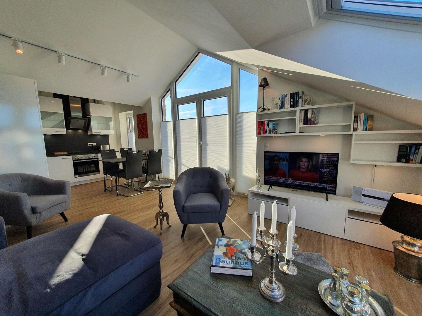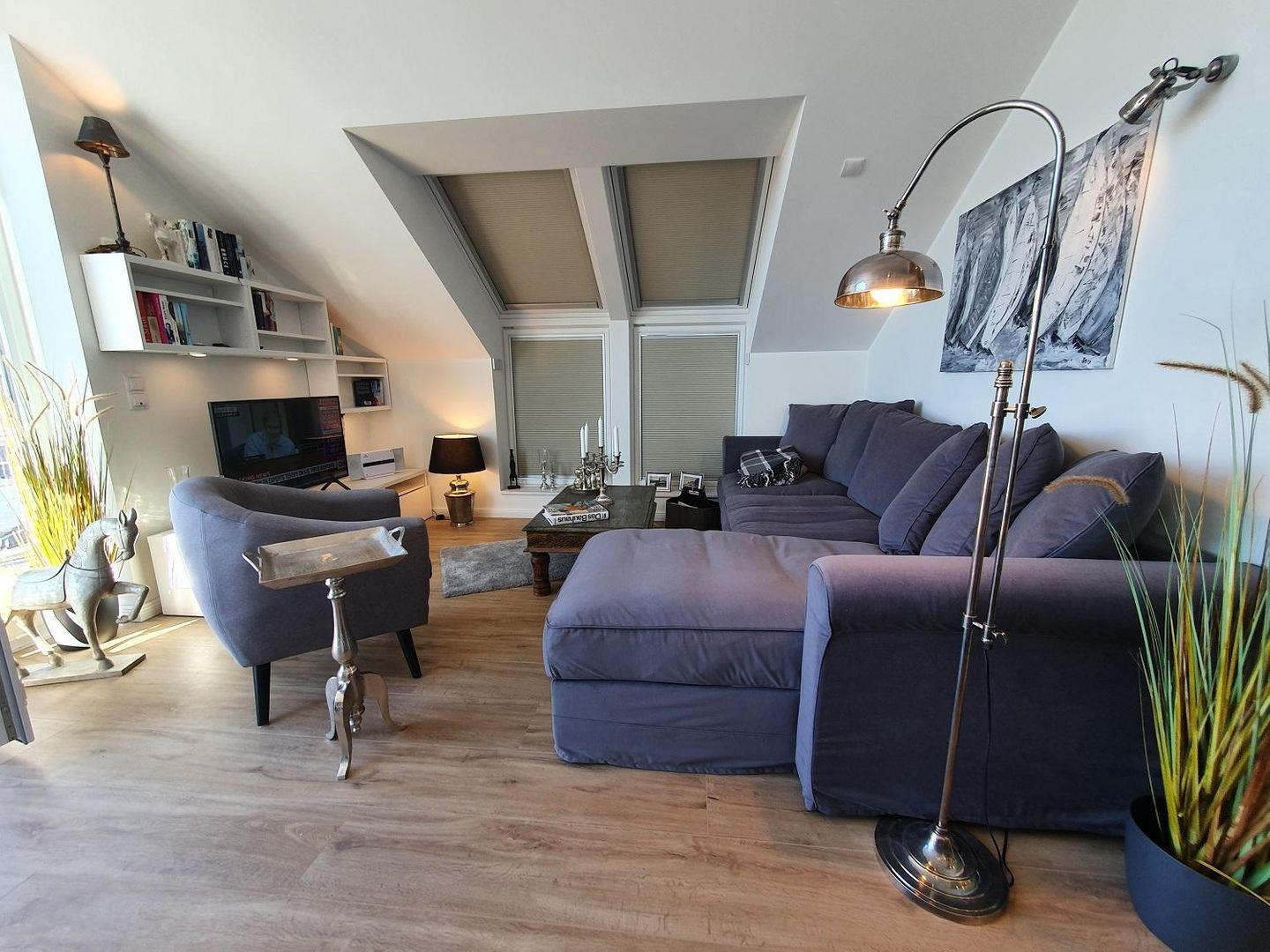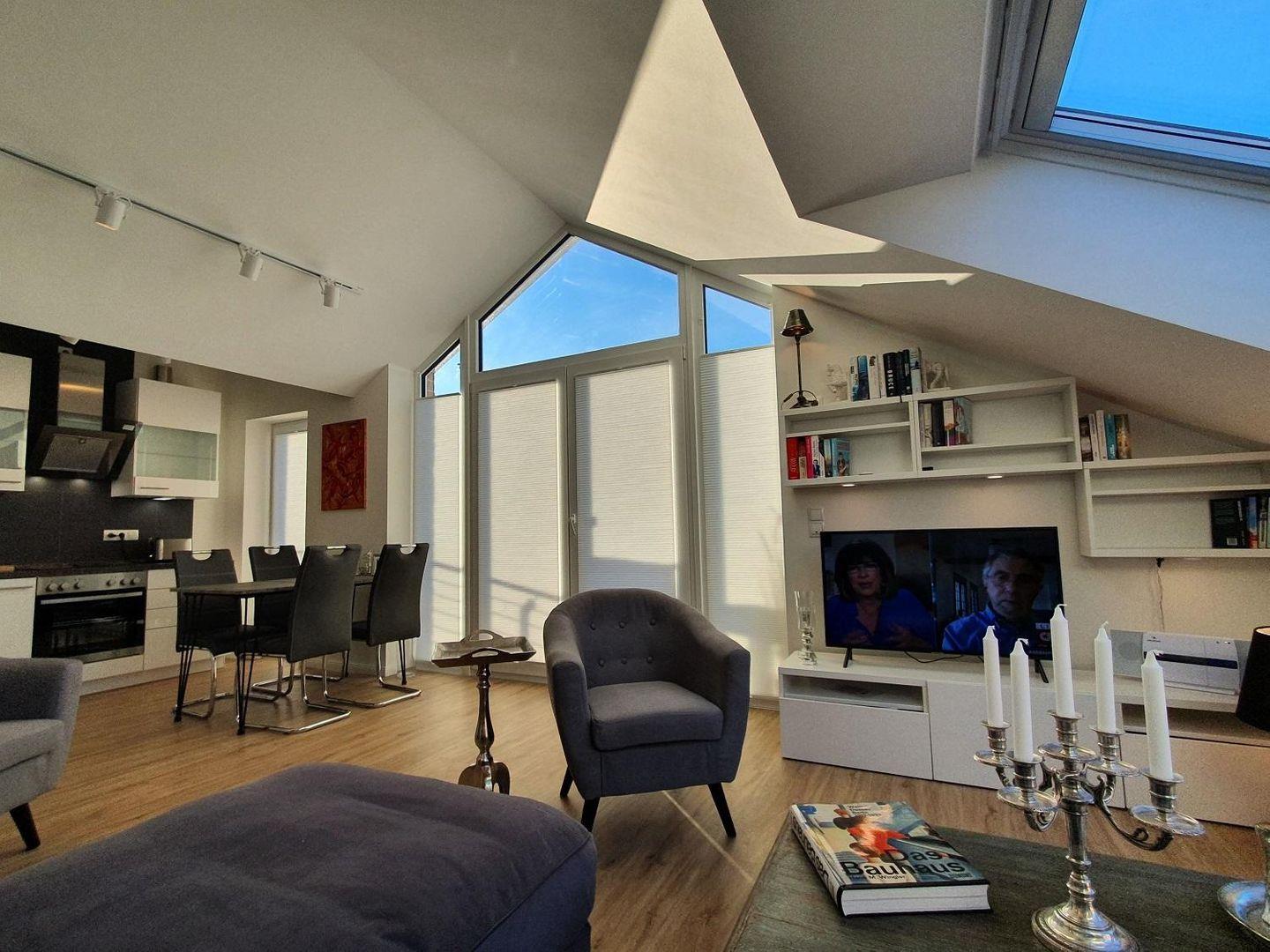 Die Töne der Wohnung sind in den modernen Farben Grau, Sand und Weiß gehalten. Zwölf Studiostrahler illuminieren die Wohnung hell und unterstützen das typische Studioambiente. Zahlreiche Lampen in Antiksilber und gemütliche Standlampen sorgen für jede gewünschte Stimmung. Selbstverständlich ist die Wohnung komplett zu schattieren. Elektrisch bedienbare Plissees im Schlaf- und im Wohnzimmer und helle Plissees an allen anderen Fenstern schützen Sie vor Sonneneinstrahlung und schirmen die Wohnung, wenn gewünscht, blickdicht ab. Die schrägen Dachfenster sind elektrisch zu öffnen, ein Regenwächter schließt sie bei Abwesenheit.