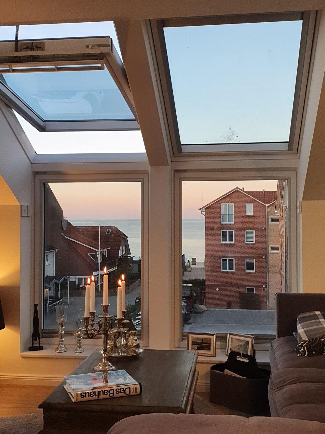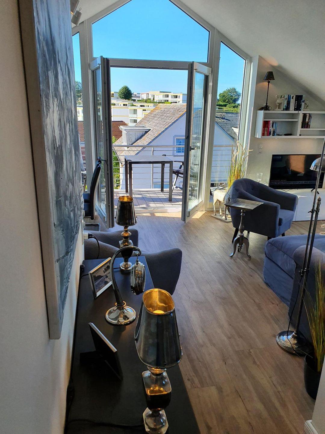 Fühlen Sie sich wohl in Ihrem Wohnzimmer mit Blick auf die Ostsee. Genießen Sie auf dem gemütlichen grauen Sofa einen Fernsehabend oder schauen Sie sich aus den großen Studiofenstern den einmaligen Sonnenuntergang über der Hohwachter Bucht an. Hier sind alle Möbel aufeinander abgestimmt. Vom kleinen grauen Cocktailsessel mit antiksilbernen Beistelltisch, bis zum handgefertigten antiken Wohnzimmertisch. Vom beleuchteten Lowboard über den ledernen Zeitungshalter, bis zur antiksilbernen Leselampe. Selbstverständlich sind alle Bilder in der Wohnung handgemalte Originale oder Originalfotografien.
