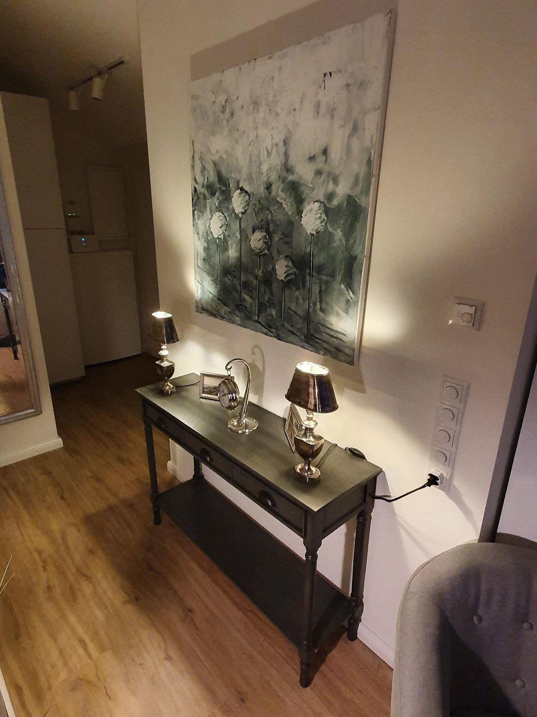 Im Flur befindet sich neben der wunderschönen Konsole mit Antiklampen, hohem Spiegel und Originalgemälde von Ante Potocnjak der große Besenschrank. Bügeleisen, Bügelbrett, Staubsauger, Wäscheständer etc. Alles vorhanden!