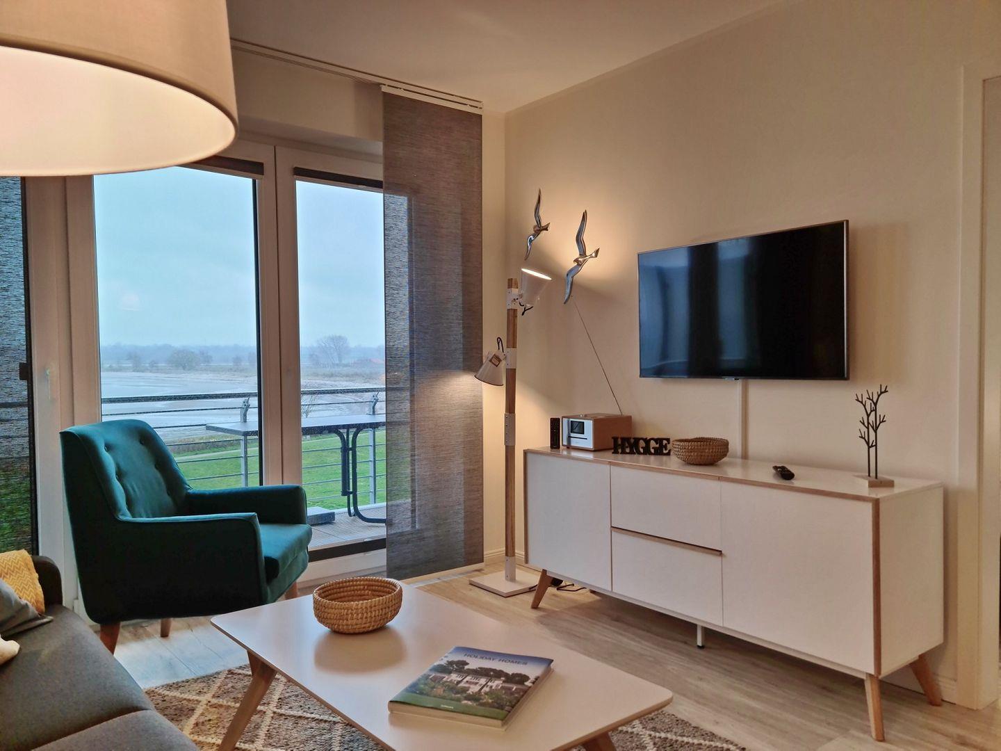 Von dem Wohnzimmer, welches mit innovativen und modern designten Lichtern erstrahlt, führen die großen Türen aus Glas auf den Balkon mit einzigartigem Ausblick auf die Hohwachter Bucht. Mit Leichtigkeit kann man das Naturschutzgebiet Sehlendorfer Binnensee, sowie die Schönheit der Ostsee erblicken.
