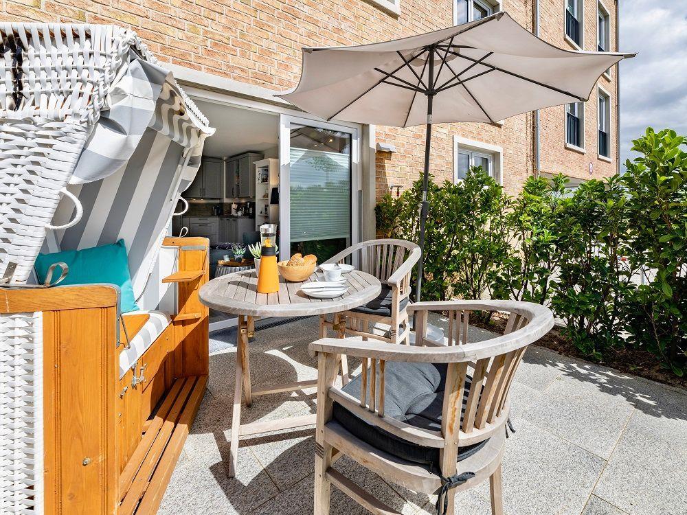 • Süd-West-Terrasse mit Strandkorb, Gartenmöbeln & Sonnenschirm