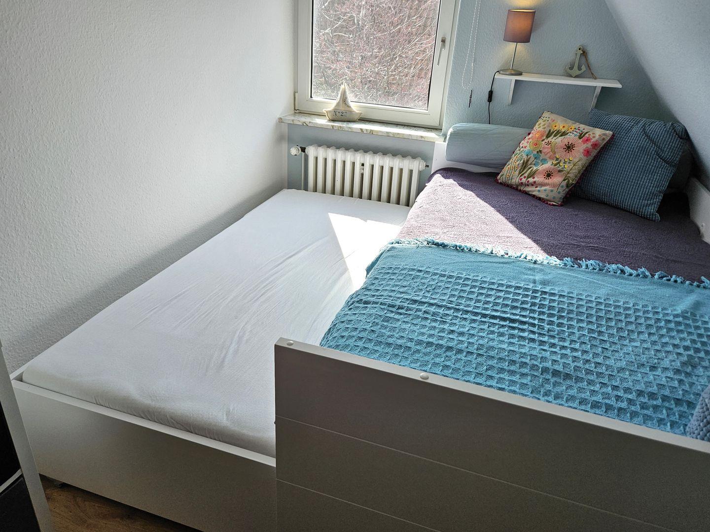 Zu beginn des Flures befinden sich die Schlafzimmer. Hier befinden sich in 3 separaten Räumen 6 Schlafplätze. Davon ist ein Schlafzimmer mit einem Doppelbett (Boxspringbett) ausgestattet. In dem zweiten Schlafzimmer finden Sie zwei alleinstehende Einzelbetten. Das dritte Schlafzimmer verfügt über ein Ausziehbett, dieses ist unausgezogen 120x200 cm groß, sobald man das Bett auszieht kommt eine weitere Liegefläche hinzu (90x200 cm). Alle Schlafzimmer sind mit einem eigenem Kleiderschrank versehen, diese bieten reichlich Stauraum.