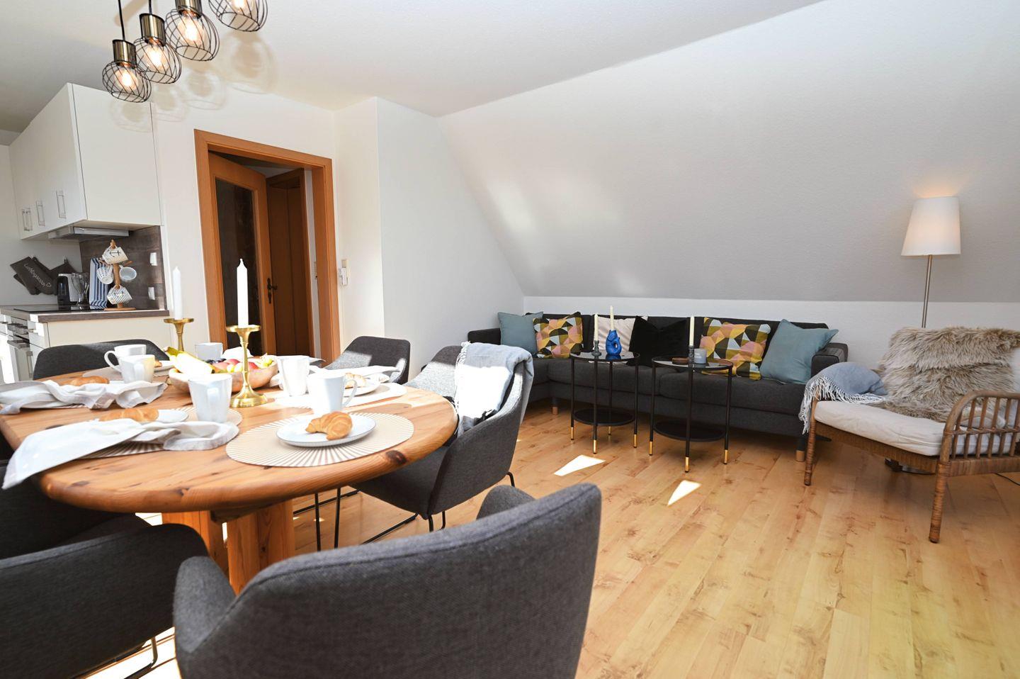 Der großzügige Wohn- und Essbereich, der für 6 Personen Platz bietet grenzt an die offene Küche. Die Räumlichkeiten sind liebevoll eingerichtet und punkten mit viel Komfort und Gemütlichkeit. Durch den Smart-TV lassen sich hier auch am Abend oder bei Schietwetter schöne und gemütliche Stunden verbringen. Die Balkone sind durch große Fenster zu erreichen, die reichlich Tageslicht in den Raum dringen lassen. Der Süd- und Westbalkon lädt vor allem im Sommer mit Mobiliar zum Verweilen ein.