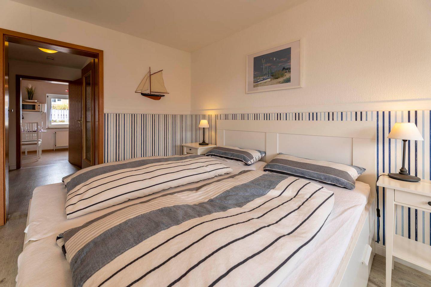 Unsere 2-Zimmer-Ferienwohnung „Strandperle“ für 2 Personen ist im skandinavischen Stil mit hellen Möbeln ausgestattet und empfängt Sie mit einem Wohn-/ Schlafzimmer mit einem komfortablen Doppelbett (180x200), einem großzügigen Schrank und einer gemütlichen Sitzecke, von der aus Sie den direkten Ausblick auf das Meer genießen können.