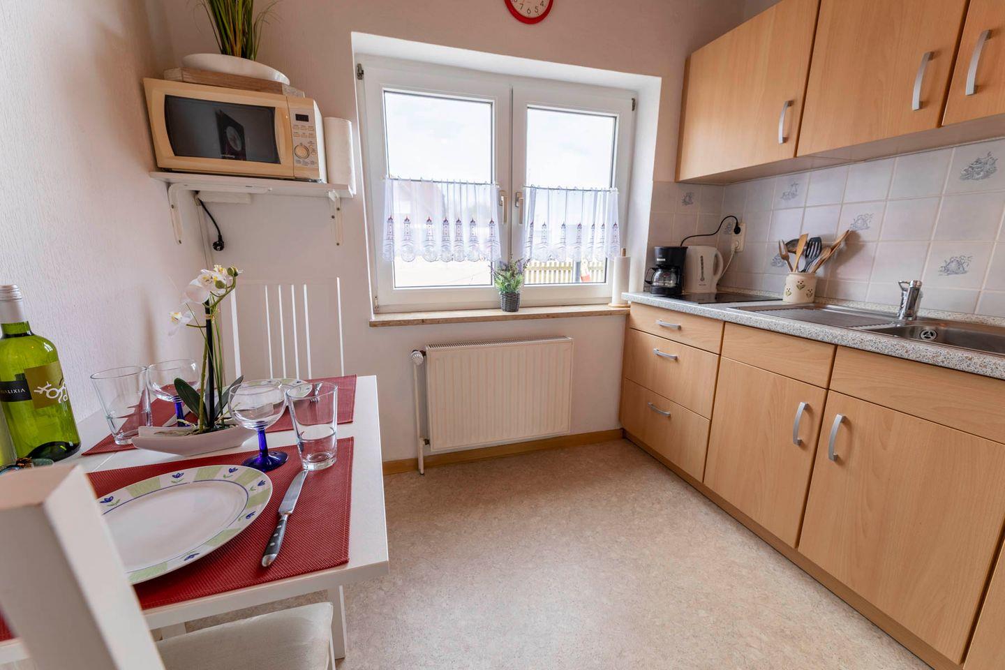 In der an den Wohn-/Schlafbereich angrenzenden, mit Mikrowellengrill und 2-Plattenherd vollständig ausgestatteten Küche befindet sich ebenfalls noch eine Sitzgelegenheit zum Essen. Und wenn Sie mal nicht kochen möchten – in der näheren Umgebung finden Sie verschiedenste kulinarische Angebote. Ein Duschbad komplettiert die Wohnung.