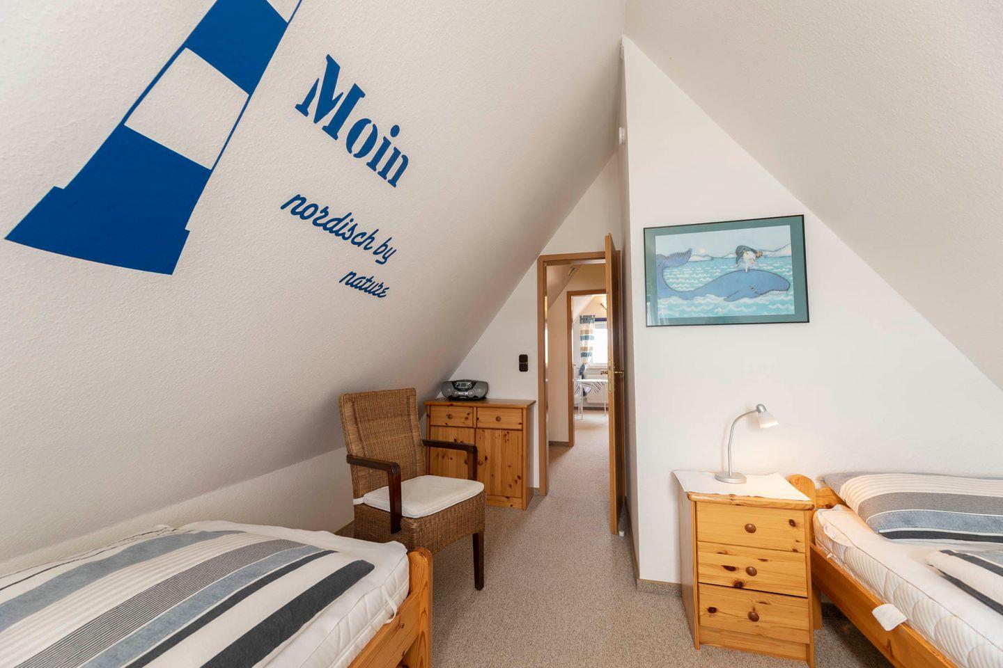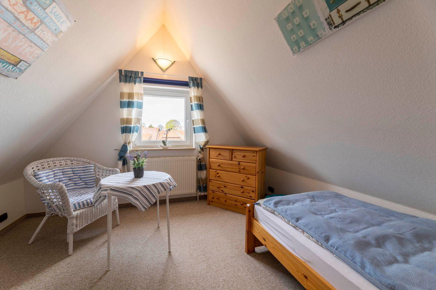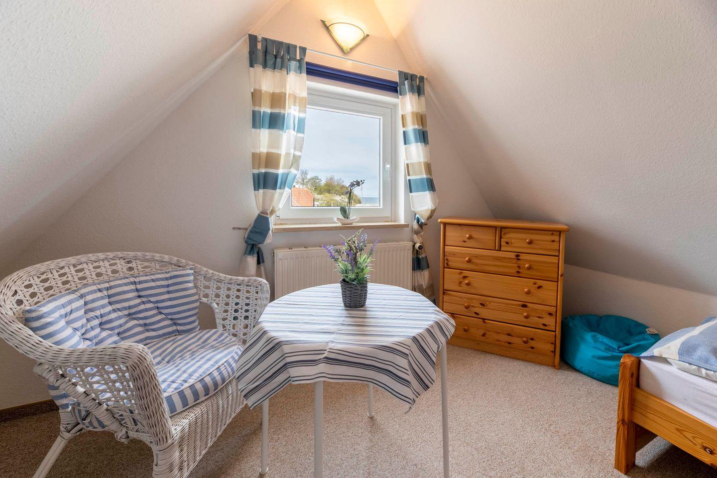 Unter dem Dach, über eine schmale Treppe erreichbar - für Familien mit kleineren Kindern sind alle Treppen mit Treppengittern zu sichern - befinden sich zwei weitere, mit hellen Holzmöbeln eingerichtete Schlafzimmer mit jeweils zwei Betten bzw. einem Einzelbett, beide mit fantastischen Blick über die Ostsee. Beide Zimmer teilen sich ein eigenes Duschbad. Eine gemütliche Leselounge zwischen den Zimmern ermöglicht es, auch hier einen ruhigen Rückzugsort zu finden.